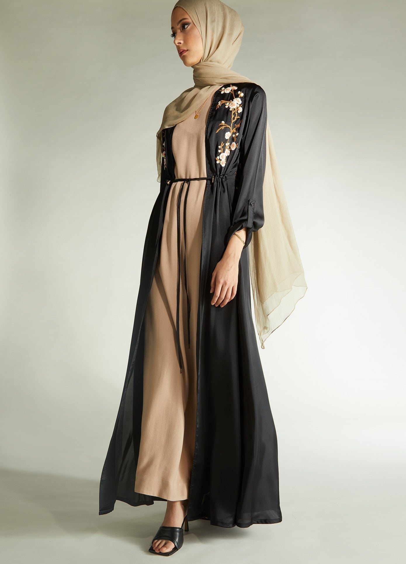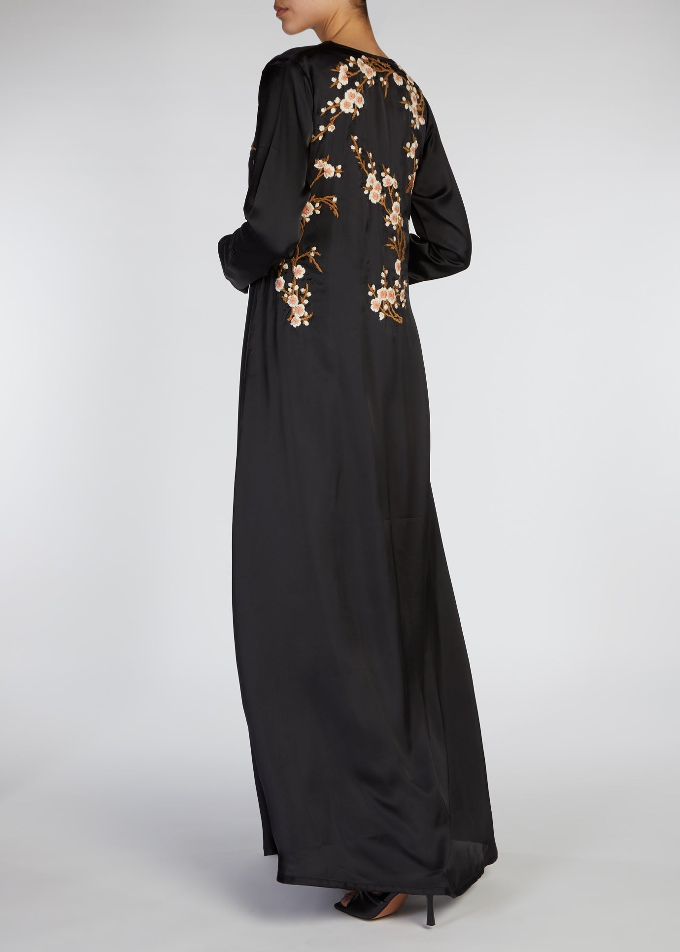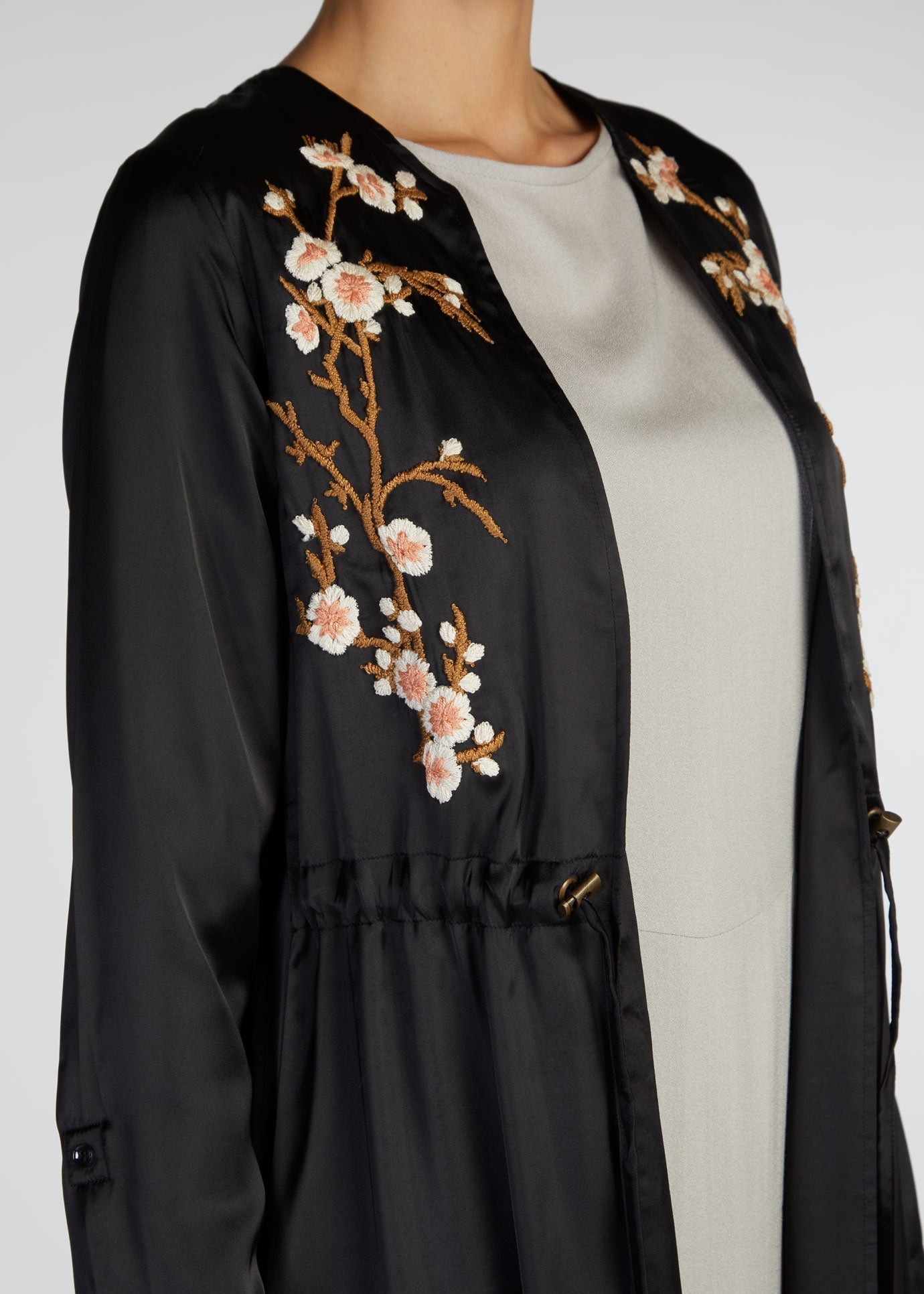 Frangipani Kimono is made from a soft satin fabric featuring beautiful floral embroidery on the back of the garment and front panels too. An elegant drawcord feature allows you to cinch the kimono in at the waist or simply leave open.