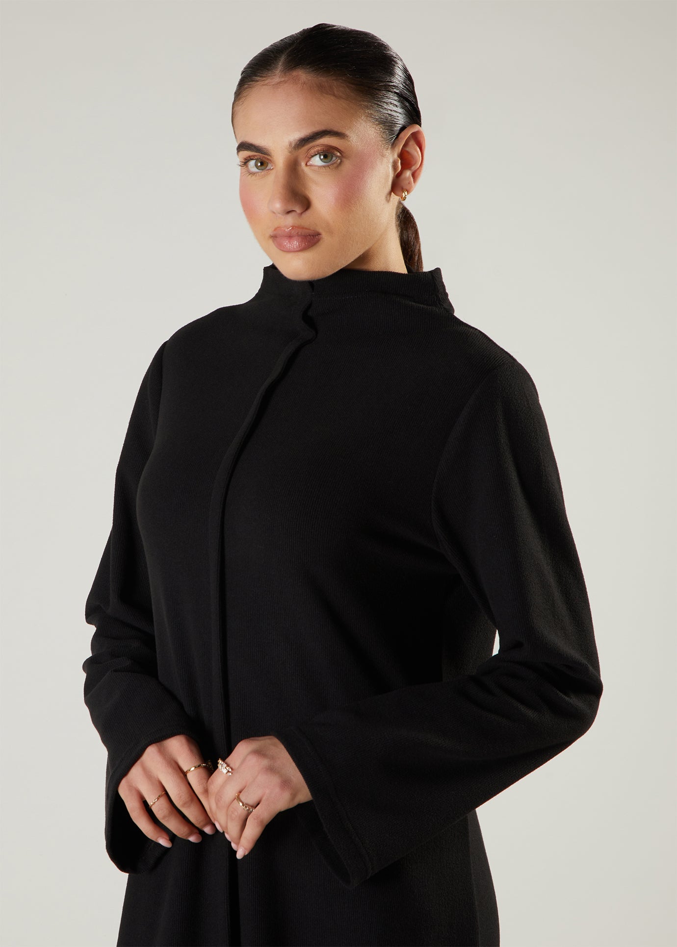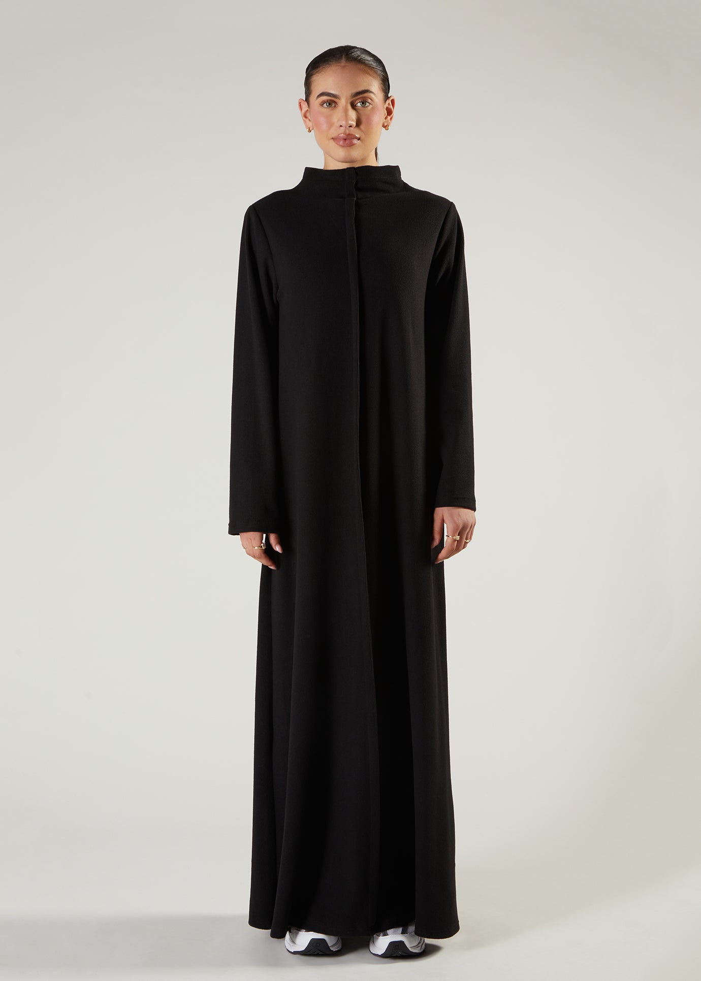 Abaya is made from a super soft almost fleece-like fabric with an A-line silhouette; it features a front seam and a low funnel neck style. Perfect for cooler days and evenings.