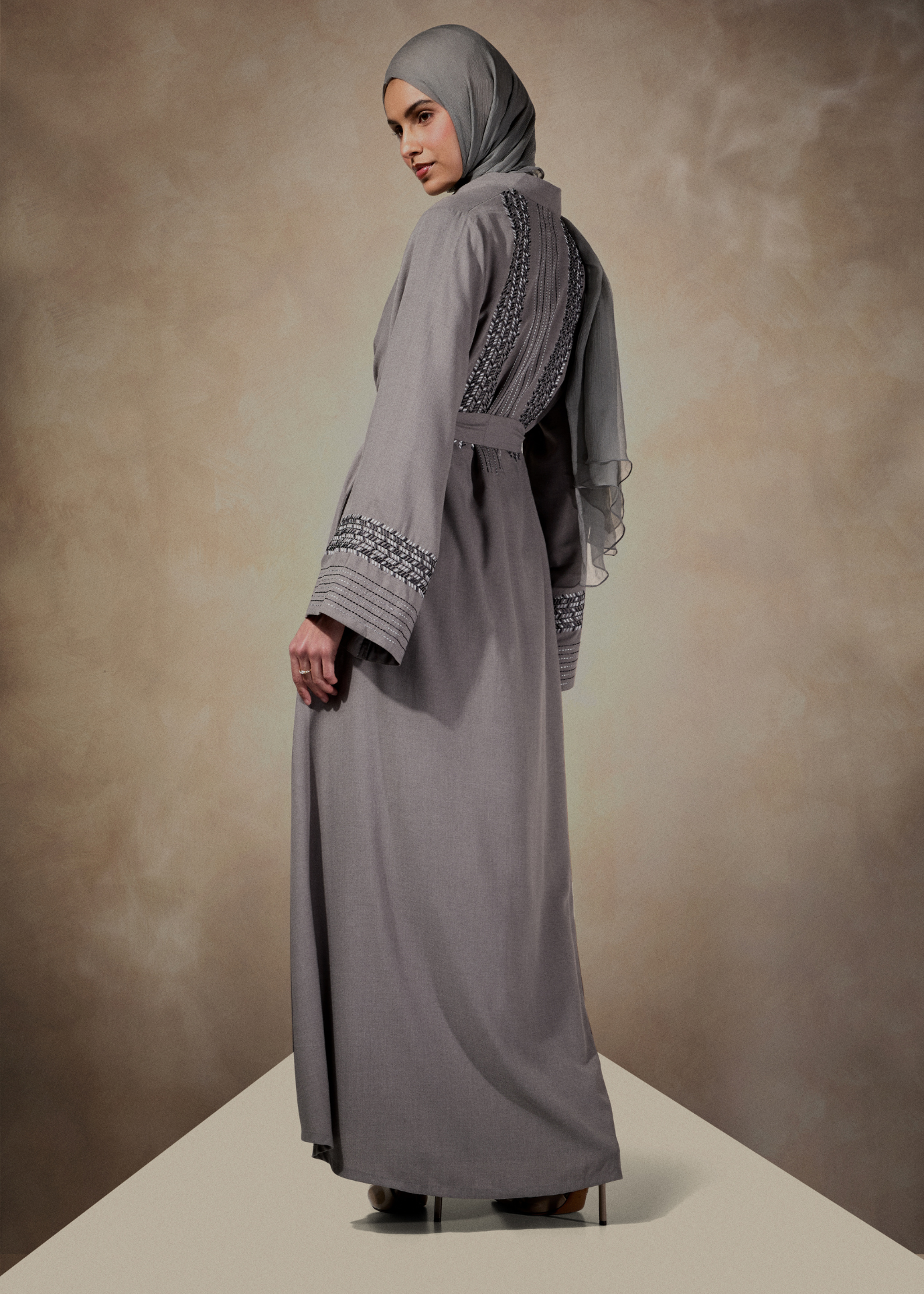 A boxy style kimono in a soft grey fabric featuring herringbone style embroidery on the back and cuffs. The tonal embroidery accentuates the outfit giving it a regal look and feel. Garment has a looser silhouette, but we recommend choosing your usual size.