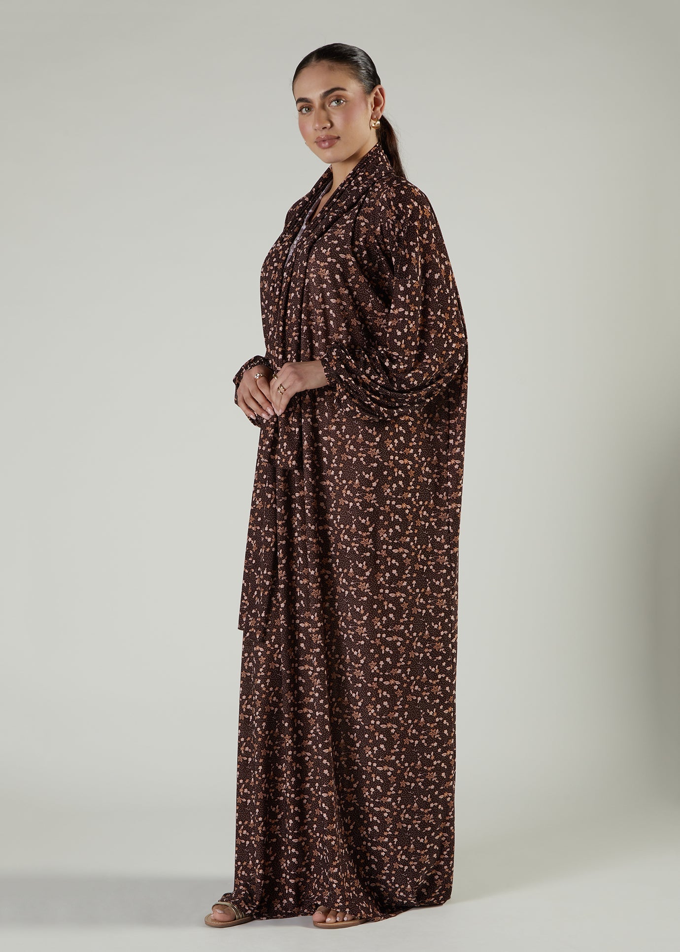 Ramadan ready prayer outfit, it features a loose silhouette with an attached scarf for ease.