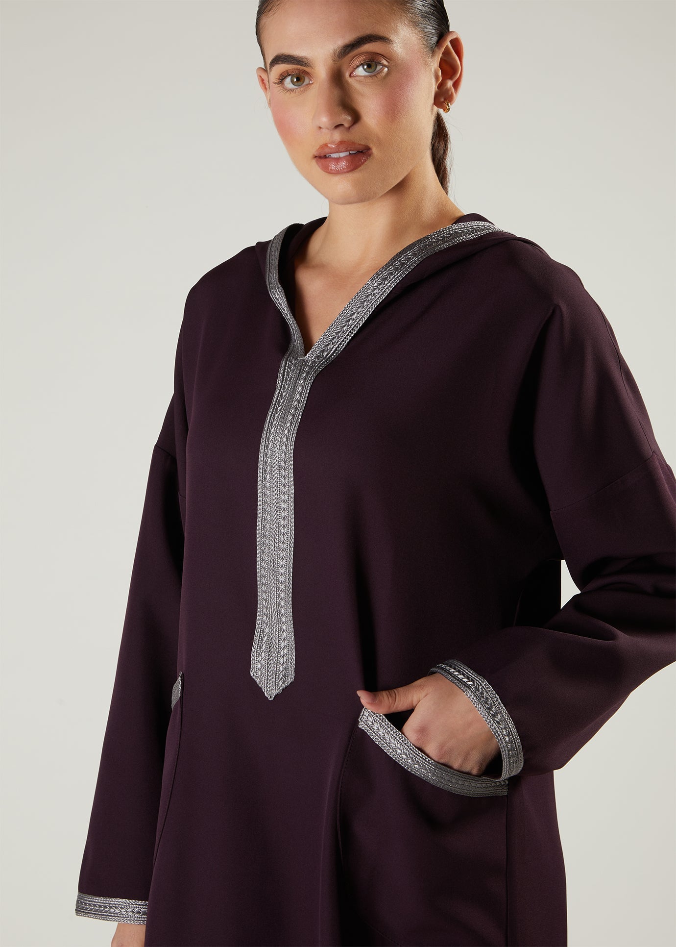 Embrace understated elegance with our Royal Plum Jalabiya, a hooded abaya designed for modern modest fashion. This piece features delicate lace detailing along the neckline and cuffs, adding a touch of refinement without compromising on comfort. The classic A-line silhouette flatters all figures while the practical pockets offer everyday functionality. Perfect for Ramadan gatherings or daily wear, this jalabiya combines timeless style with contemporary details that elevate your wardrobe effortlessly.