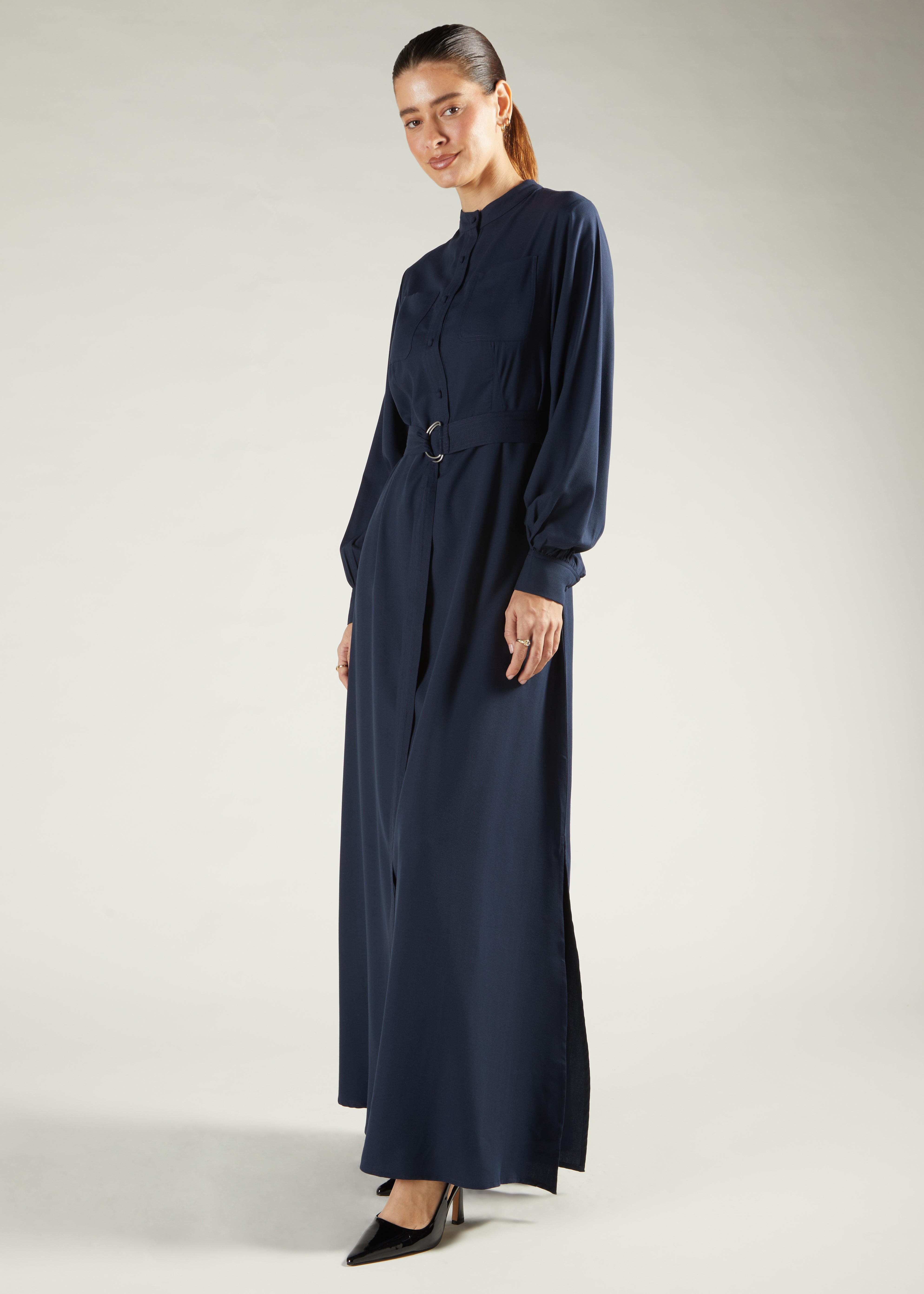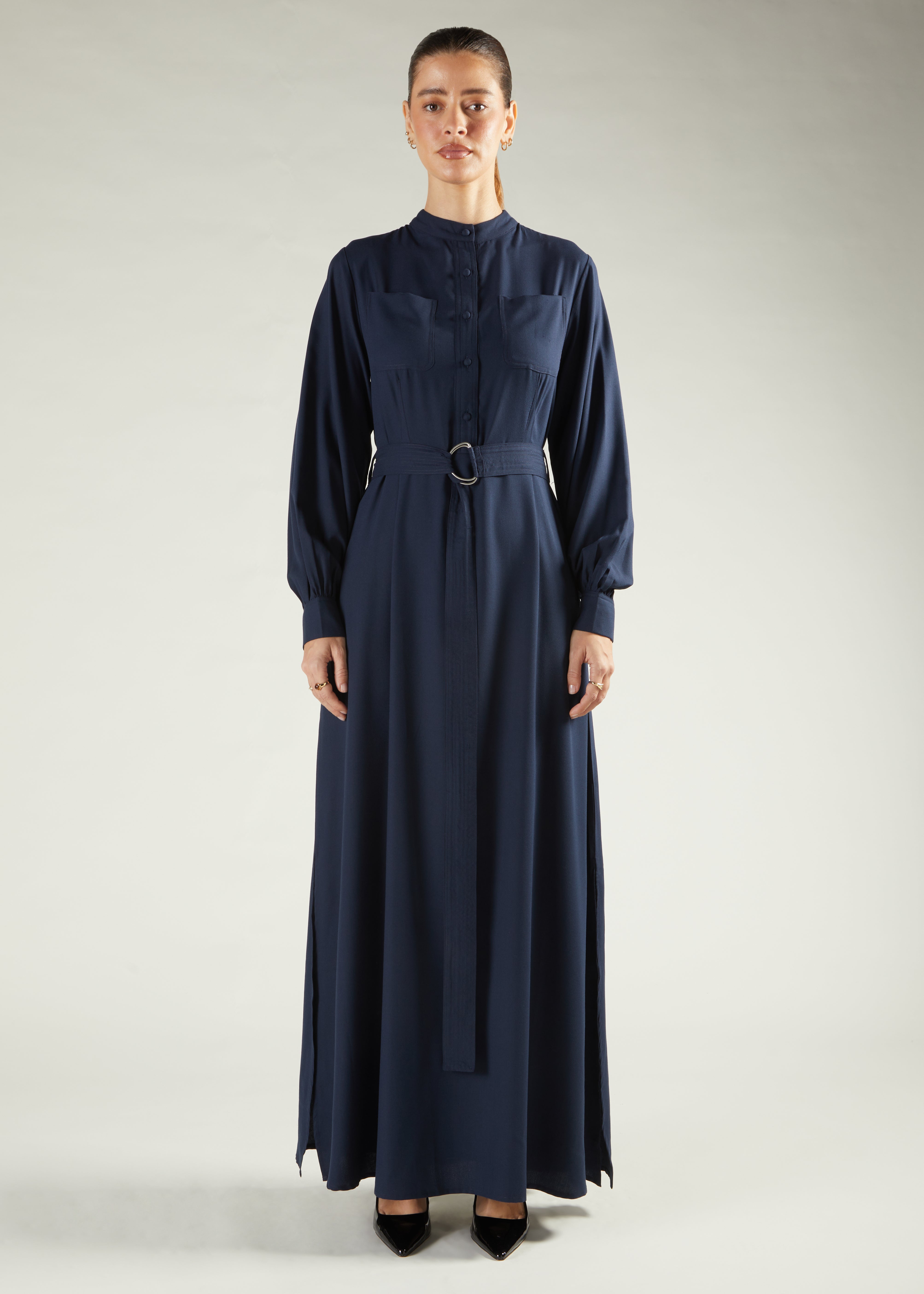 Maxi features utilitarian details and pockets with contrast stitching on the bodice, the maxi comes with a belt, or you can style without or your own. Designed with discreet side pockets, it has a structured look whilst the fabric is made from a soft fluid crepe material.