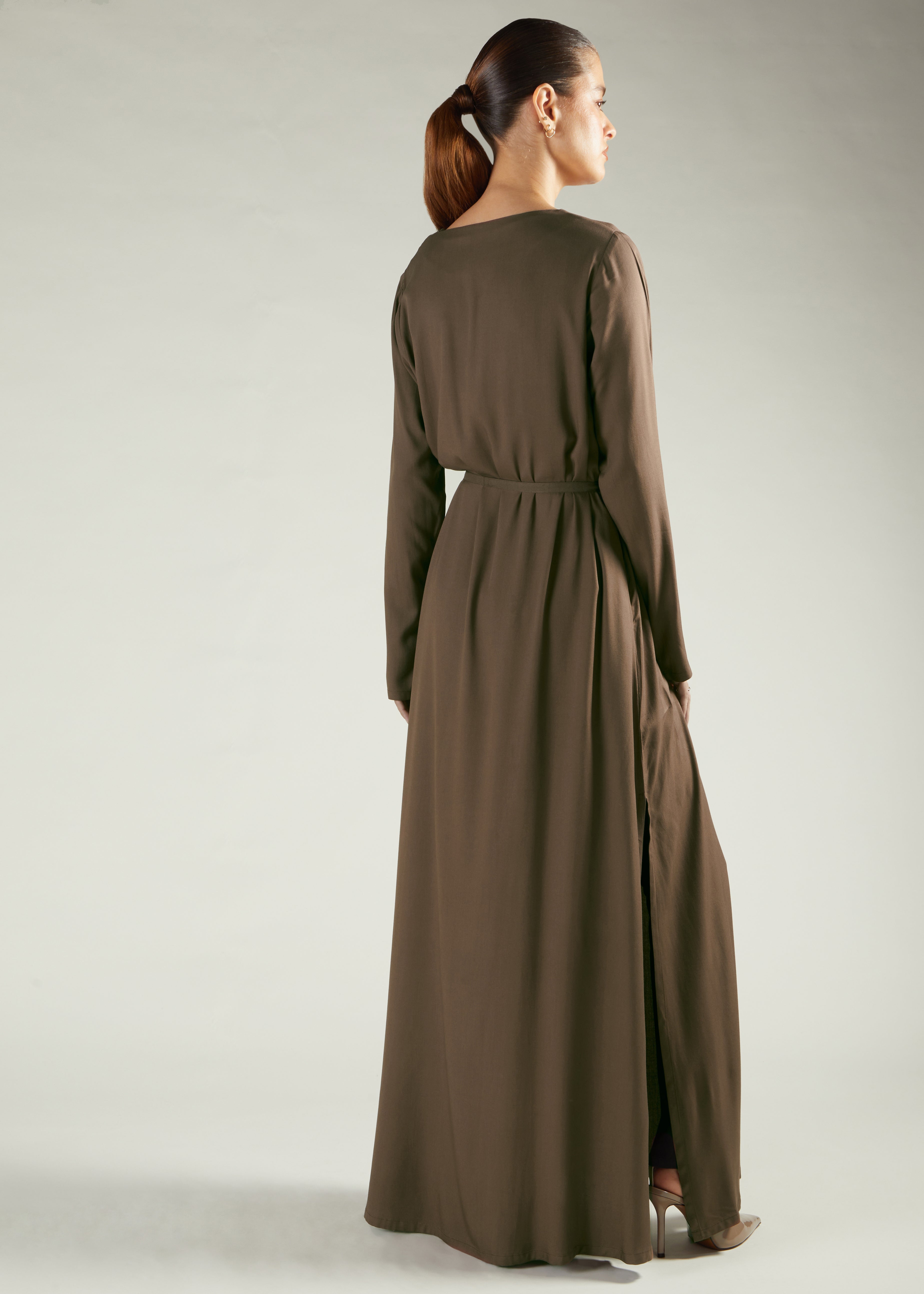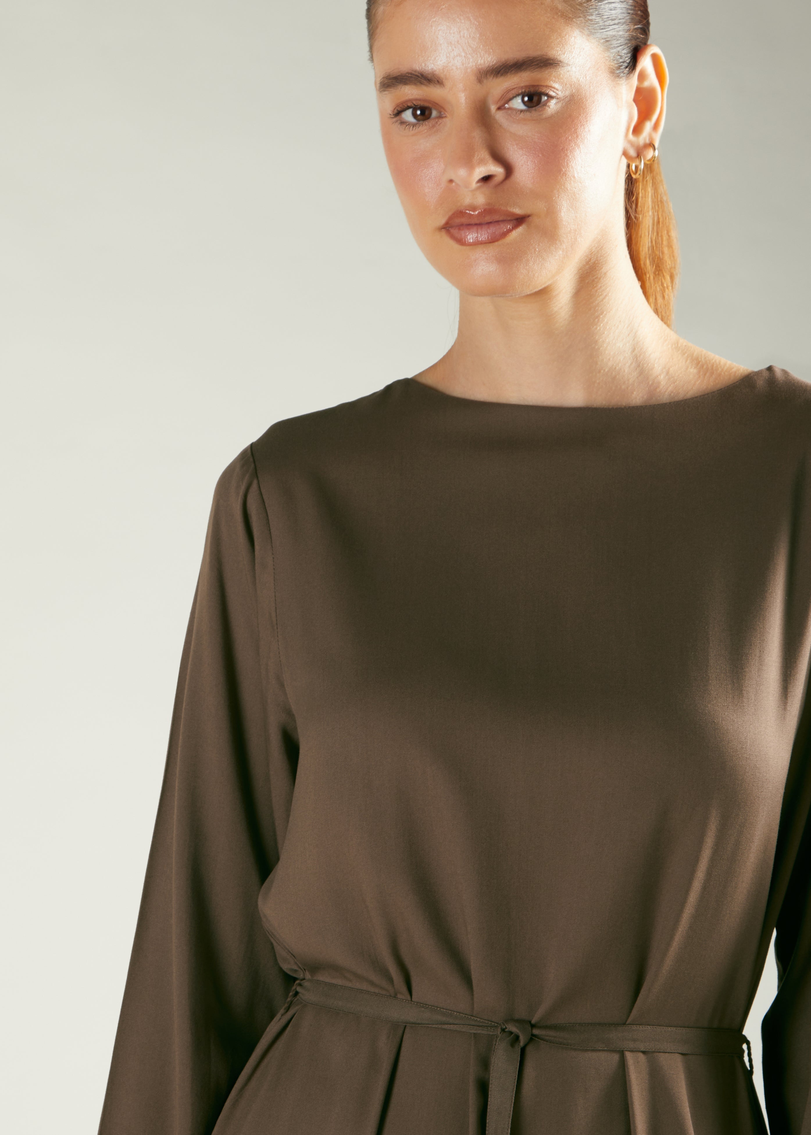 A-line Abaya in coffee brown. Made from soft, flowing fabric with a round neckline and thin belt to define your waist.