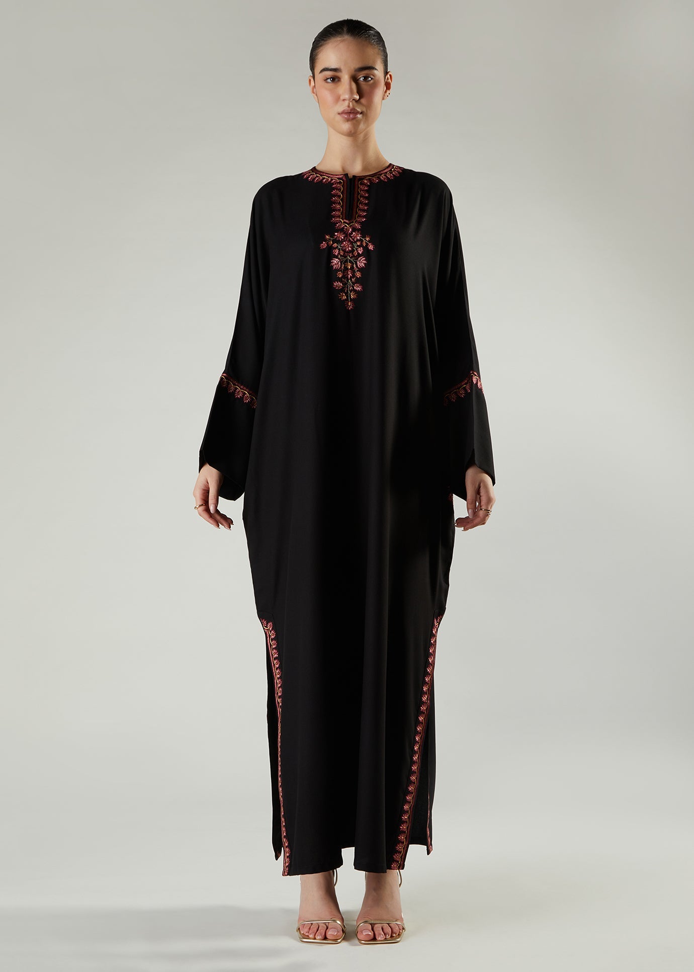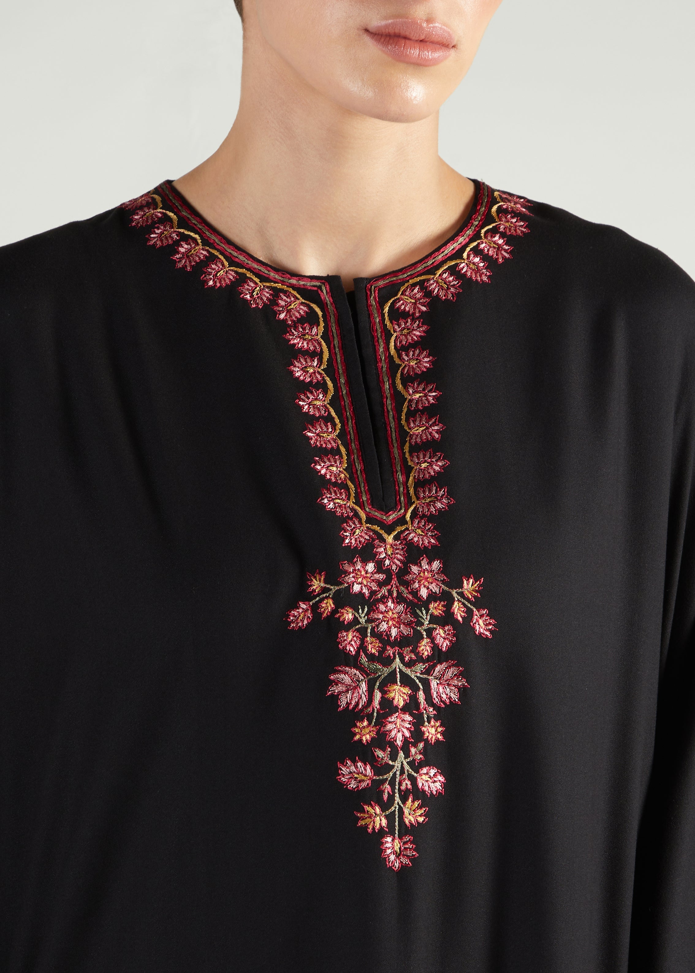 This Kaftan features pretty pink embroidery on this soft twill fabric, the embroidery is based on the bodice, cuffs as well as the mini side slits and outlining the pocket area. Comfortable, stylish and perfect for occasions.