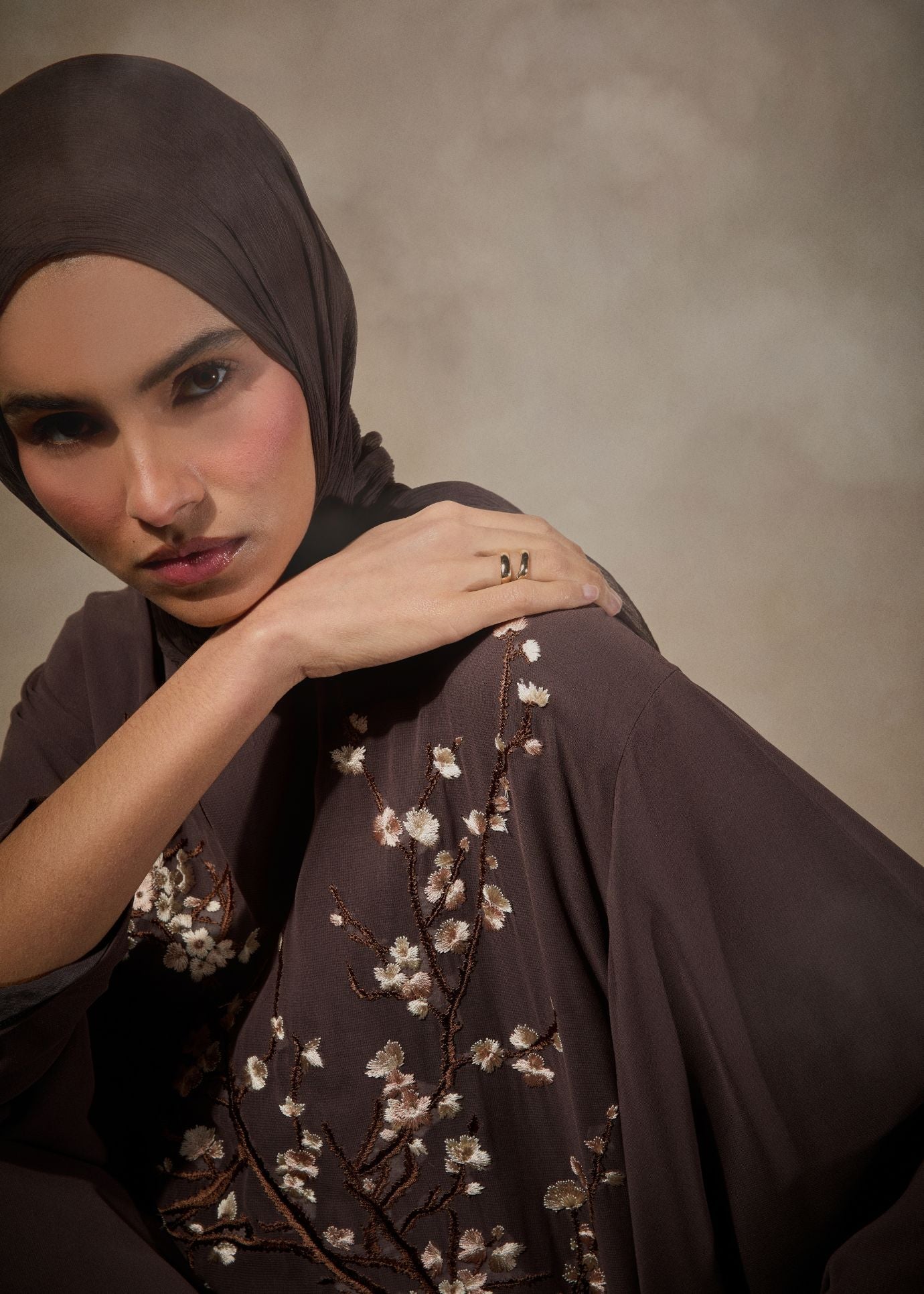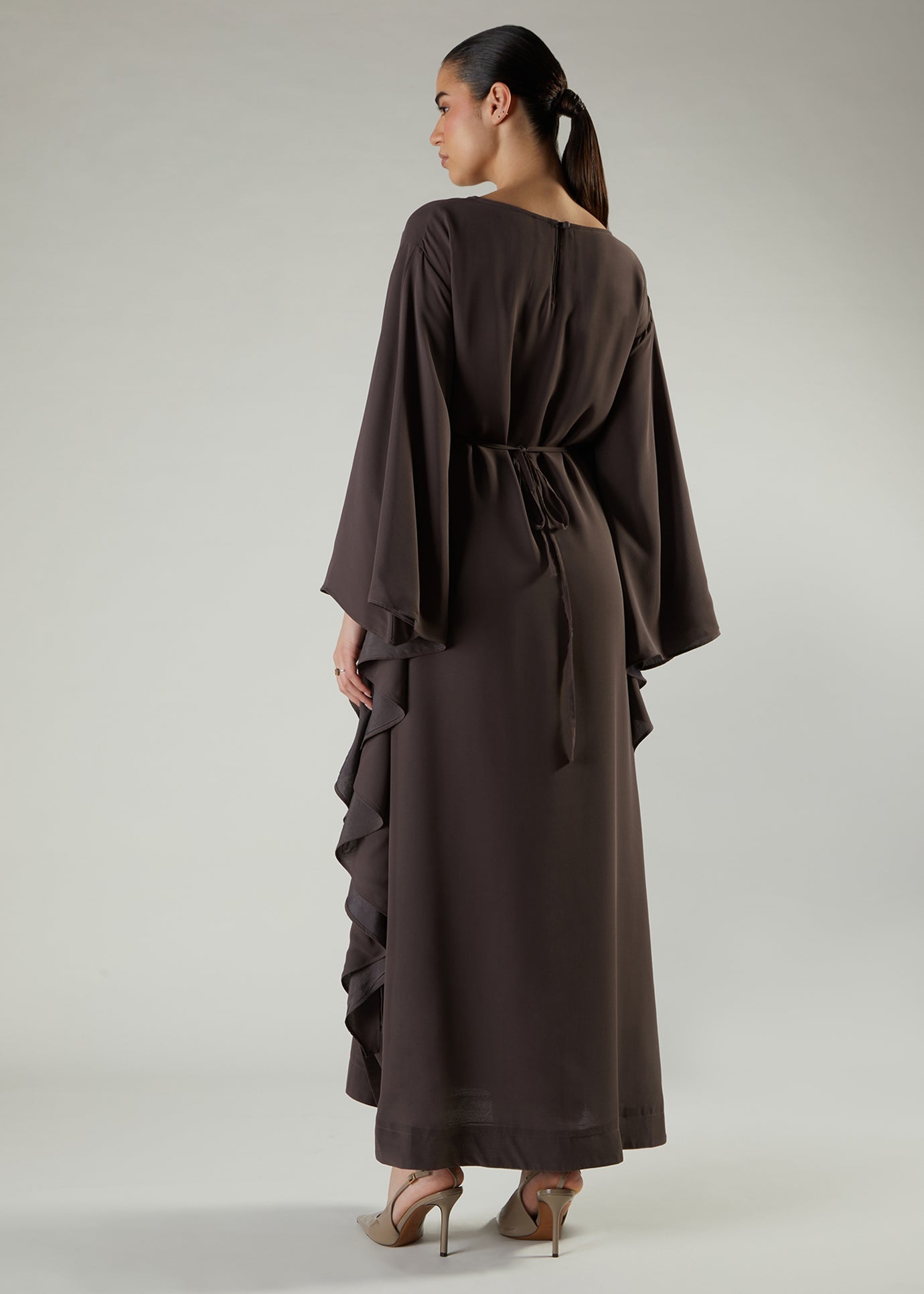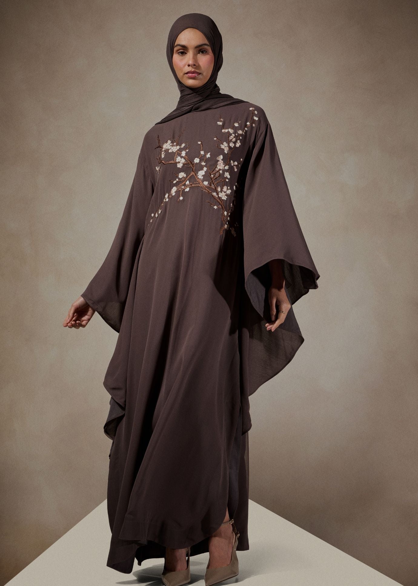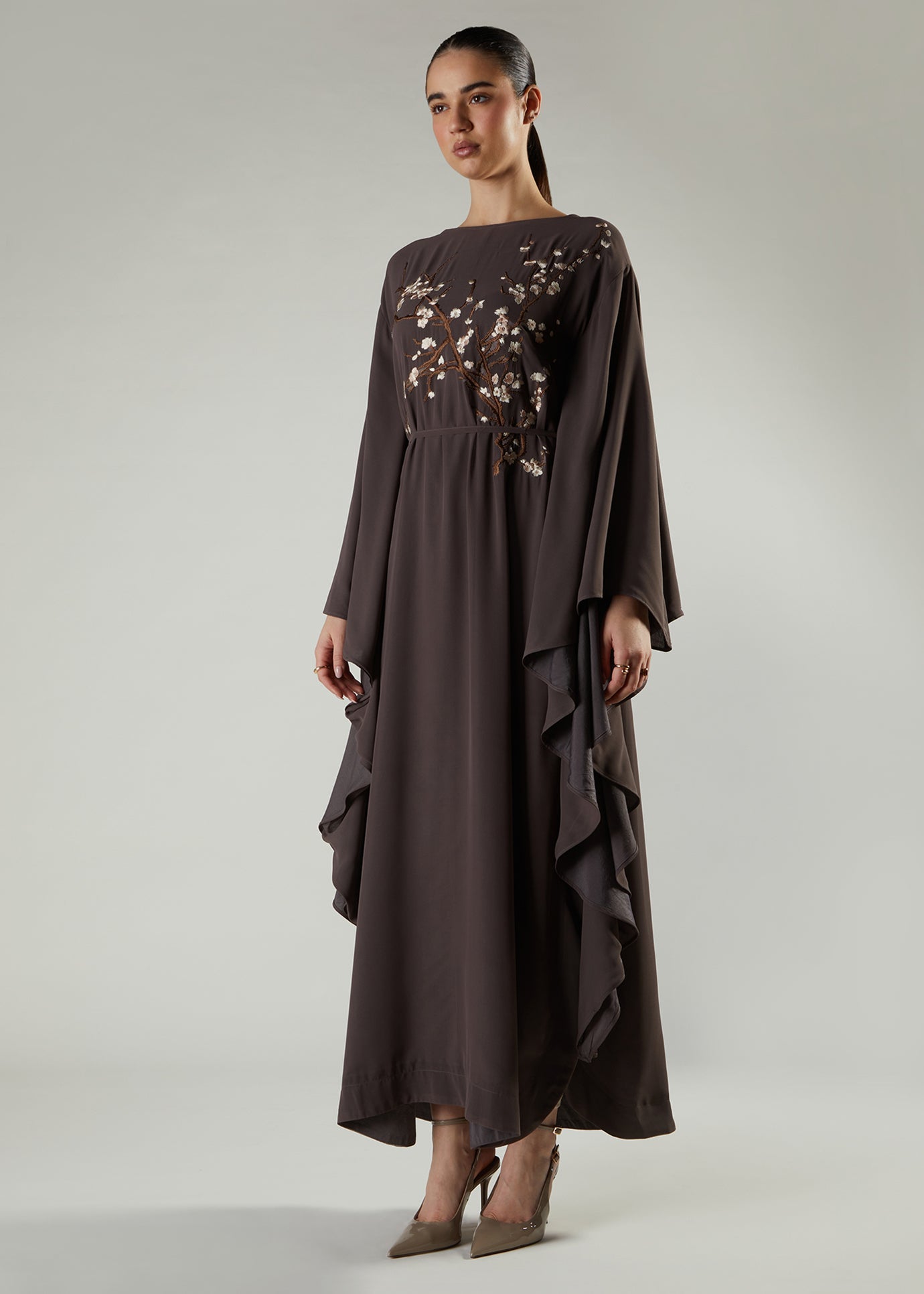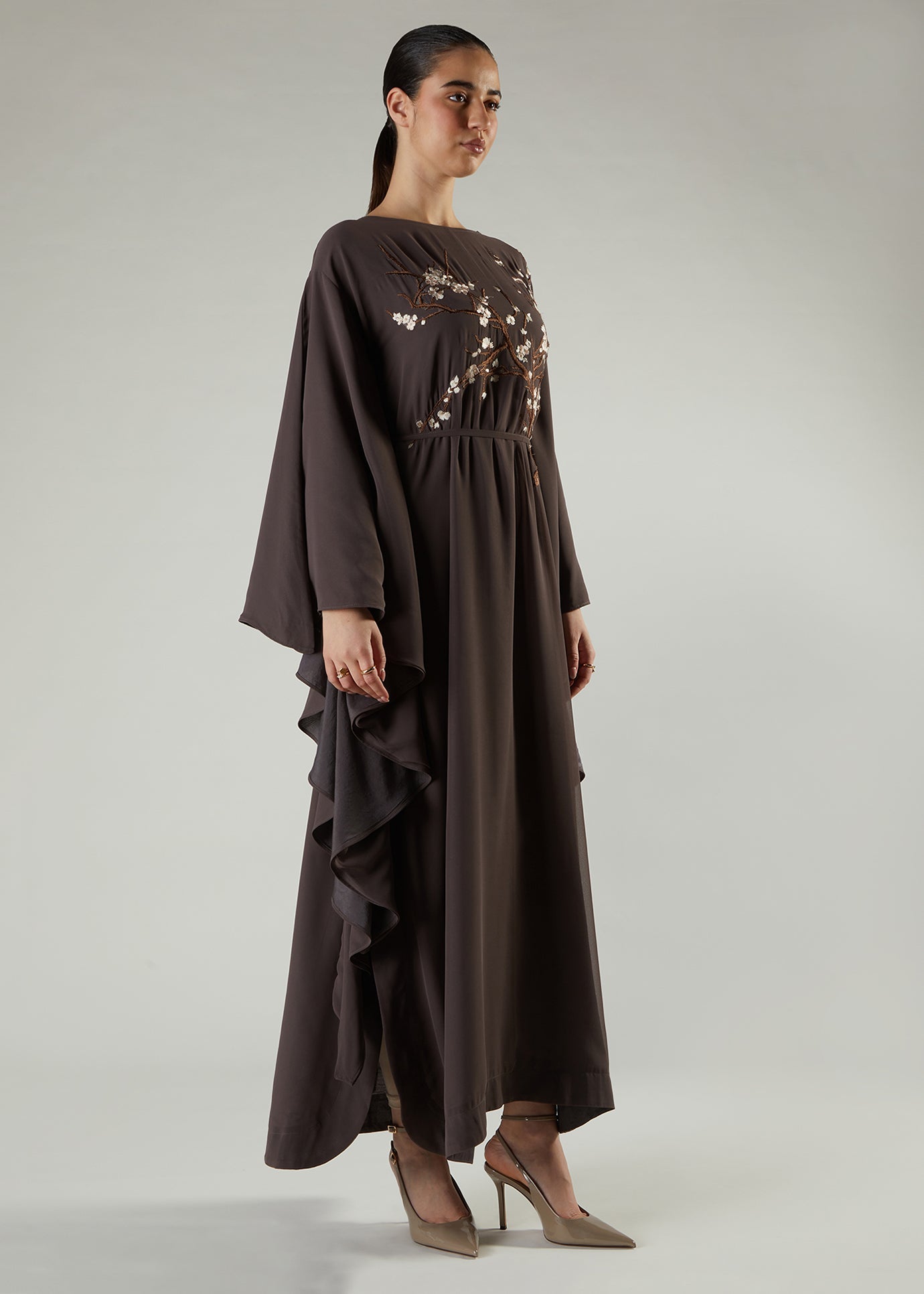 Beautifully embroidered Kaftan featuring delicate almond bloom motifs inspired by the beauty of spring blossom. The garment is made using a fluid crepe that's fully lined using 100% cotton lining for comfort. Kaftan has a modest silhouette a comes with a self-fabric belt that can be used without obscuring the beauty of the embroidery.