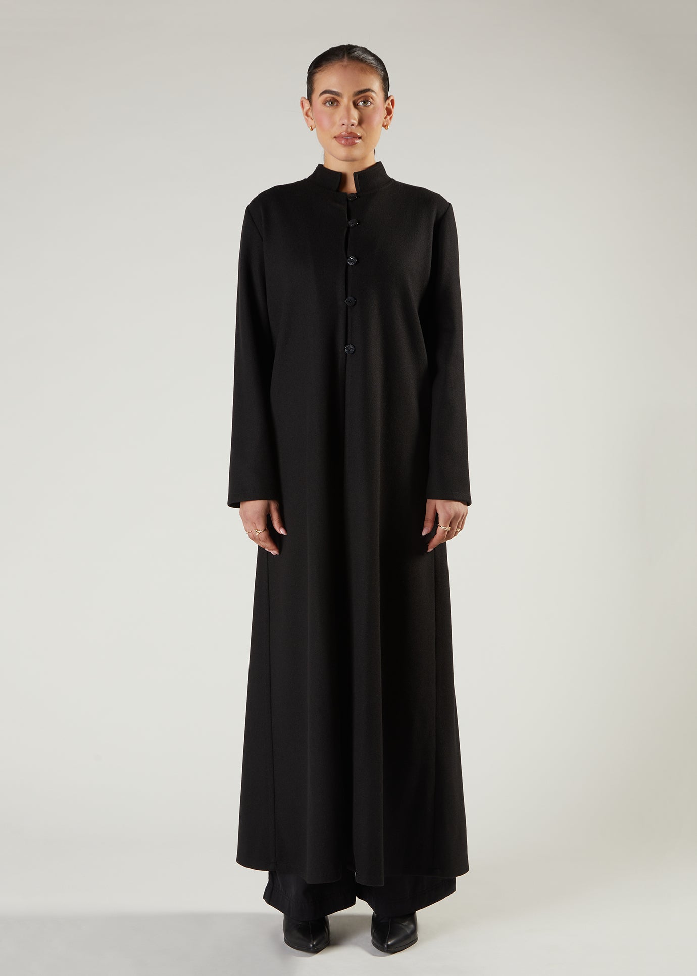 Made for a slightly slim silhouette. The coat has buttons that go down three quarters of the way, has a slit at the back and styling is perfect for layering over outfits and ideal for transitional weather.
