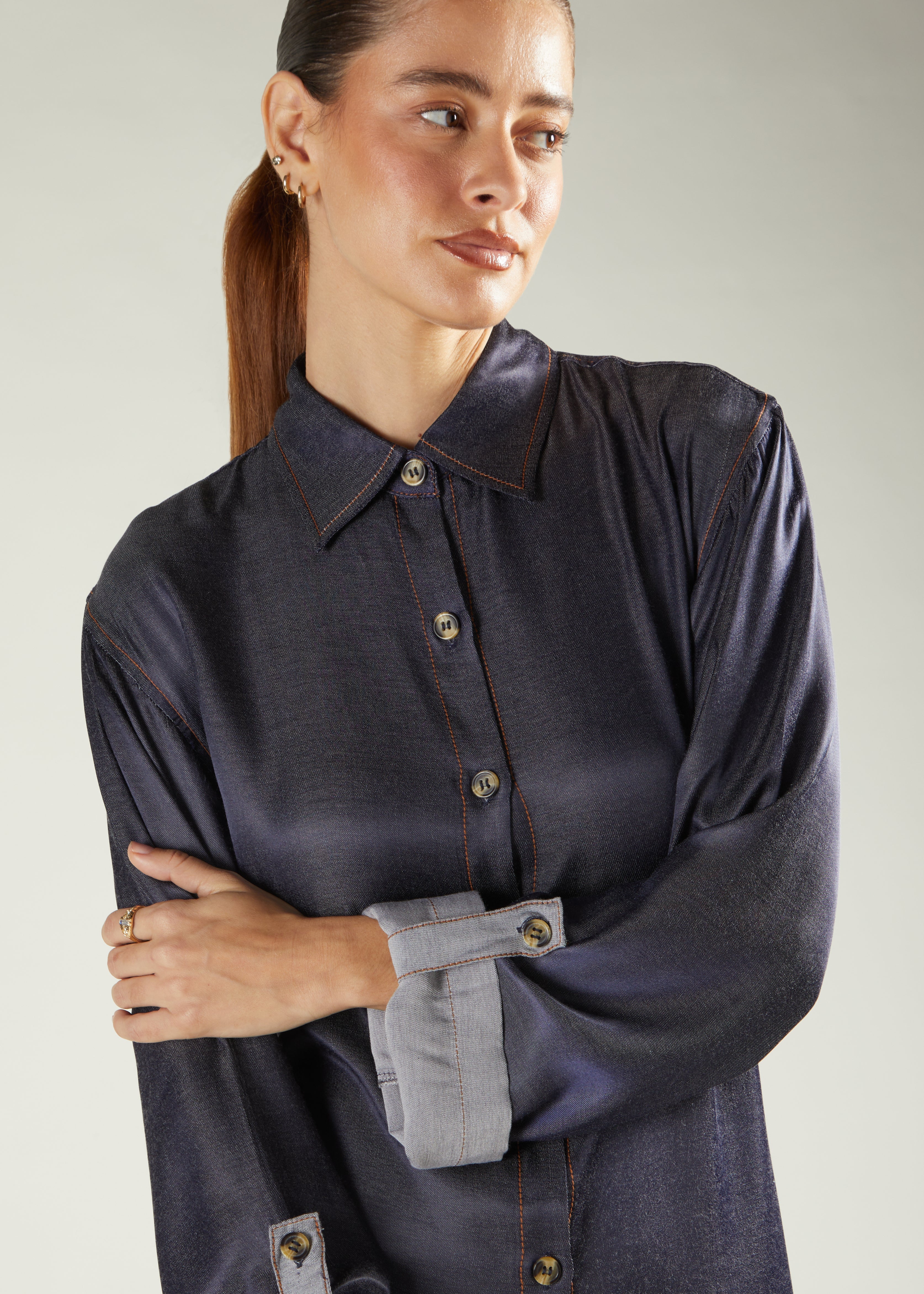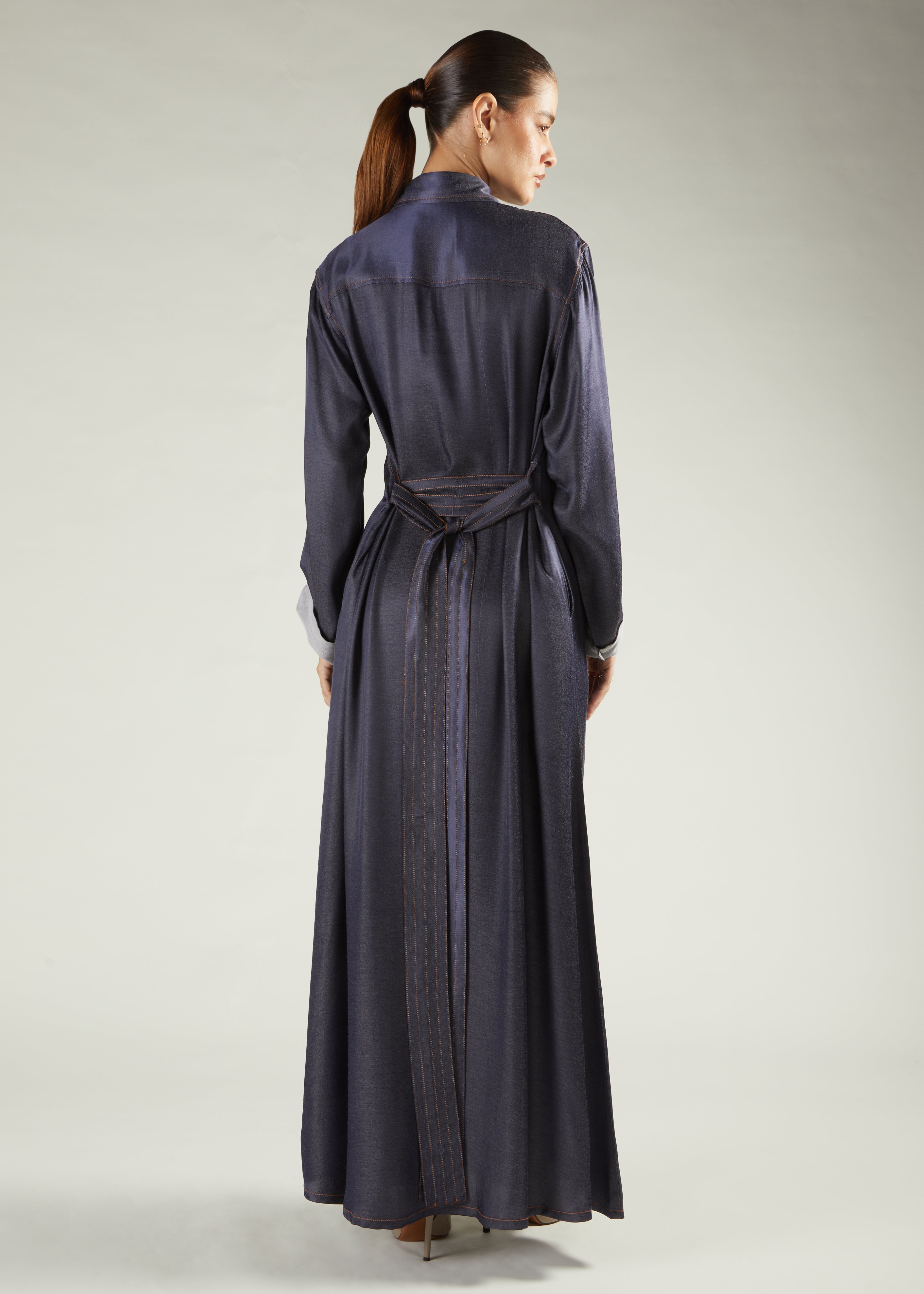 This long A line maxi style shirt features classic denim rustic stitch on the border of the buttons, on the pockets and hem line as well as the neckline and cuffs. The sleeves have a turn up option featuring a horn button on the sleeves as well as the front of the garment. Features a self-fabric belt.