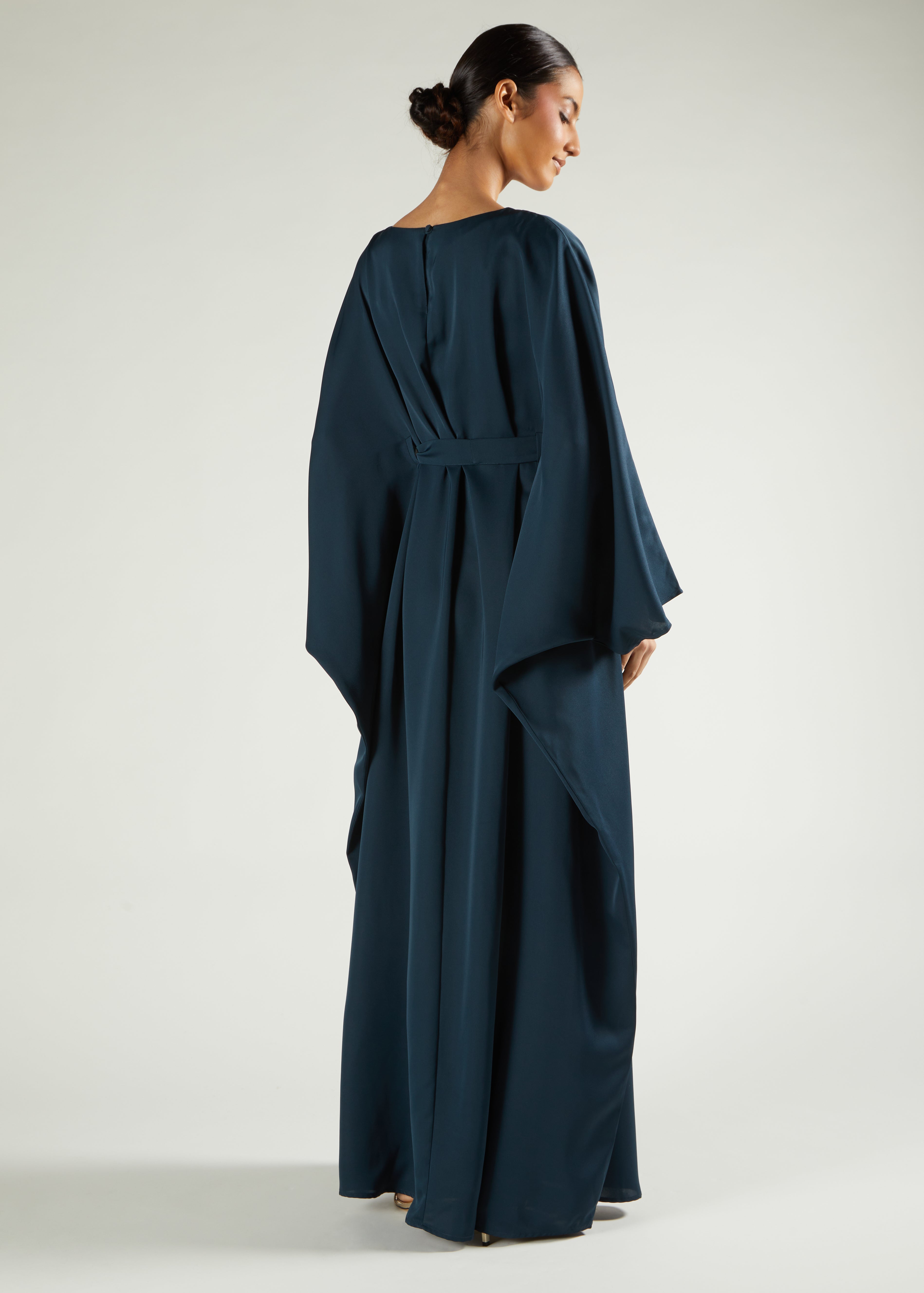 Bottle Green Kaftan is made from a fluid fabric with a subtle sheen, design for occasion wear, it has a loose fit silhouette which you can cinch at the waist to define your look.