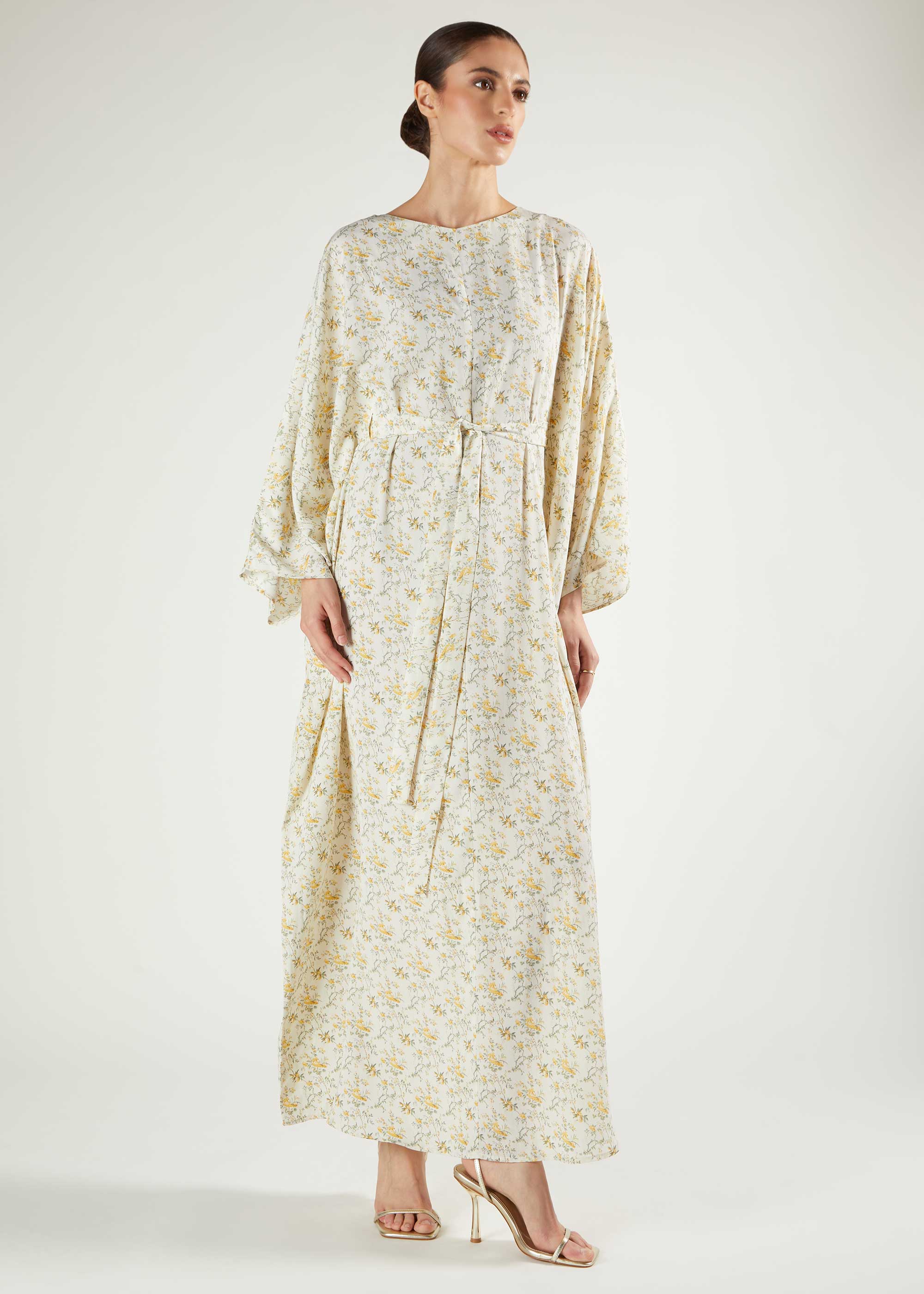 Dainty floral print cut in a kaftan style, loose fitting however we recommend choosing your regular size. Kaftan is floaty, lightweight and crease free for all day elegance. Featuring a belt.