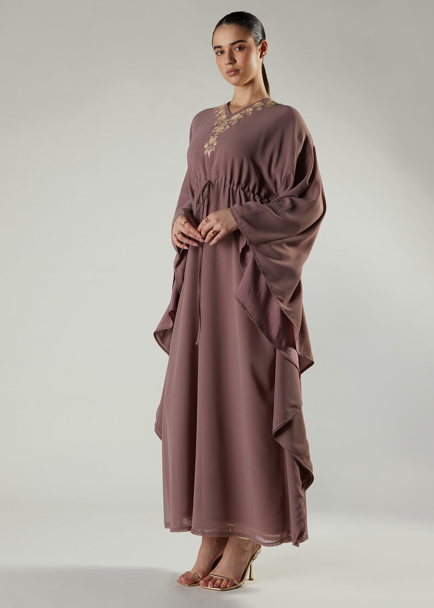 Featuring elegant floral embroidery on the neckline, this beautiful kaftan is made from a soft chiffon fabric and the cut of the kaftan cascades down the sides giving an elegant look. You can pull in the drawcord to define your waist.