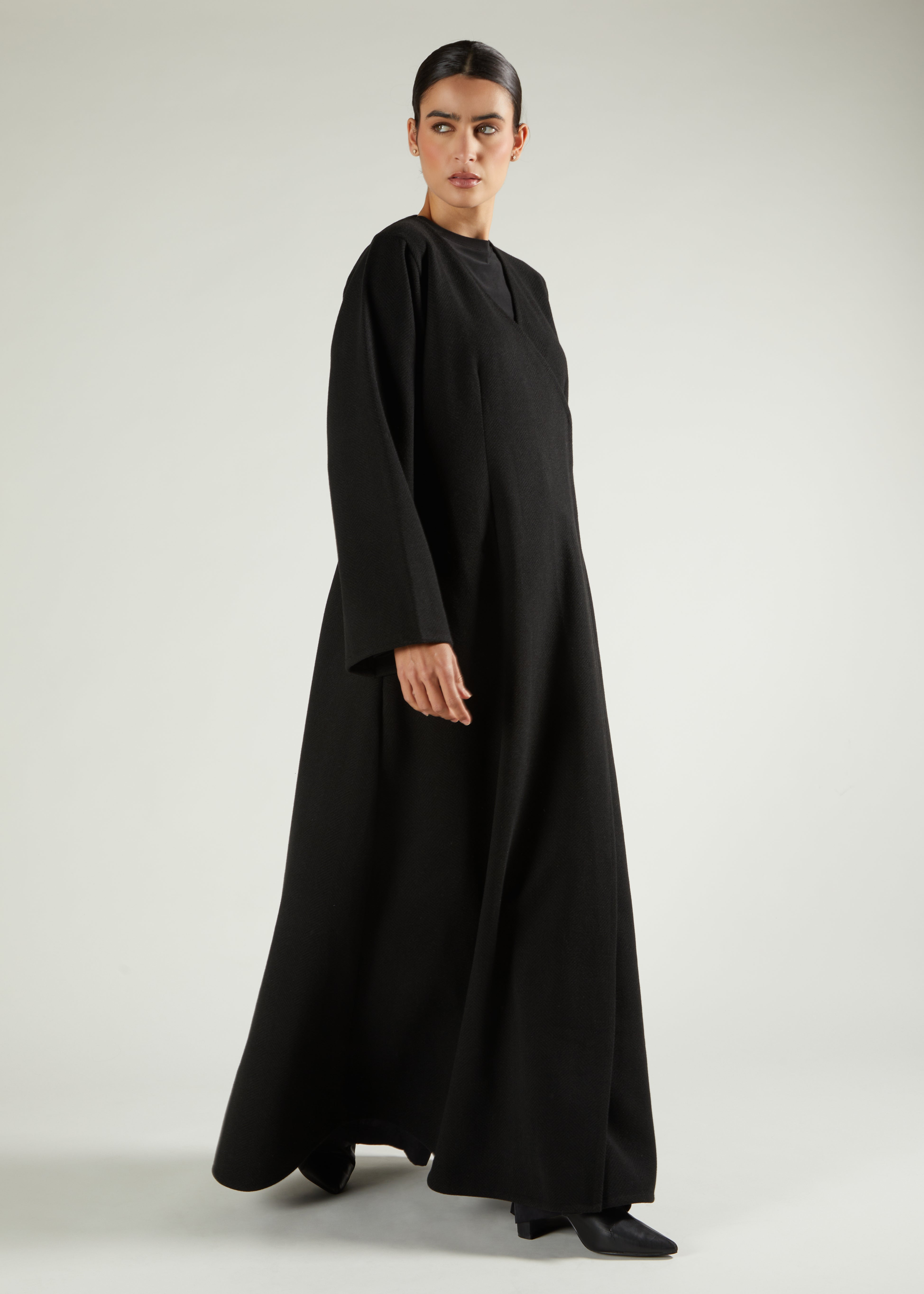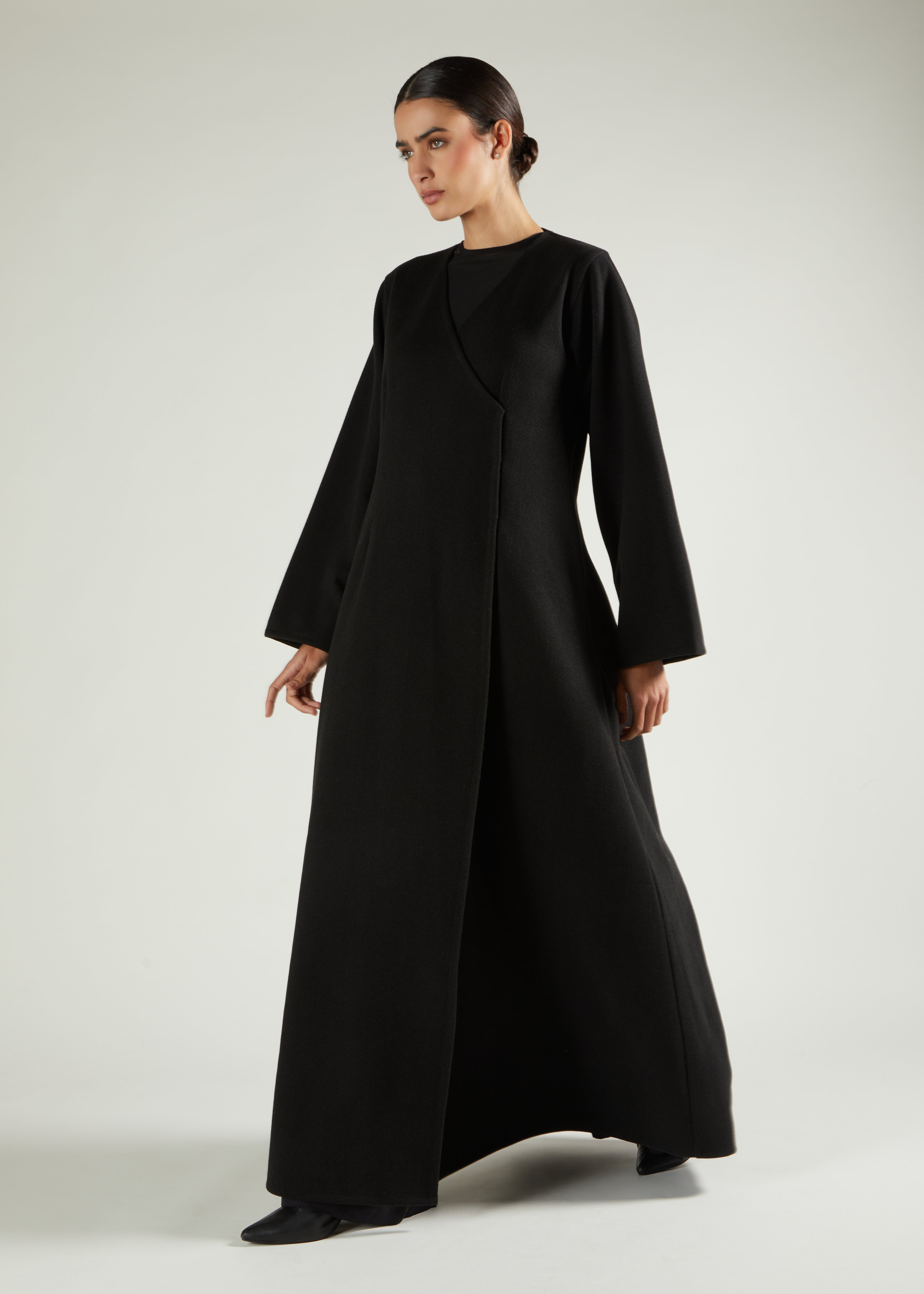 A masterclass in understated elegance, this wrap abaya blends refined tailoring with everyday ease. Made from a softly textured fabric, it features a clean wrap-over front secured with hidden secure fastenings for a seamless look. The long, flowing silhouette drapes beautifully, offering modest coverage with effortless movement. Complete with discreet side pockets, this versatile piece transitions perfectly from day to evening - a timeless staple for the modern modest wardrobe.
