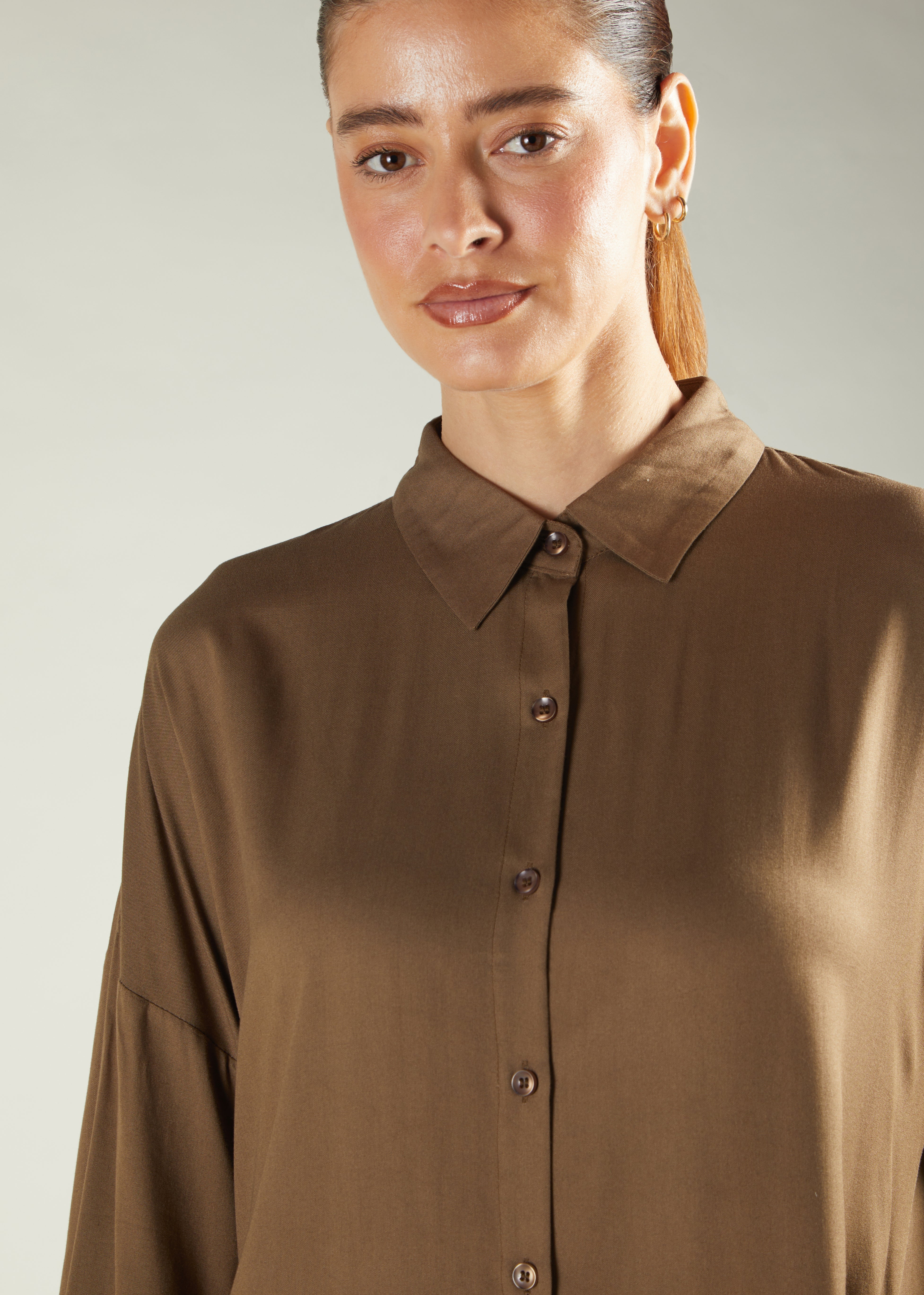 Co-Ord Set features a relaxed fit. The trousers incorporate an elasticated waistband for comfort, while the shirt includes practical front button closure, convenient pockets, and refined cuffed sleeves. The beautiful olive-green hue ensures this set remains appropriate for all seasons.