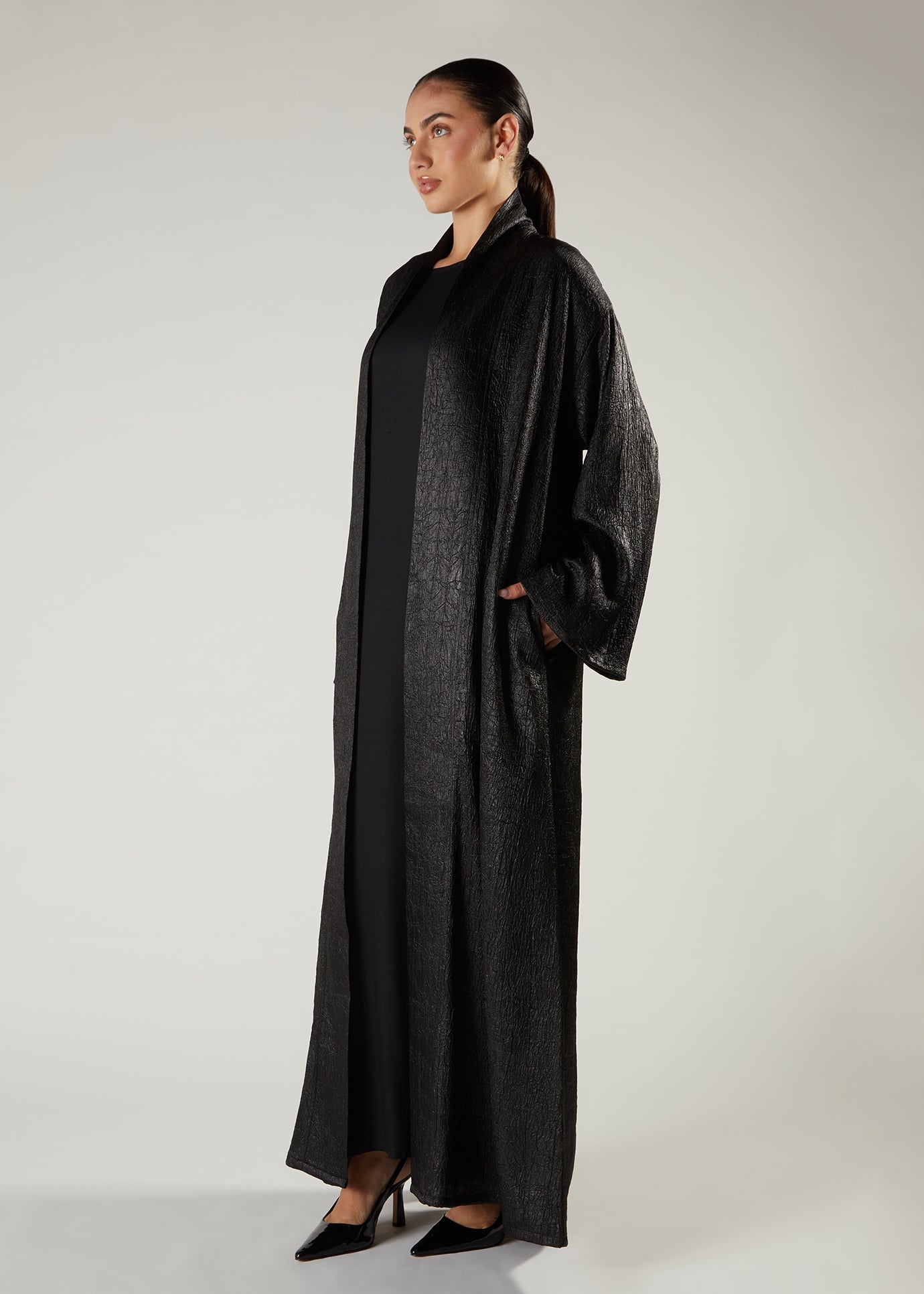 Open Abaya perfect for occasions and iftar gatherings, it is made from a crushed satin fabric. The loose-fitting abaya is perfect to pair with slips or other outfits to elevate your look, features discreet side pockets too.