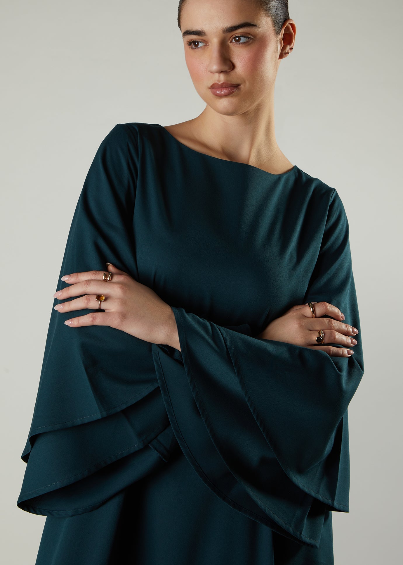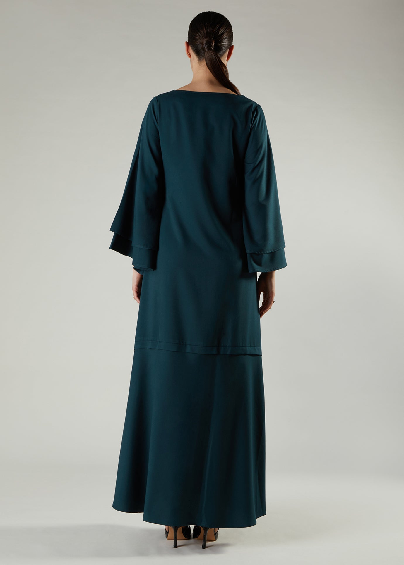 Abaya features a drop waist style, giving a double layered look to the garment. The sleeves also have a double layered wide floaty look. Features a round neckline. The Abaya is made from a soft twill fabric