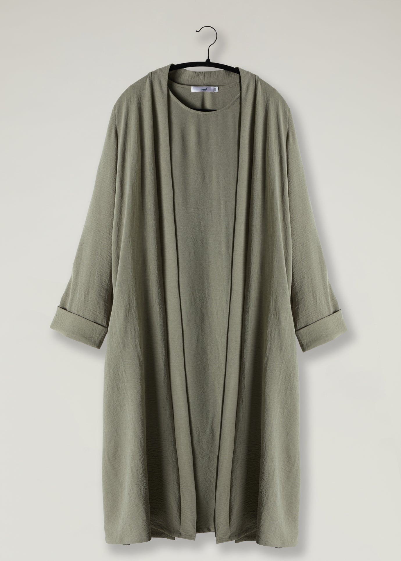 This elegant Two-Piece Open Abaya set includes a Full Sleeve matching slip. Perfect for everyday wear, it can also be dressed up with accessories for an evening look. The full sleeve slip dress can be worn as a maxi dress on its own or paired with the open abaya for a stylish ensemble.