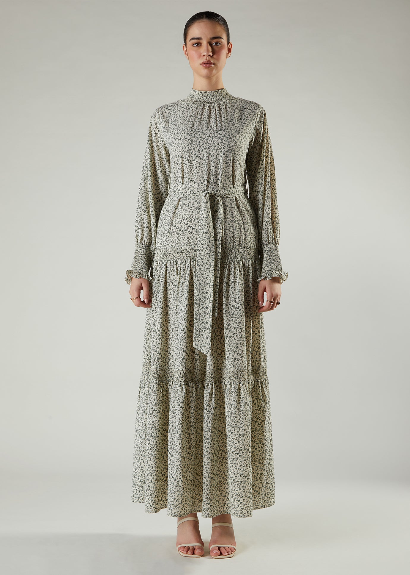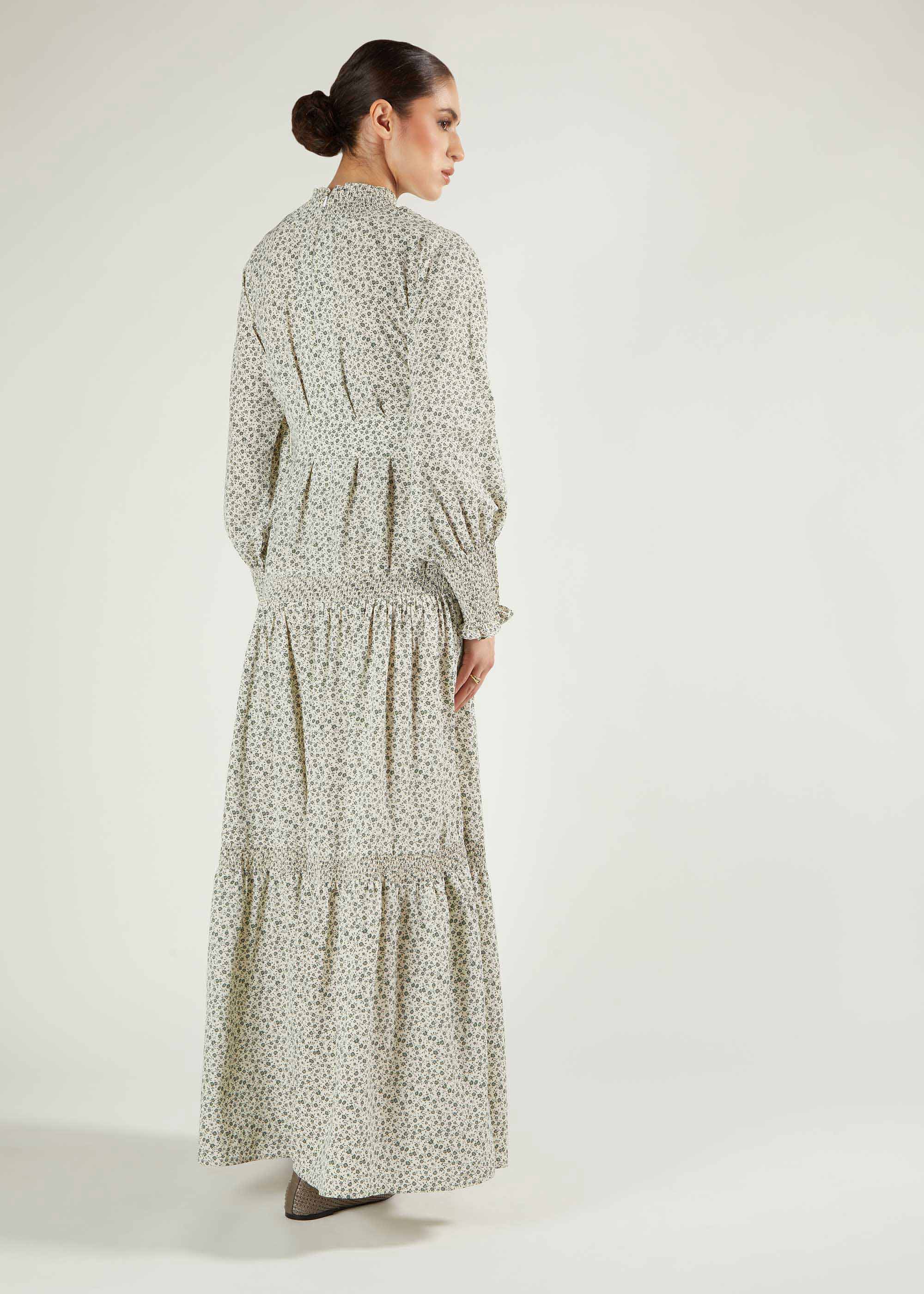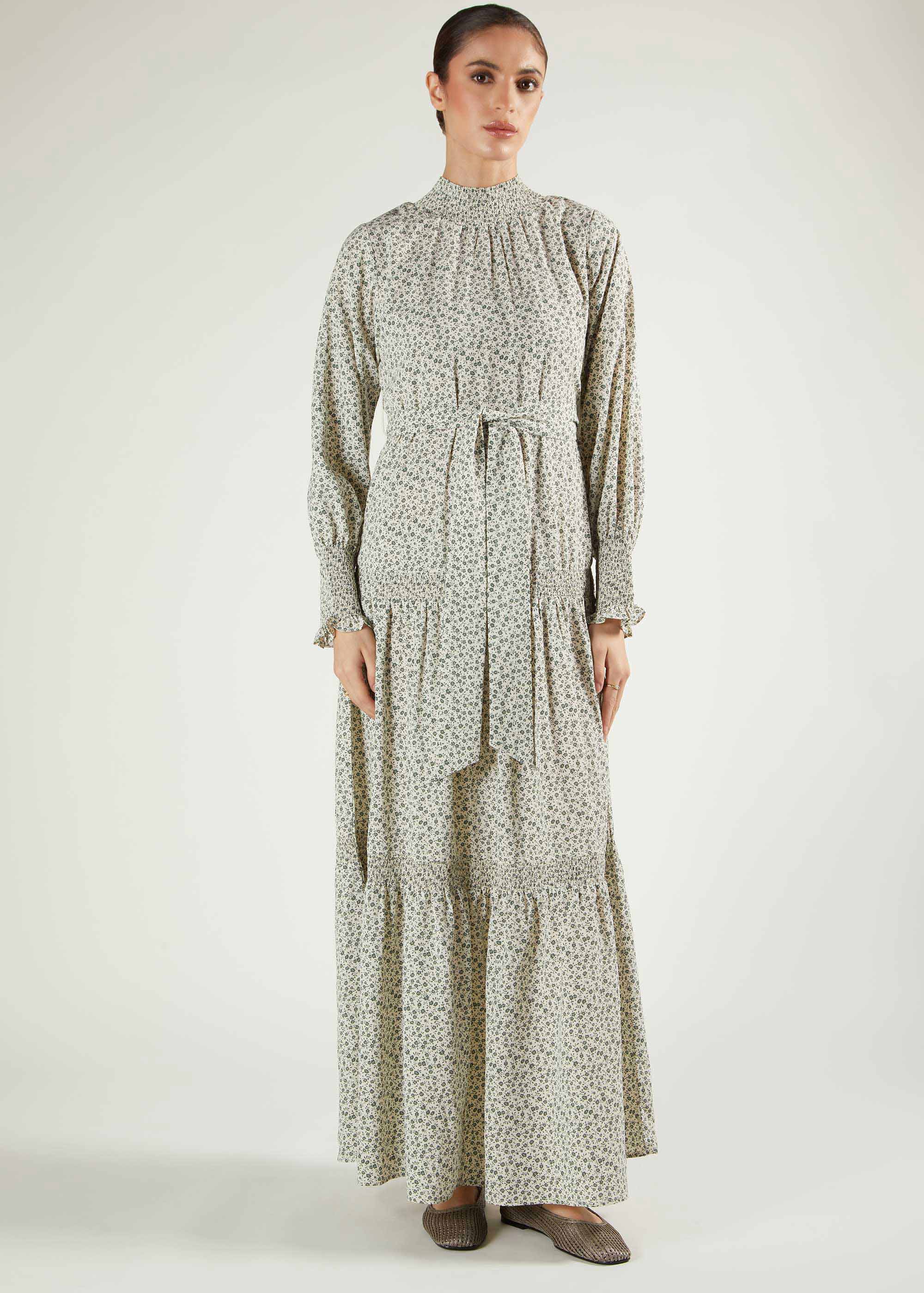 Green Bobin Maxi features tiers separated by beautiful smocking detail on the neckline, cuffs and between the tiers. Made from a fluid fabric in cream and green