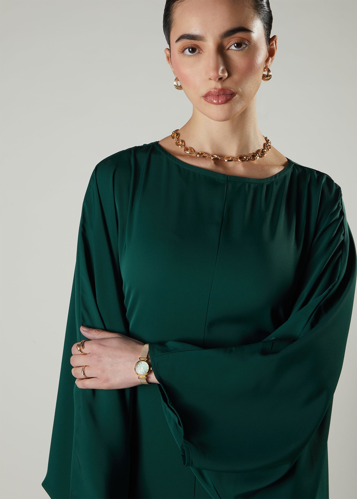 Soft satin-feel kaftan that features an inner belt to allow you to tie in to give shape if desired. The sleeves have a hidden button inside to stop the sleeves rising upwards and exposing your arms. A beautiful summery green kaftan perfect to wear for occasions.