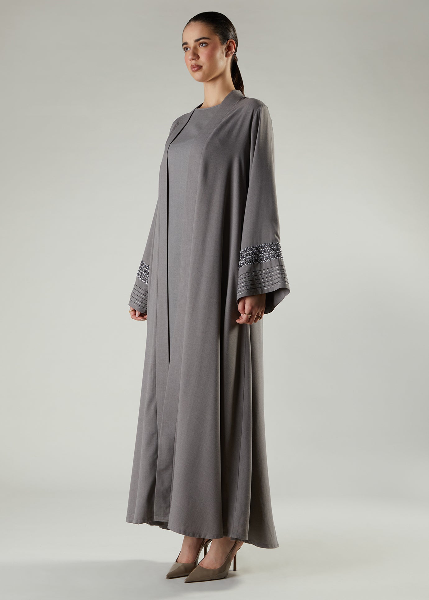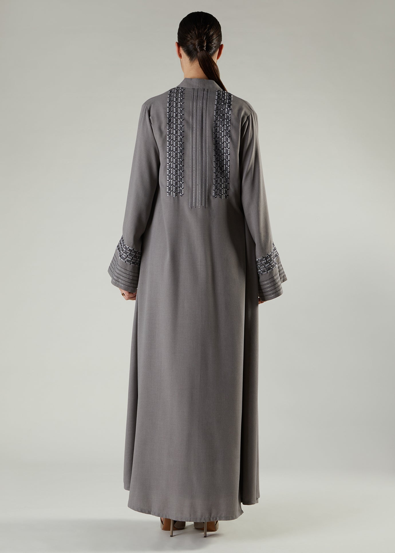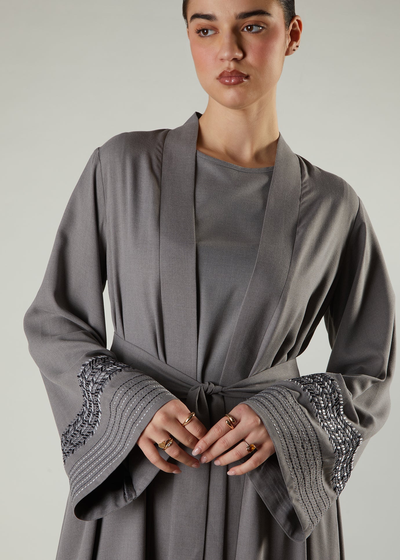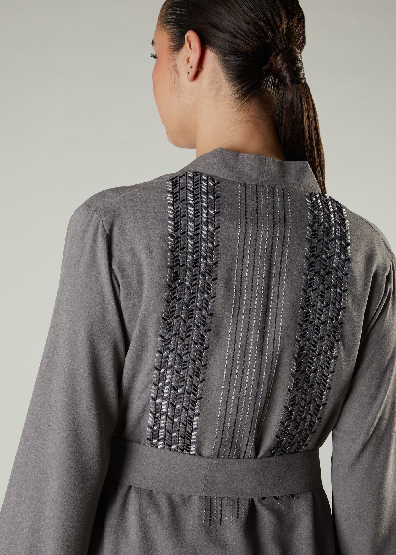 A boxy style kimono in a soft grey fabric featuring herringbone style embroidery on the back and cuffs. The tonal embroidery accentuates the outfit giving it a regal look and feel. Garment has a looser silhouette, but we recommend choosing your usual size.