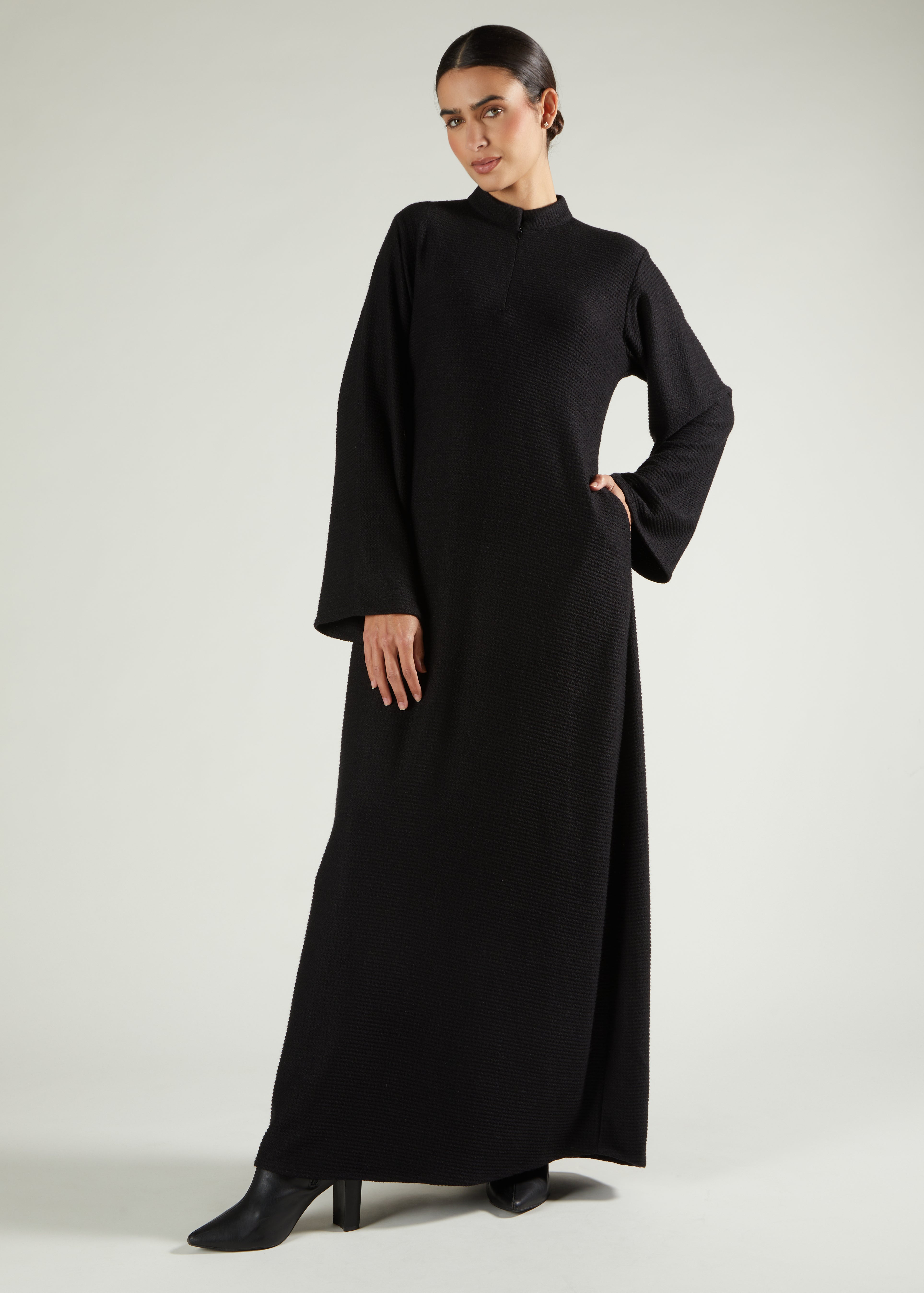 Refined minimalism meets everyday ease in this beautifully tailored abaya. Made from a softly knit textured fabric, it features a structured silhouette with a high neckline and concealed half-zip closure for a clean, contemporary finish. The relaxed fit and fluid drape ensure effortless comfort, while discreet side pockets add a practical touch. Timeless and versatile, this piece transitions seamlessly from day to evening, embodying understated elegance at its finest