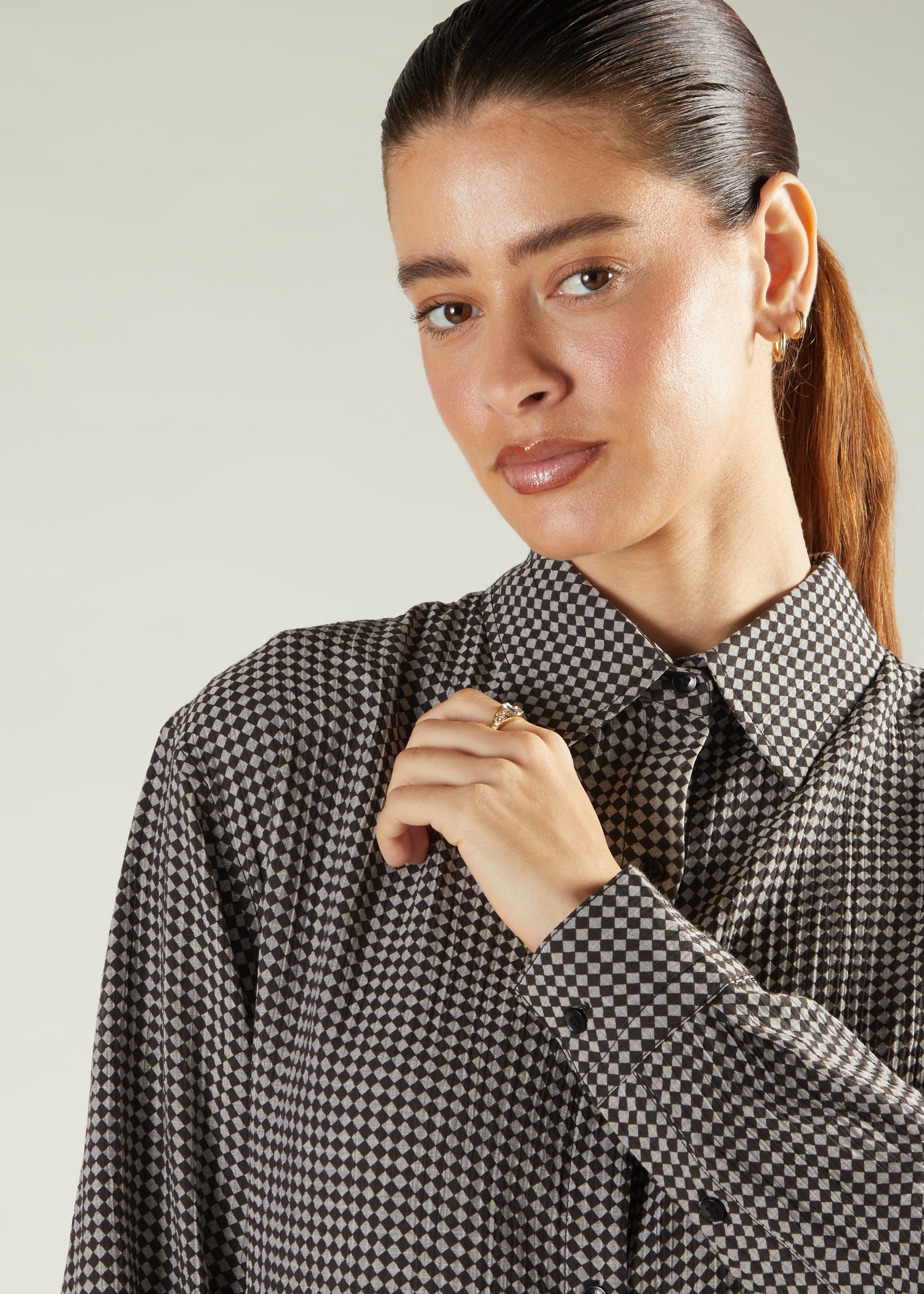 This micro-check print maxi is made from a soft tissue like chiffon and is fully lined. It can be styled in many ways making it ideal for formal workwear. Features a button opening all the way down the front, it is lightweight and crease free and features discreet side pockets for convenience.