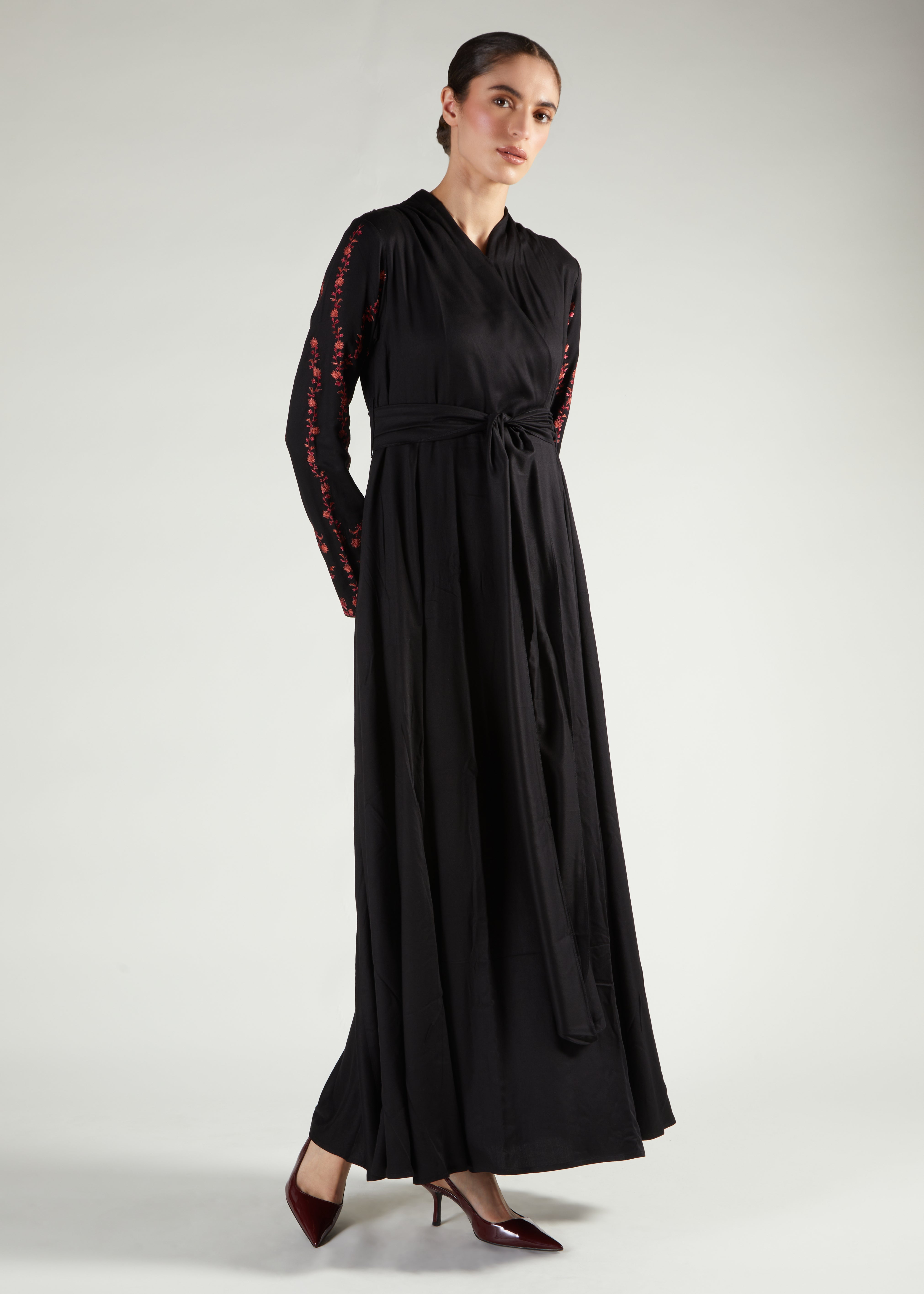 Mandevilla Garden Abaya features delicate trailing floral embroidery in a beautiful ruby red shade which stands out against the soft black twill fabric. A soft fabric designed with elegant details; the wrap style Abaya has a flattering fit.