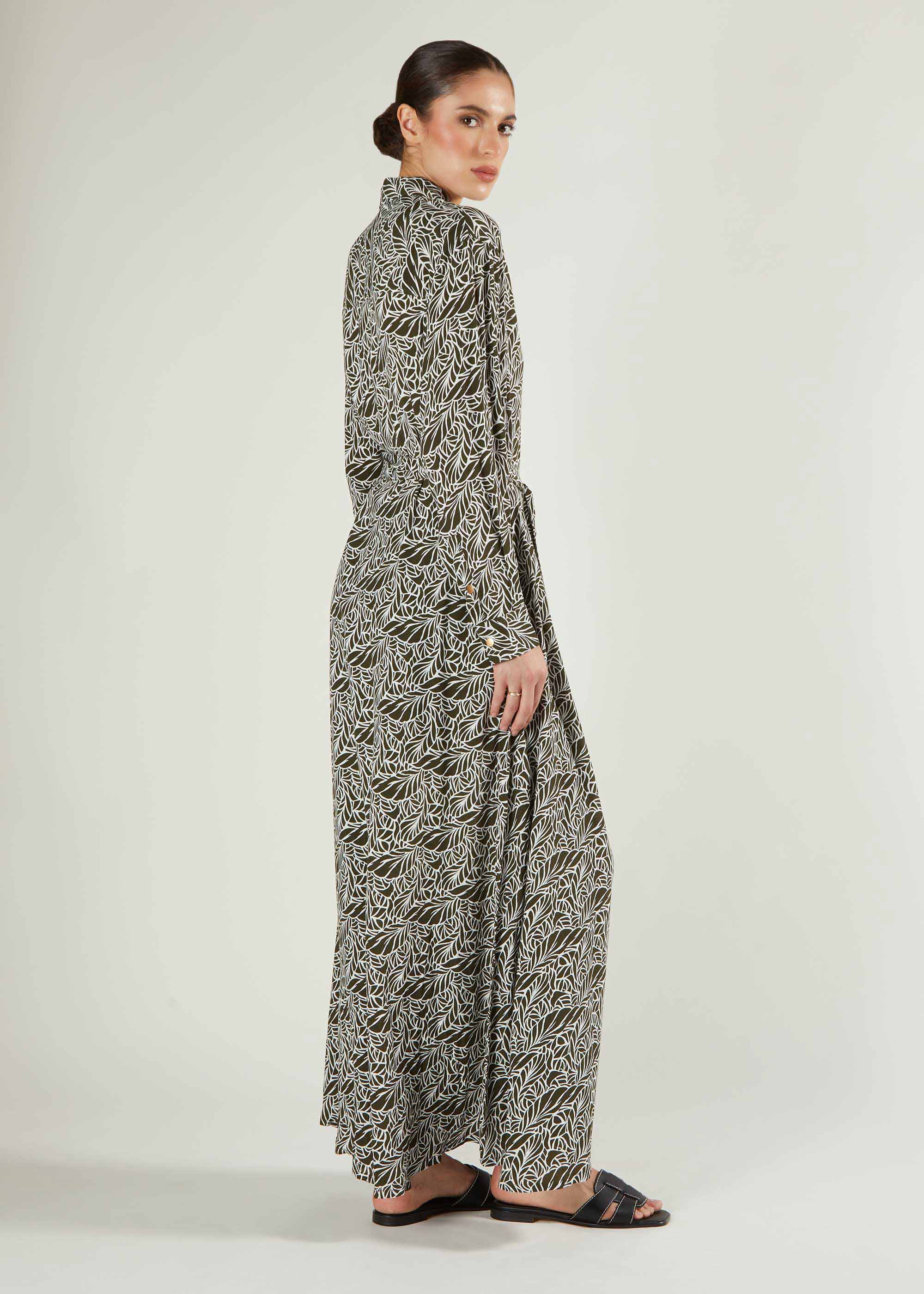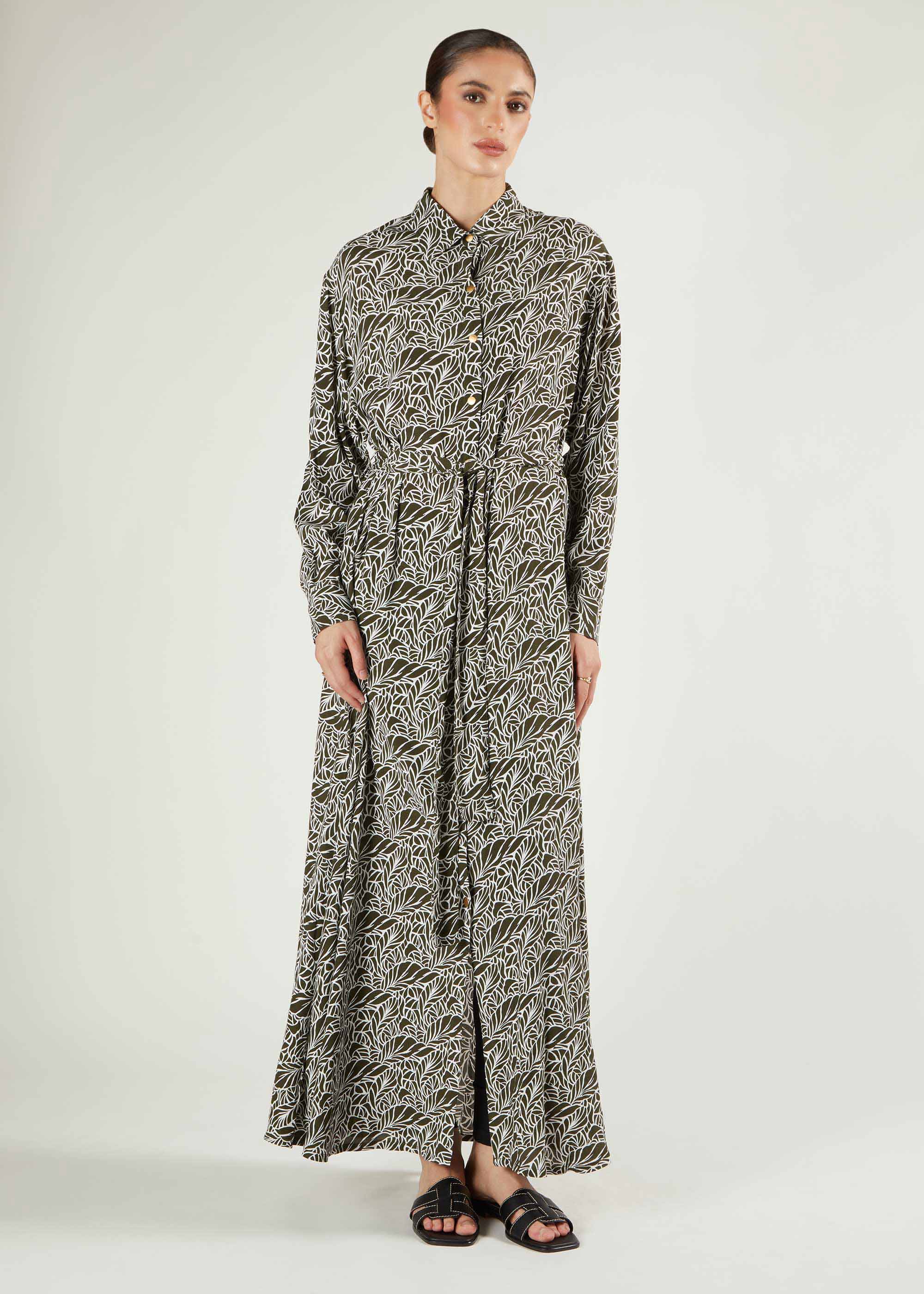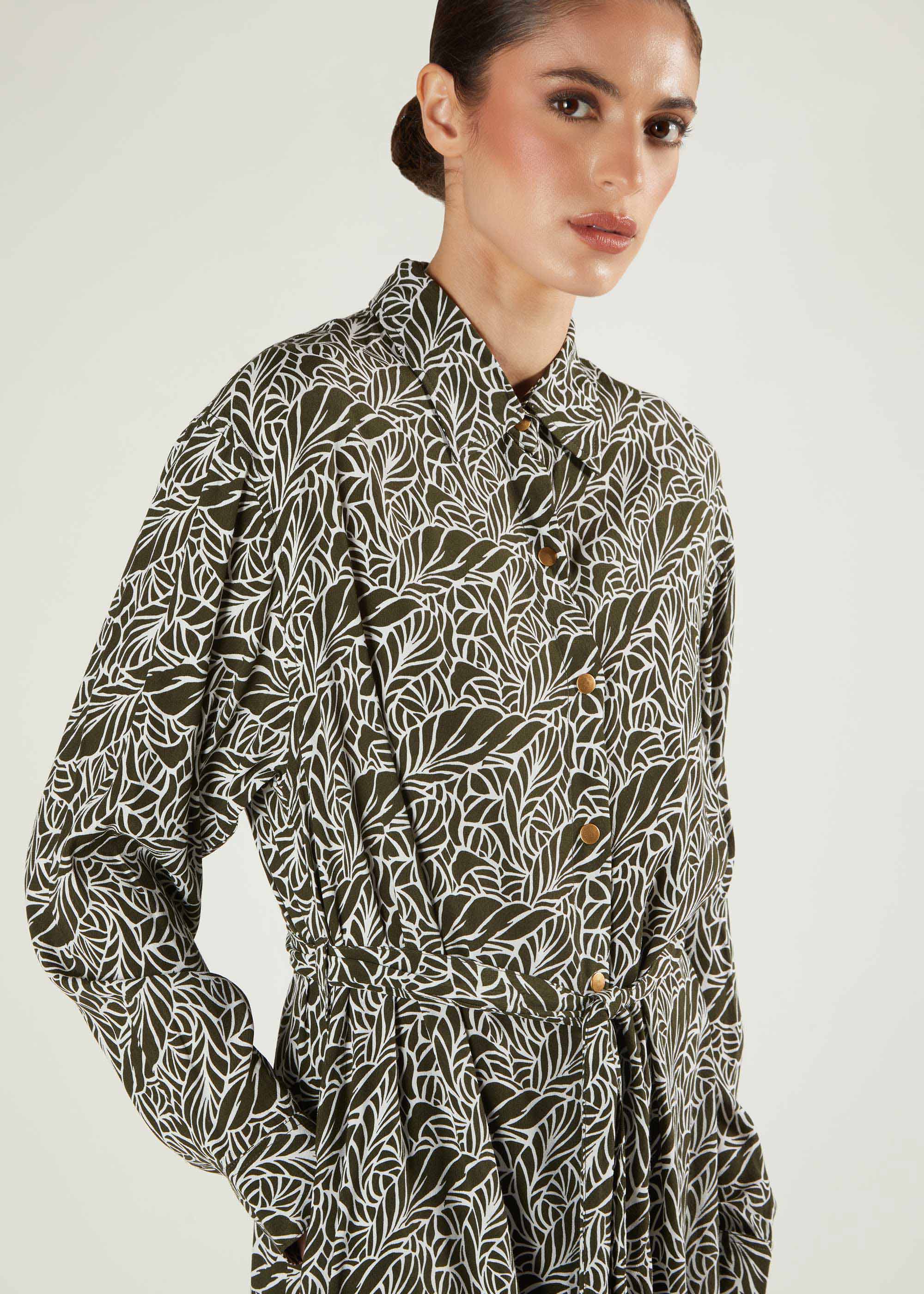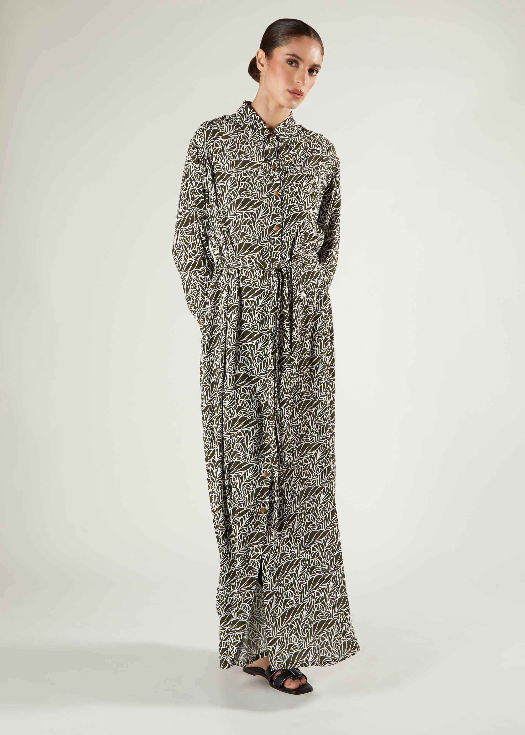 The Matcha Maxi is made from cotton with a striking leaf print and designed in a modest A-line shape. It includes an internal drawstring to adjust the waist for a tailored fit. Details such as gold snap buttons on the placket and cuffs add a refined touch. We advise selecting your usual size for the best fit.