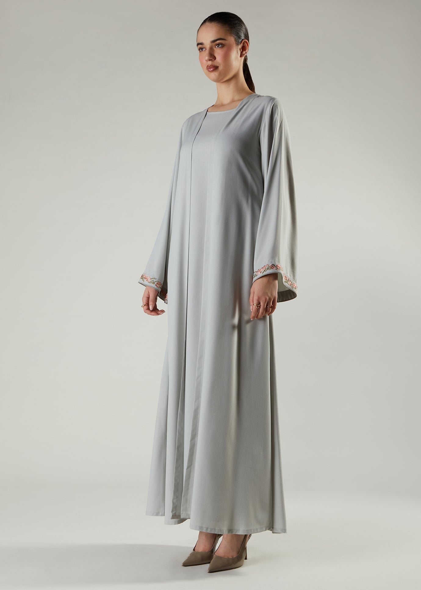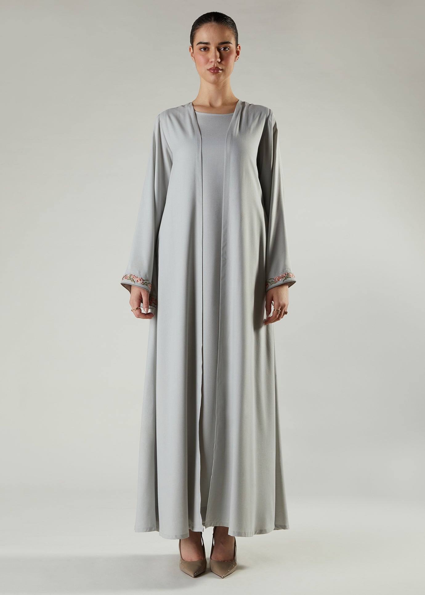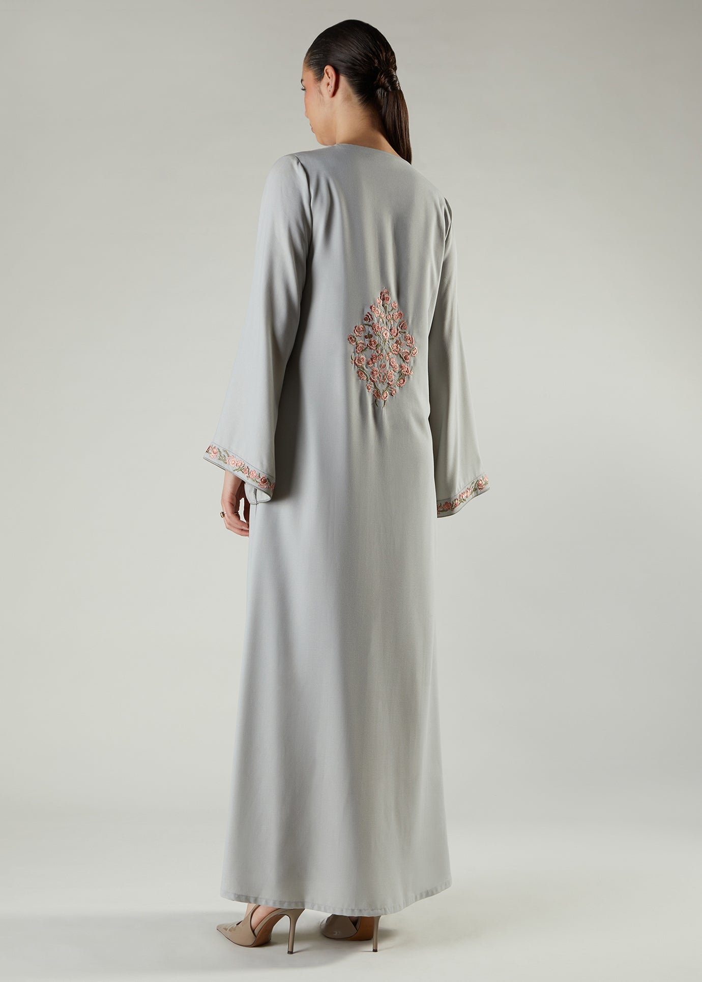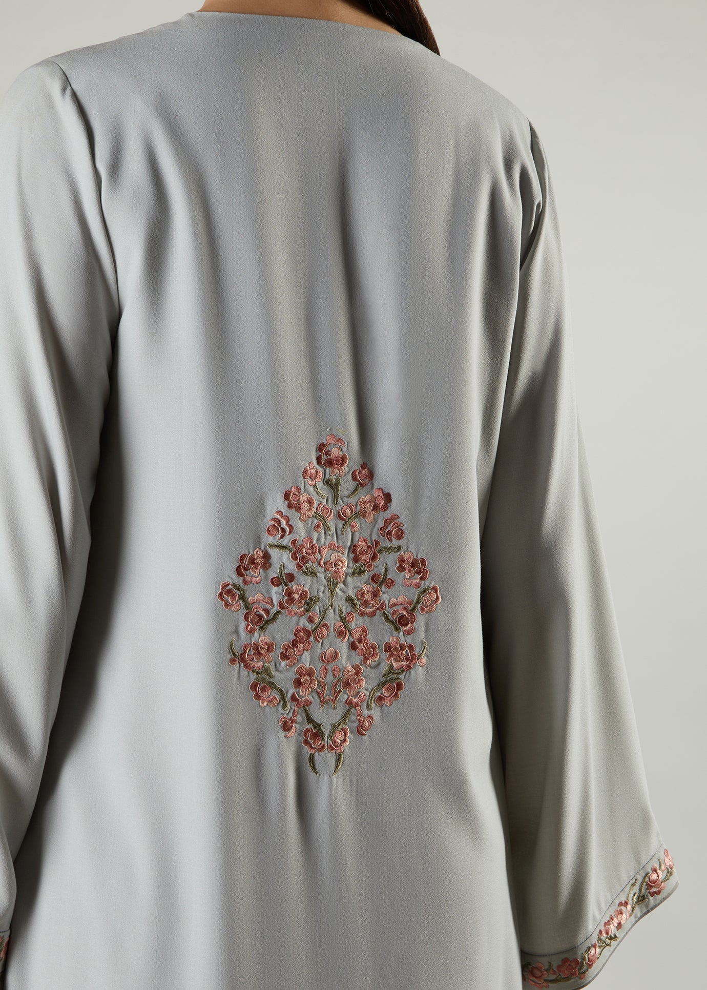 An elegant Kimono in a soft sage tone, fluid fabric that has a flattering fall. The Kimono features an embroidered motif on the back and edge of the sleeves.
