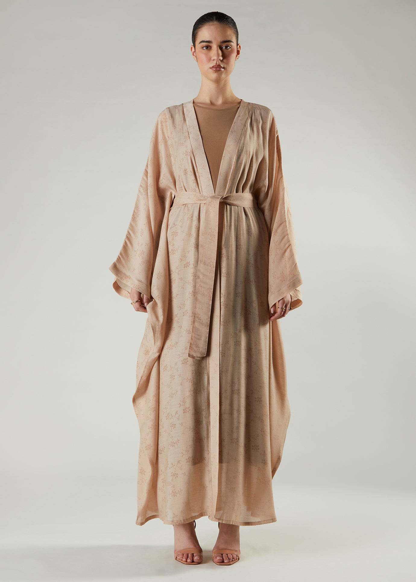Elegant Kimono in a soft pink tone with a delicate floral print, it has a loose modest silhouette with exaggerated sleeves. Pair with our slips to complete your look