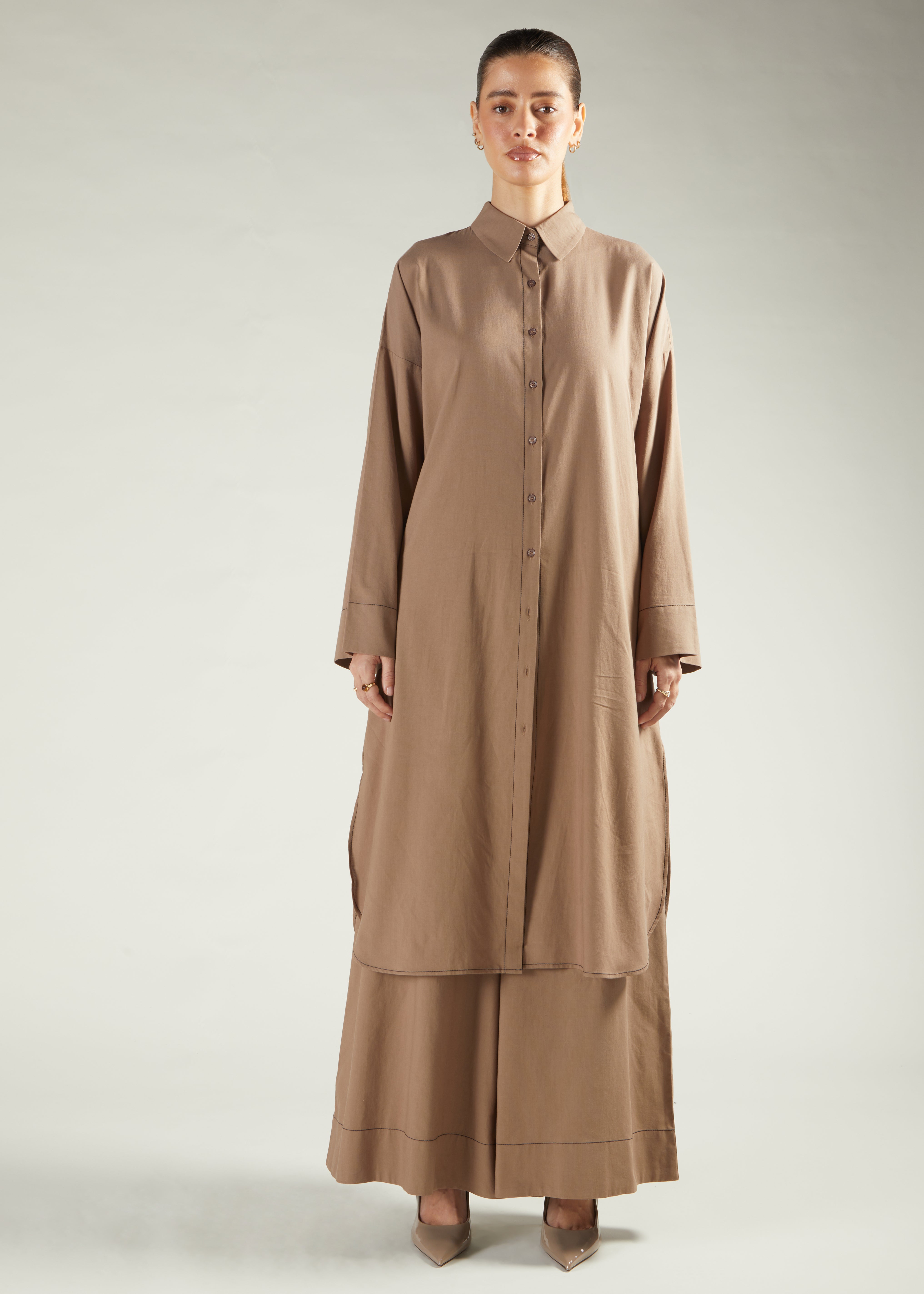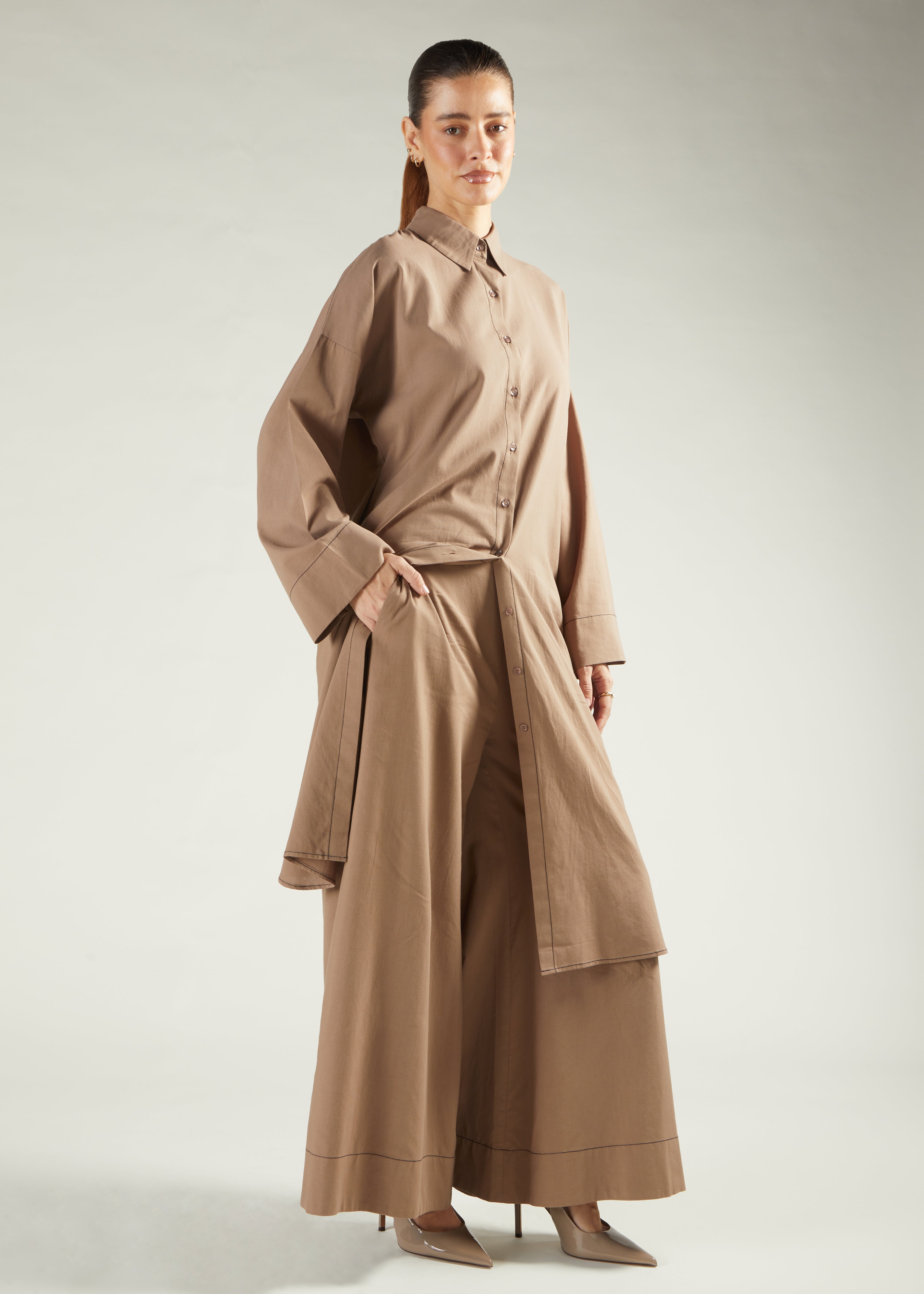 Co-Ord Set features a loose-fitting silhouette and wide cut trousers - made from 100% cotton, the co-ord also has a single contrast stitch to elevate the outfit. Complete with discreet side pockets, the loose fit silhouette means you can layer over roll necks this season
