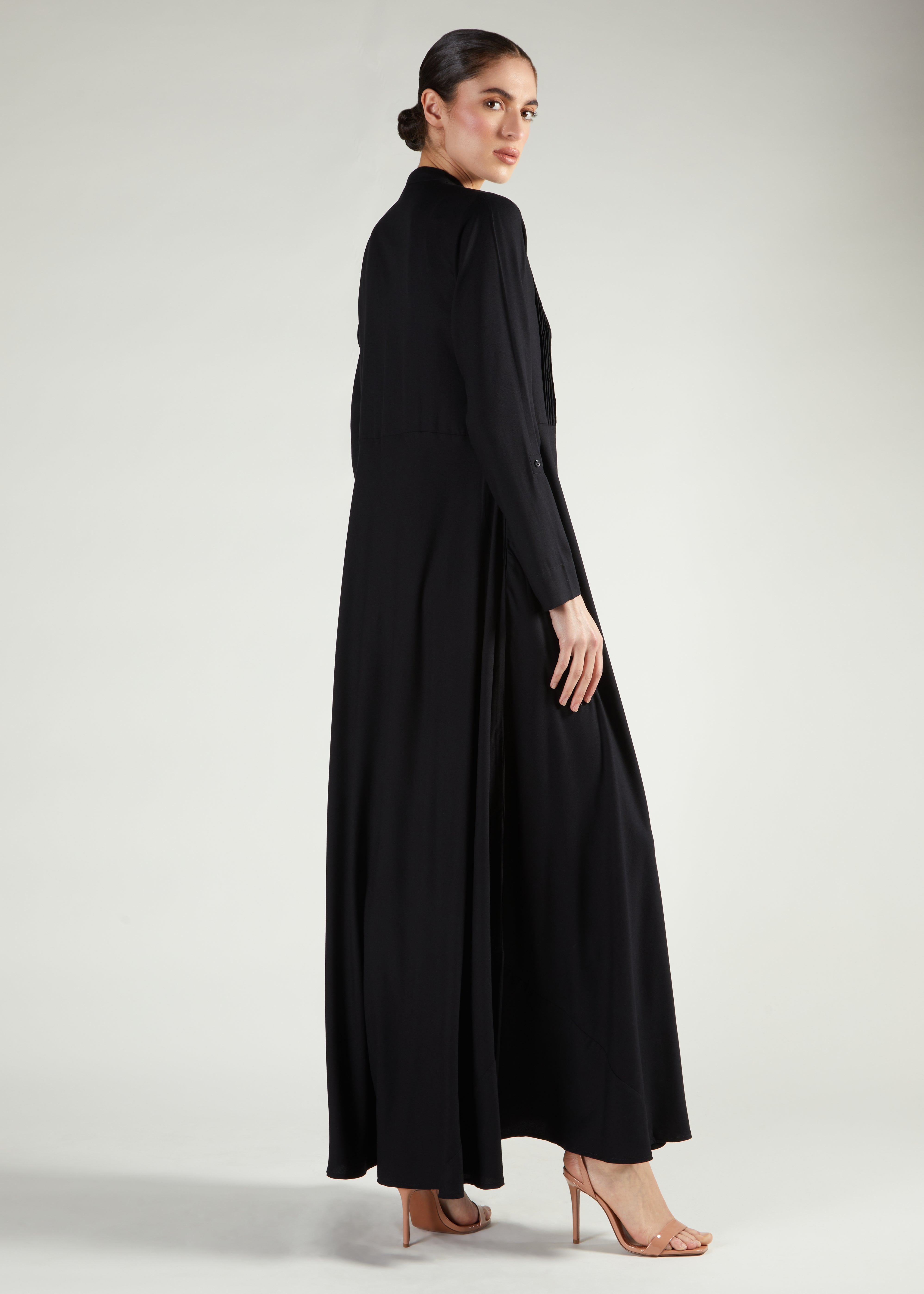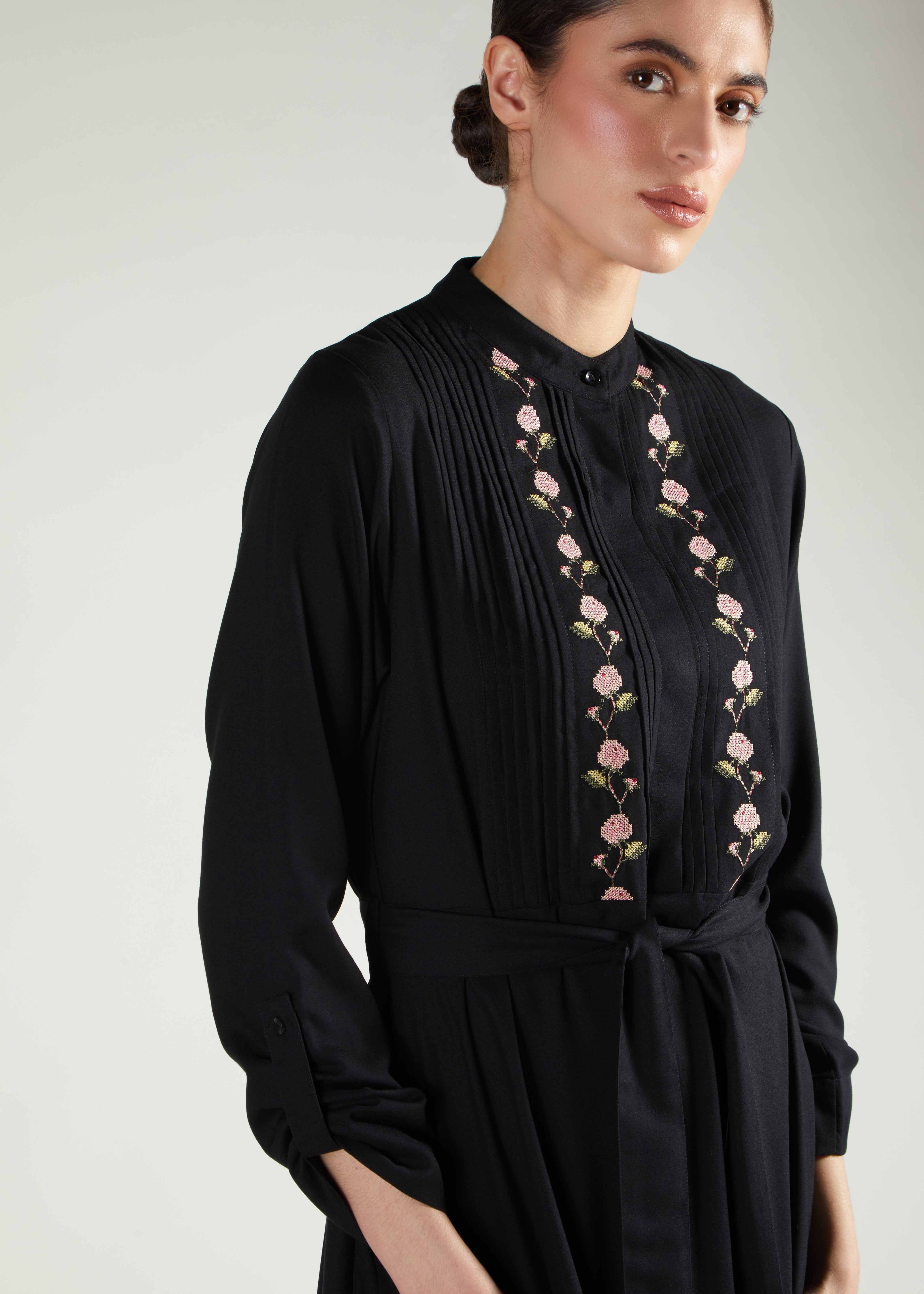 This elegant Abaya showcases a flattering A-line silhouette with a line of embroidery on the front bodice. Delicate cross-stitch details in soft pink hues add a feminine touch to this timeless piece. The design includes practical features like adjustable sleeves you can roll up and a removable belt to customise your look. True to size for a comfortable fit.