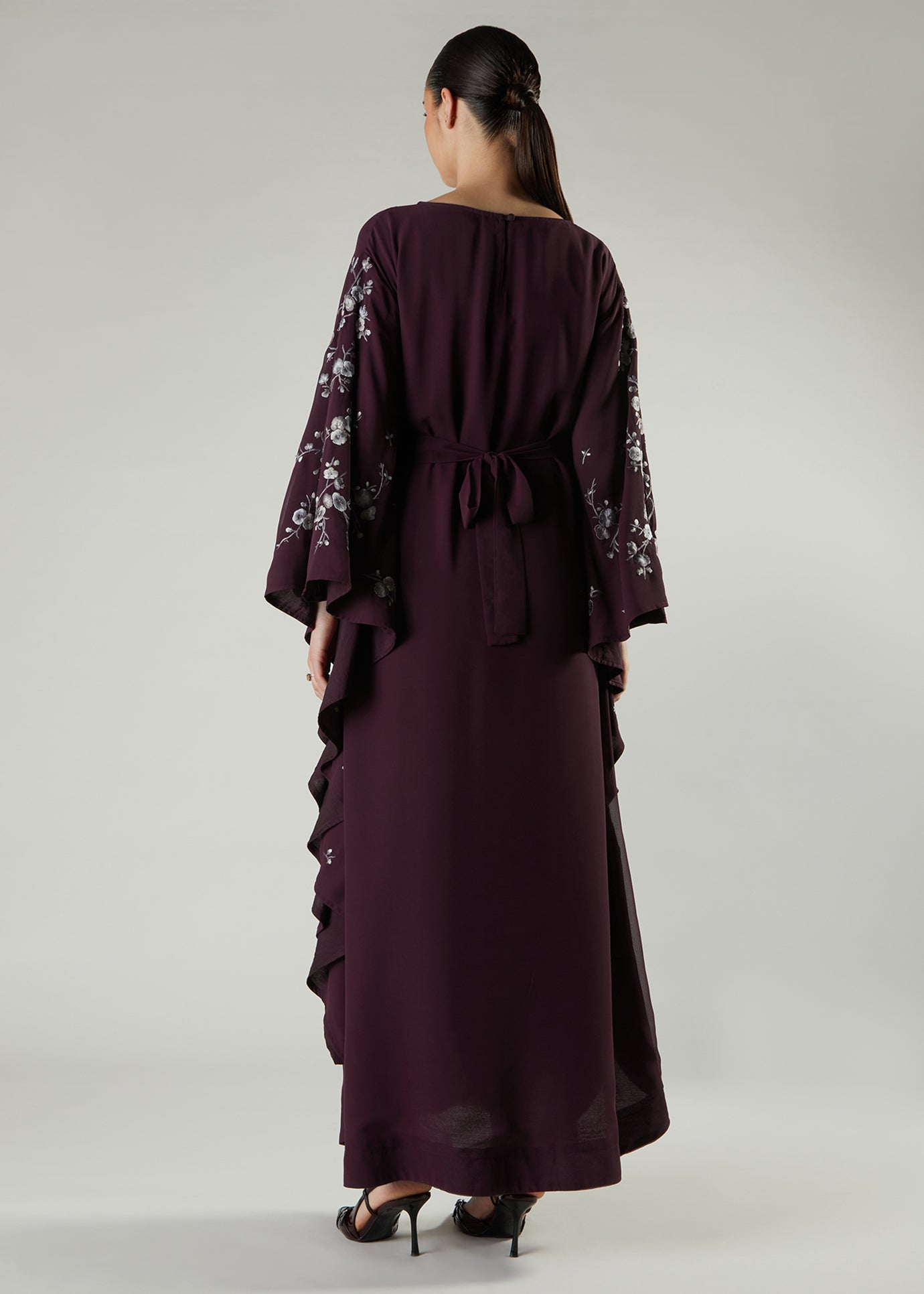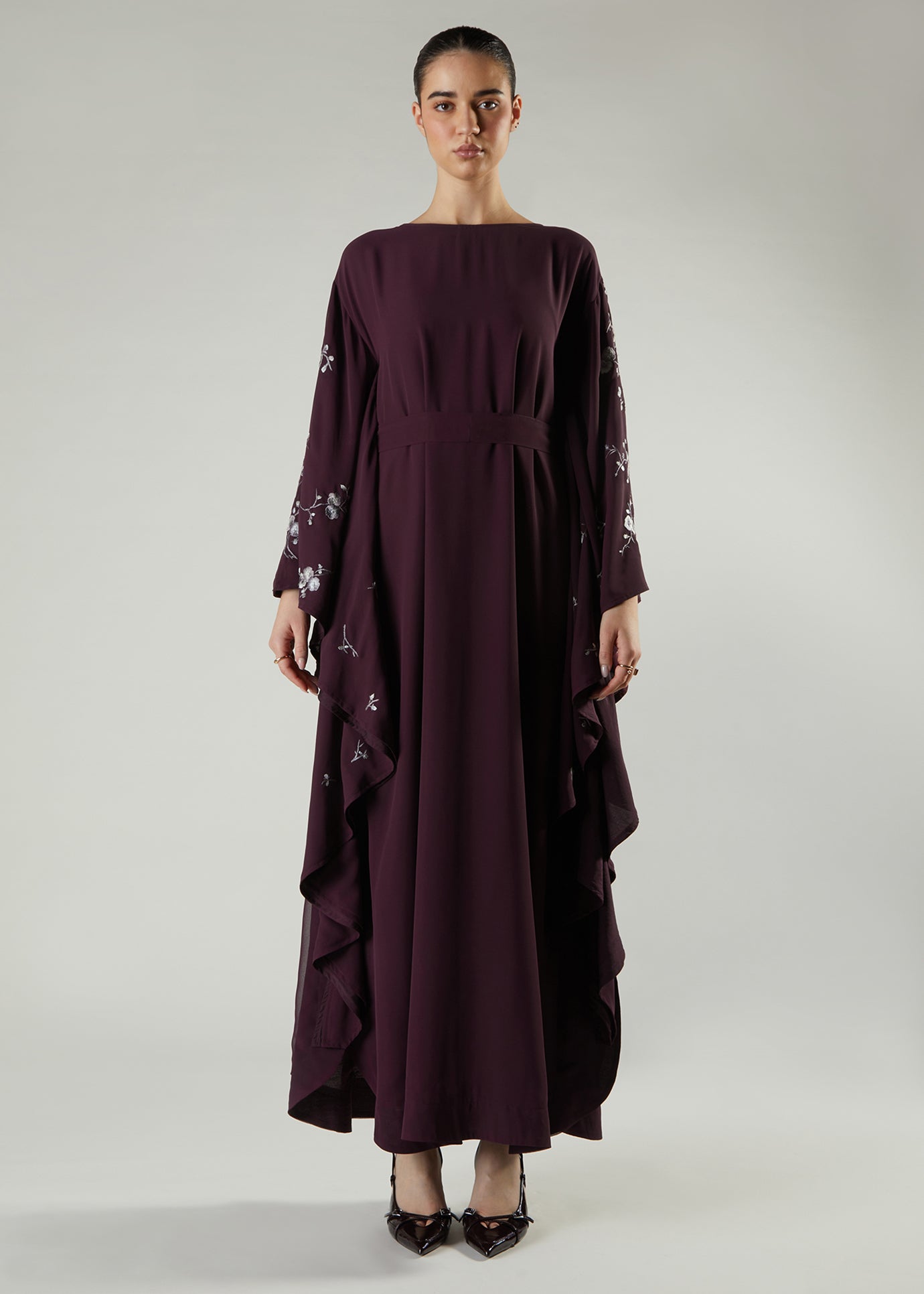 Beautifully cut for a floaty silhouette and from a fluid crepe fabric, the garment is fully lined with 100% cotton lining. The kaftan features exquisitely embroidered panels on the sides with tonal silvery grey floral motifs.