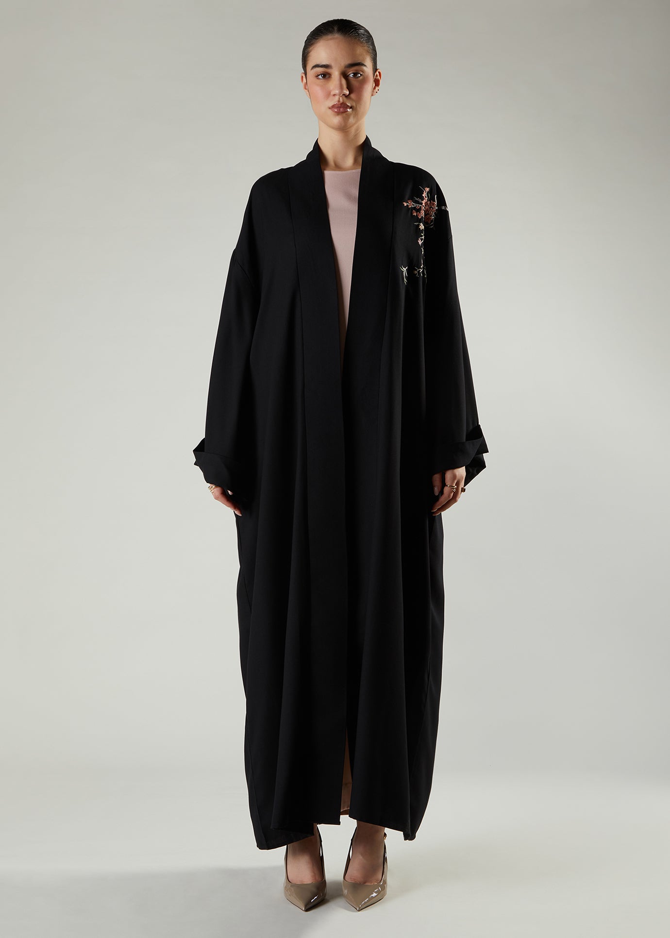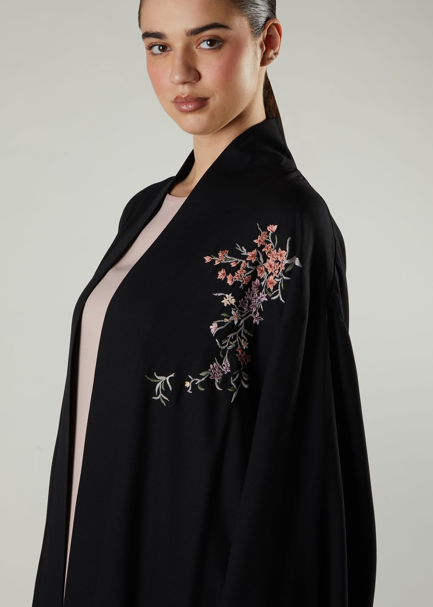 The cut of this garment has been inspired by traditional Japanese kimonos and the beautiful floral motif on the back depicts of an oriental spring garden in full bloom. The embroidery features heavily at the back of the garment with a small trail on the front. Pair with our range of light-coloured slips to elevate the outfit and finish your look with our chiffon silk hijabs.