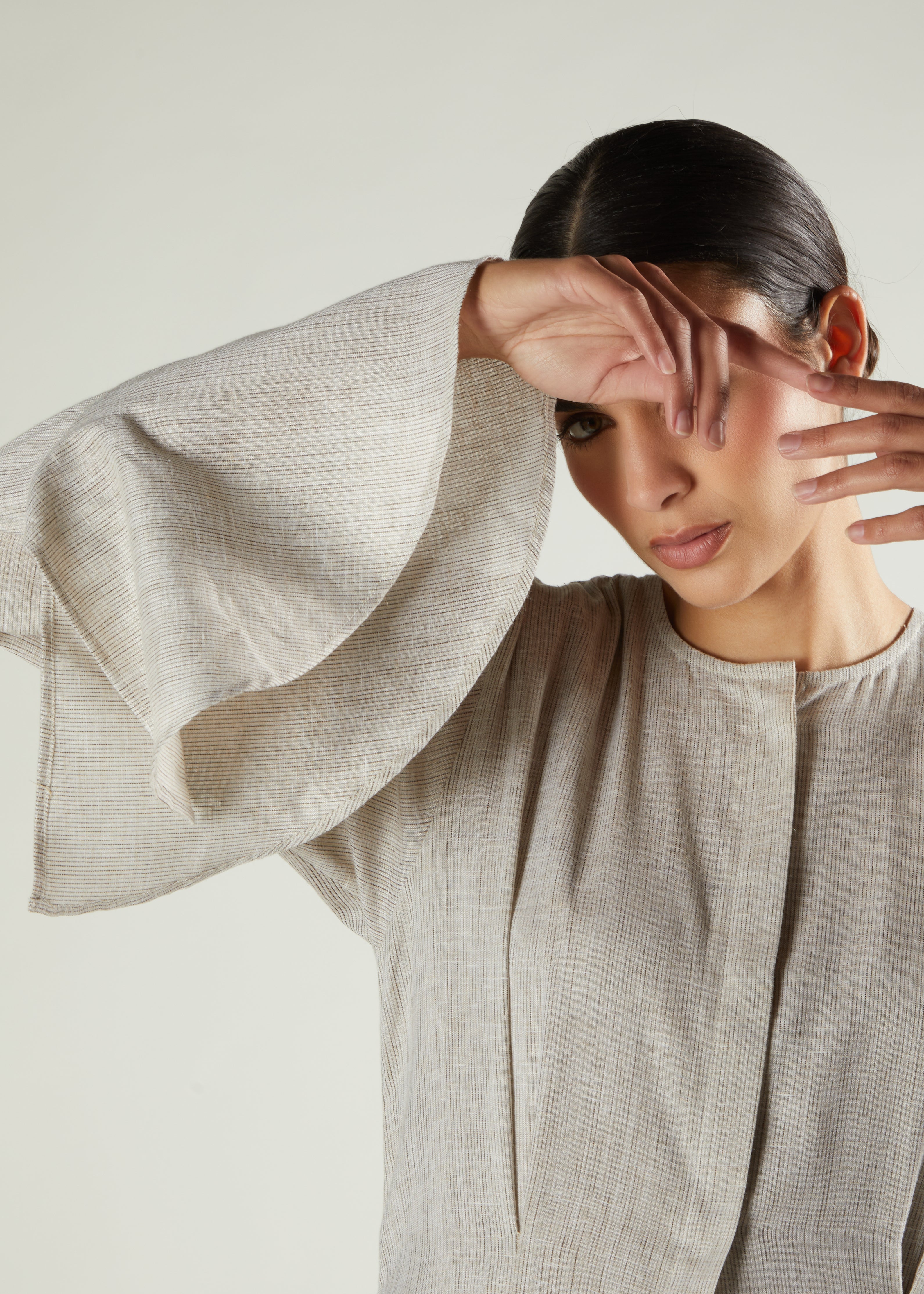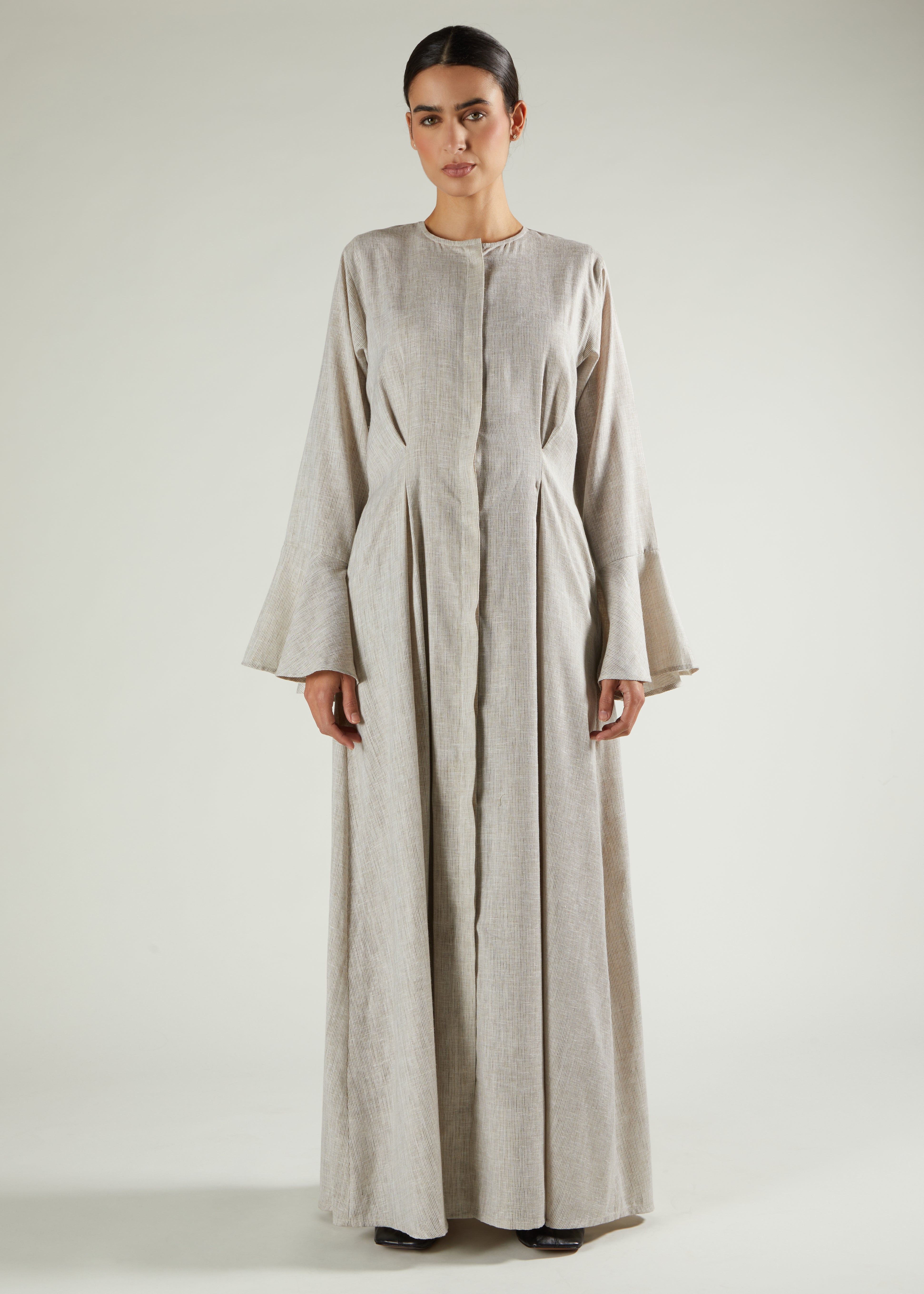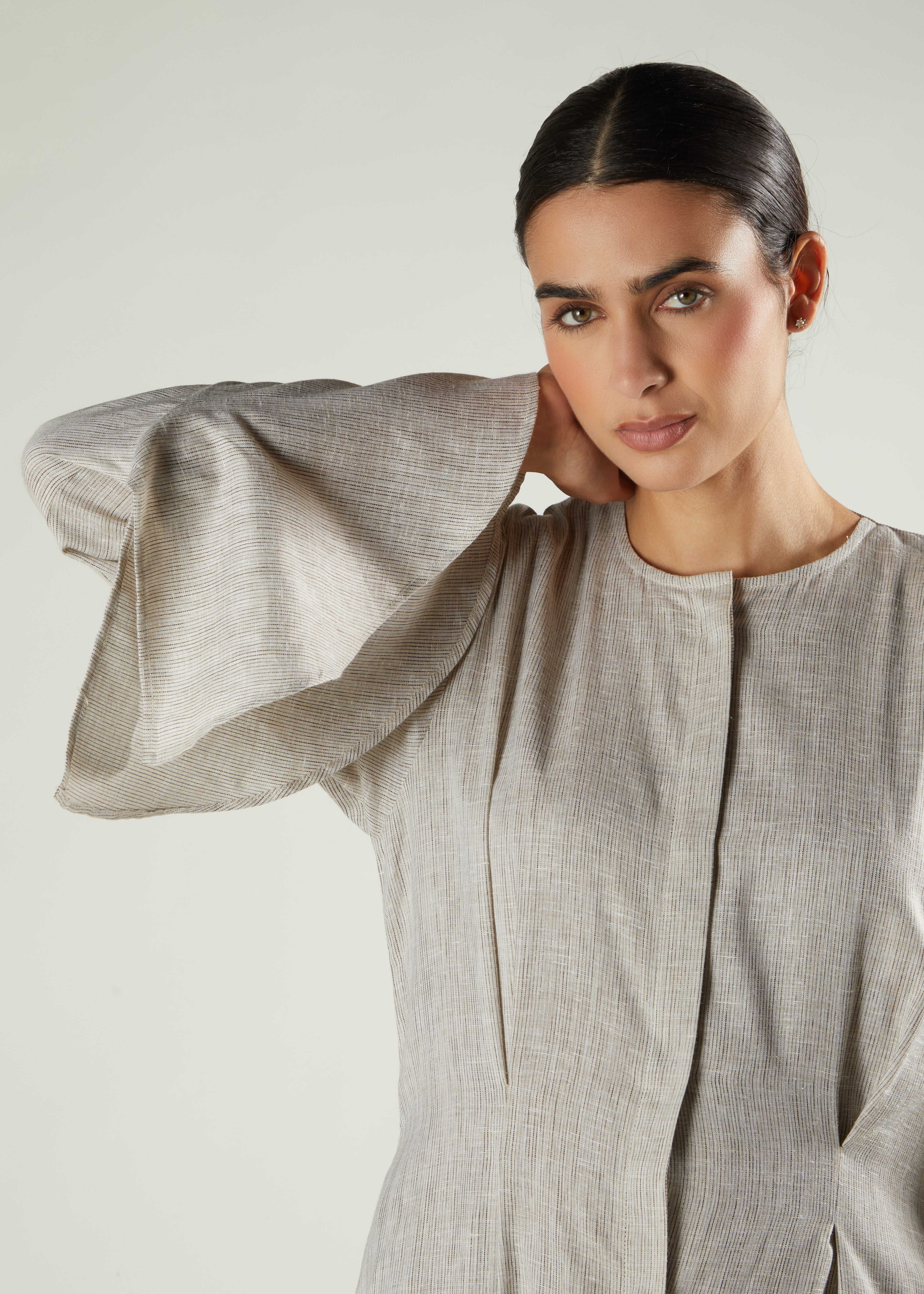 A contemporary take on timeless elegance, this garment is beautifully tailored to create a refined and effortless silhouette. Made from a soft, lightly textured fabric, it features subtle pleat detailing through the front and back that adds gentle structure and movement. The flared sleeves introduce a touch of modern femininity, while concealed fastening and side pockets provide a seamless finish. Understated yet sophisticated, this piece transitions effortlessly from day to evening.