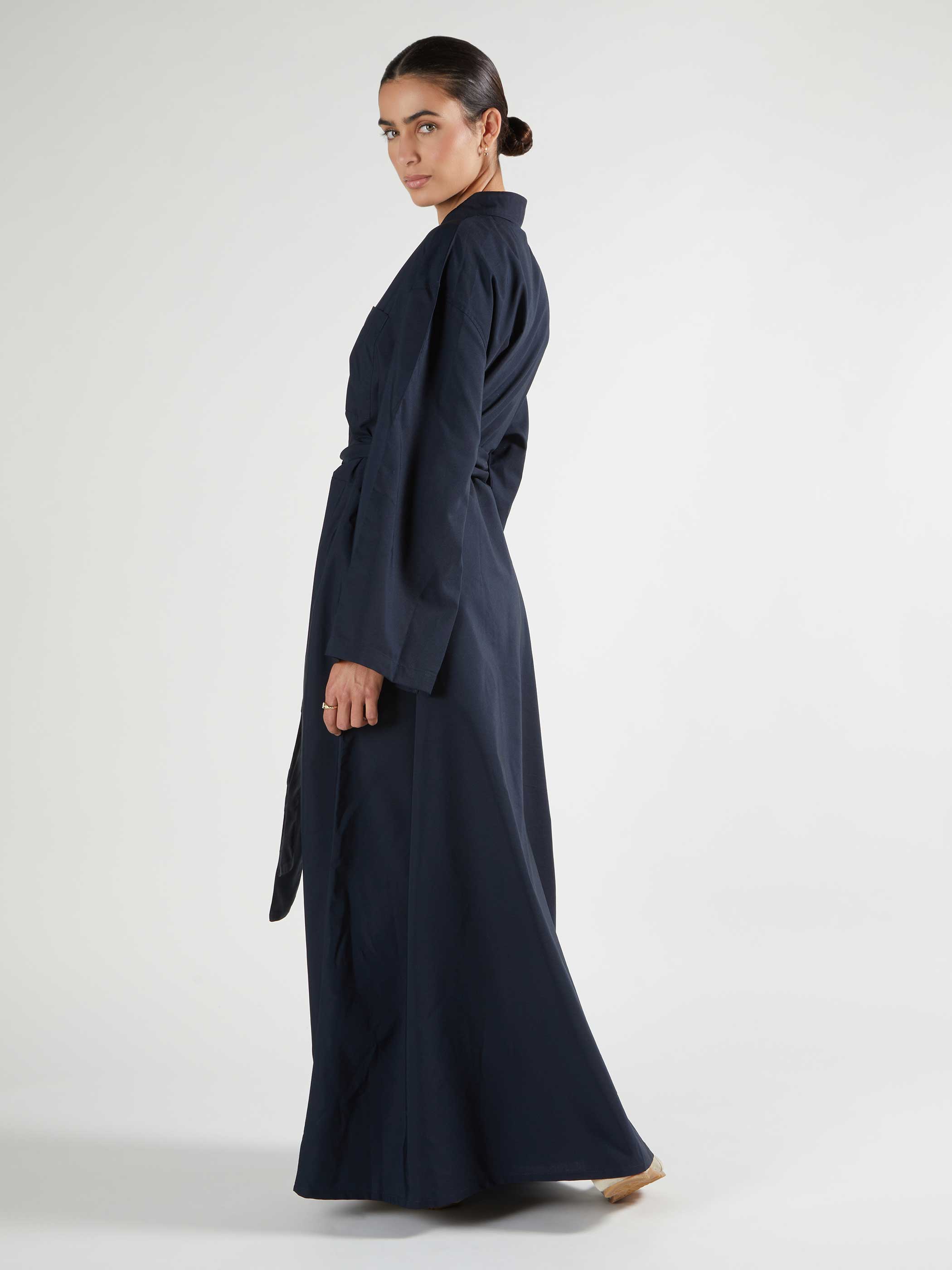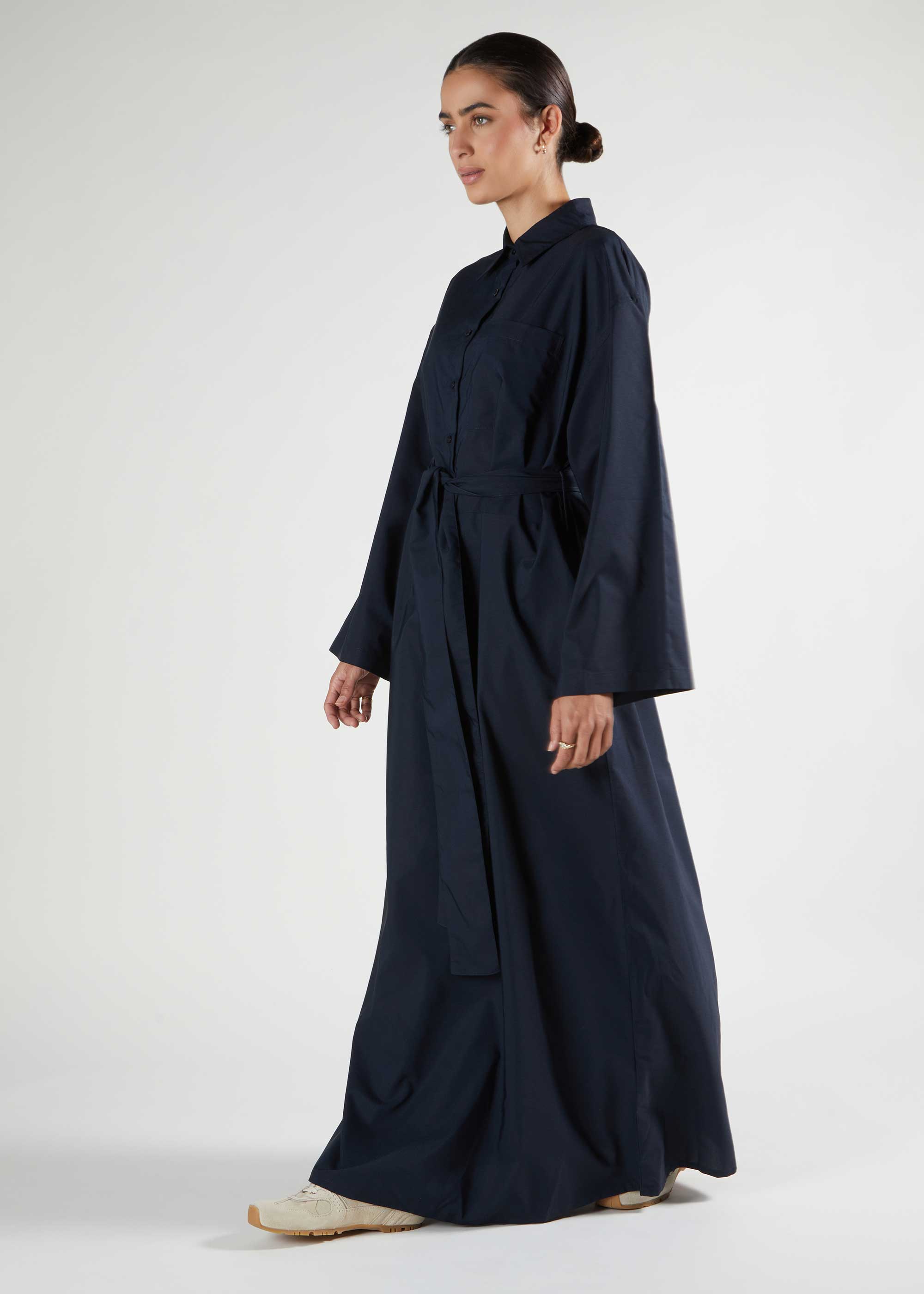 The Maxi features an oversized silhouette, adopting our timeless shirt-cut design now tailored for a relaxed fit. Rendered in a deep navy shade, it can be styled with the matching fabric belt or personalised with your own. Ideal for layering over knitwear during cooler months, it offers both comfort and versatility.