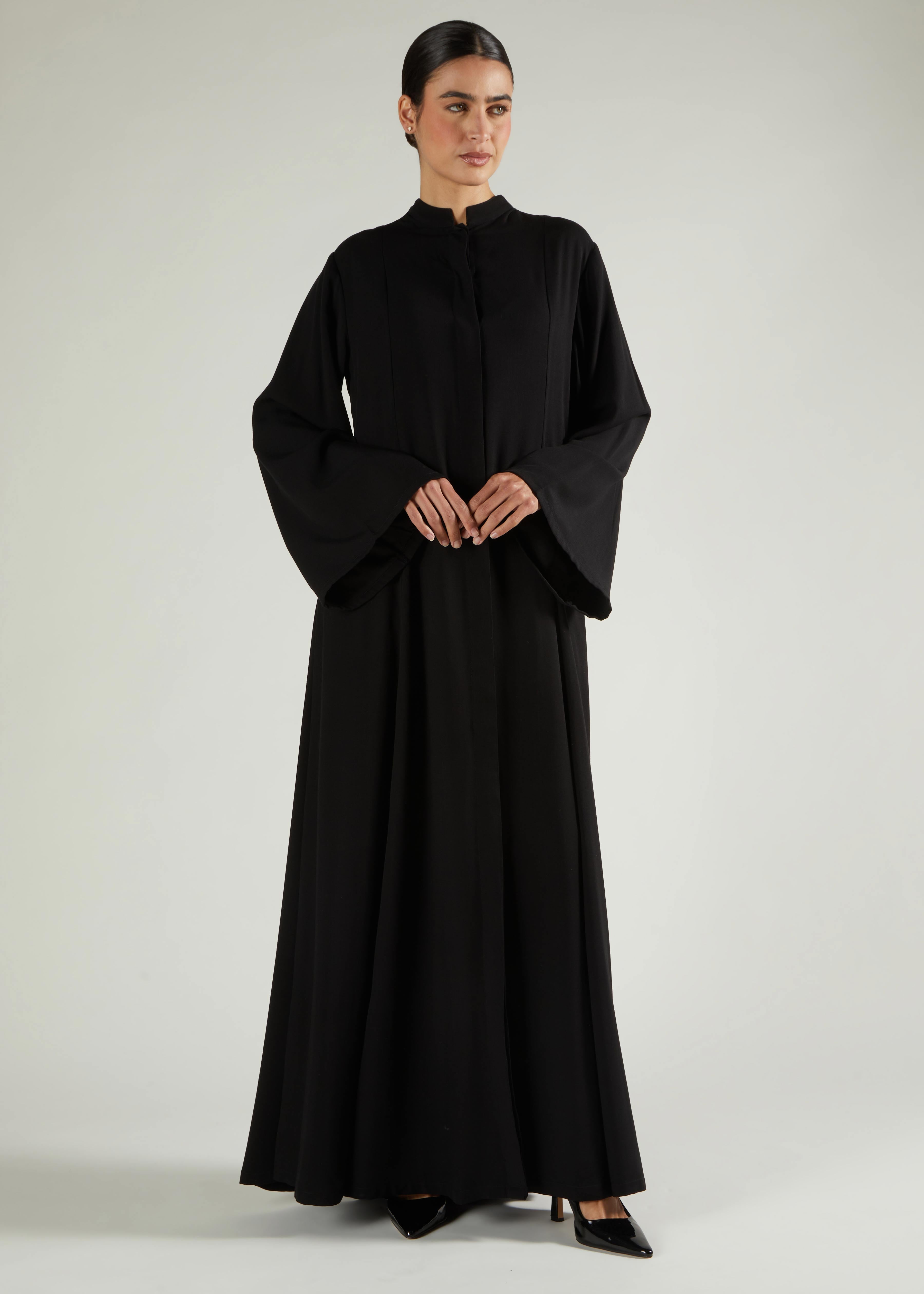 A timeless abaya that blends simplicity with sophistication. Designed with a flowing A-line silhouette and a structured stand collar, this piece offers a refined minimal look while ensuring all-day comfort. The concealed placket keeps the design sleek, and the discreet side pockets add a touch of practicality, making it a versatile staple for both everyday wear and special occasions.