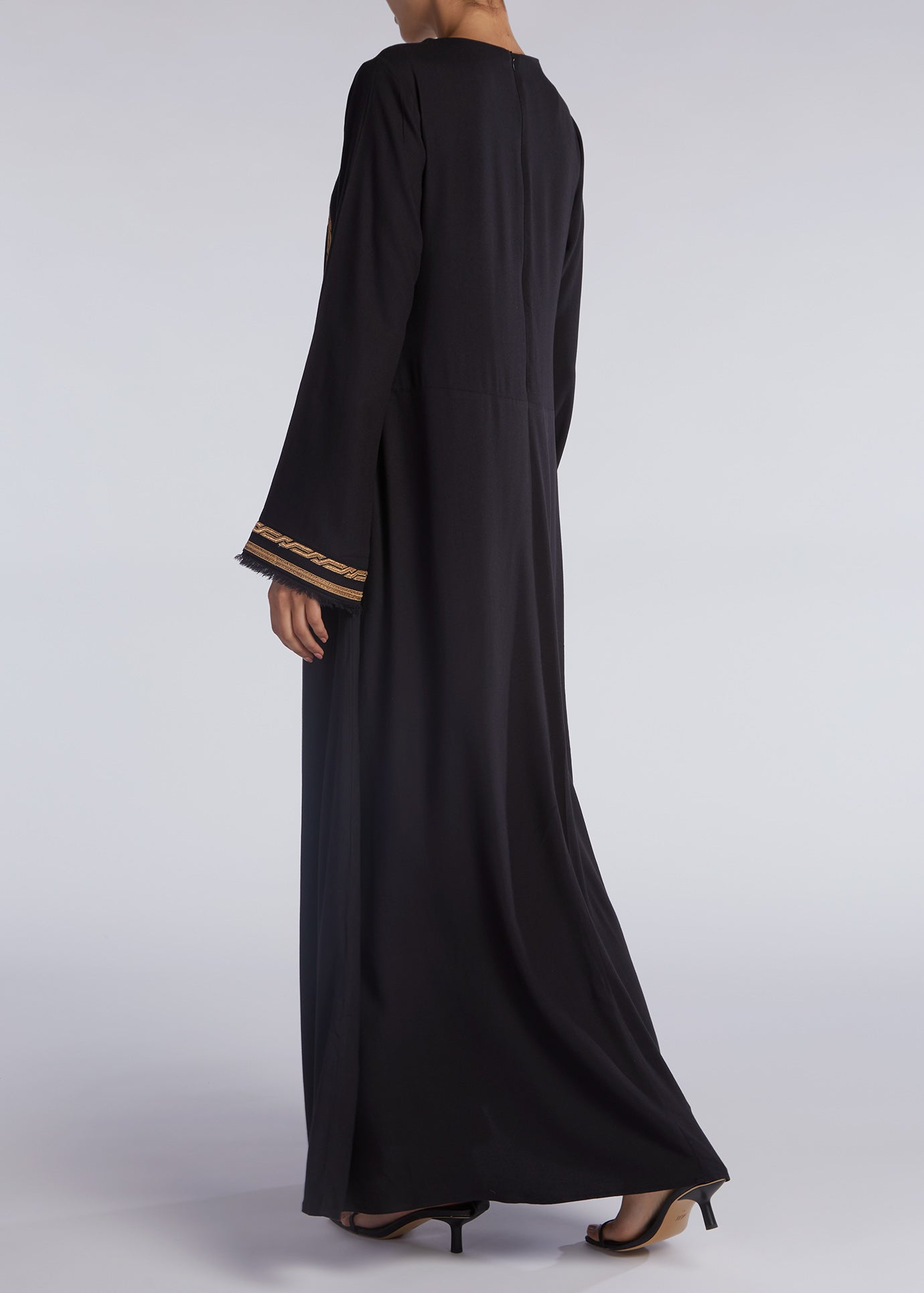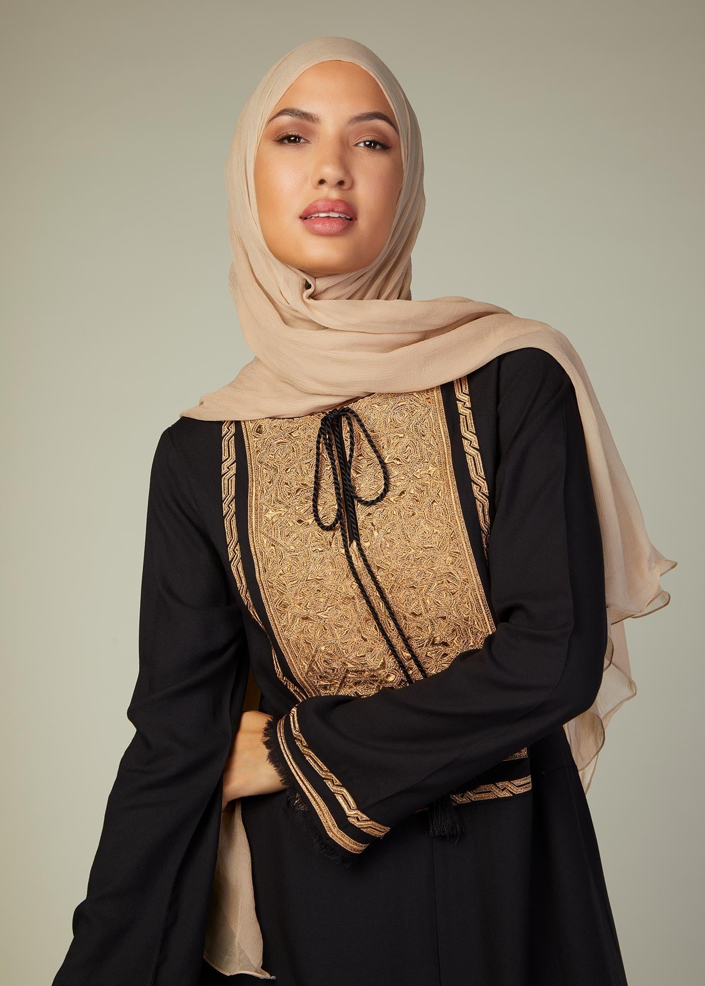 This elegant abaya features heavy detailed embroidery that has been inspired by our 'Mamluk Art Collection'. The bronze/gold embroidery has been meticulously embroidered to mimic the beautiful works of art made from ornate metals. The Abaya has frayed edges on the edge of the sleeves with a bronze neck drawcord as an added feature to add elegance to this stunning Abaya.