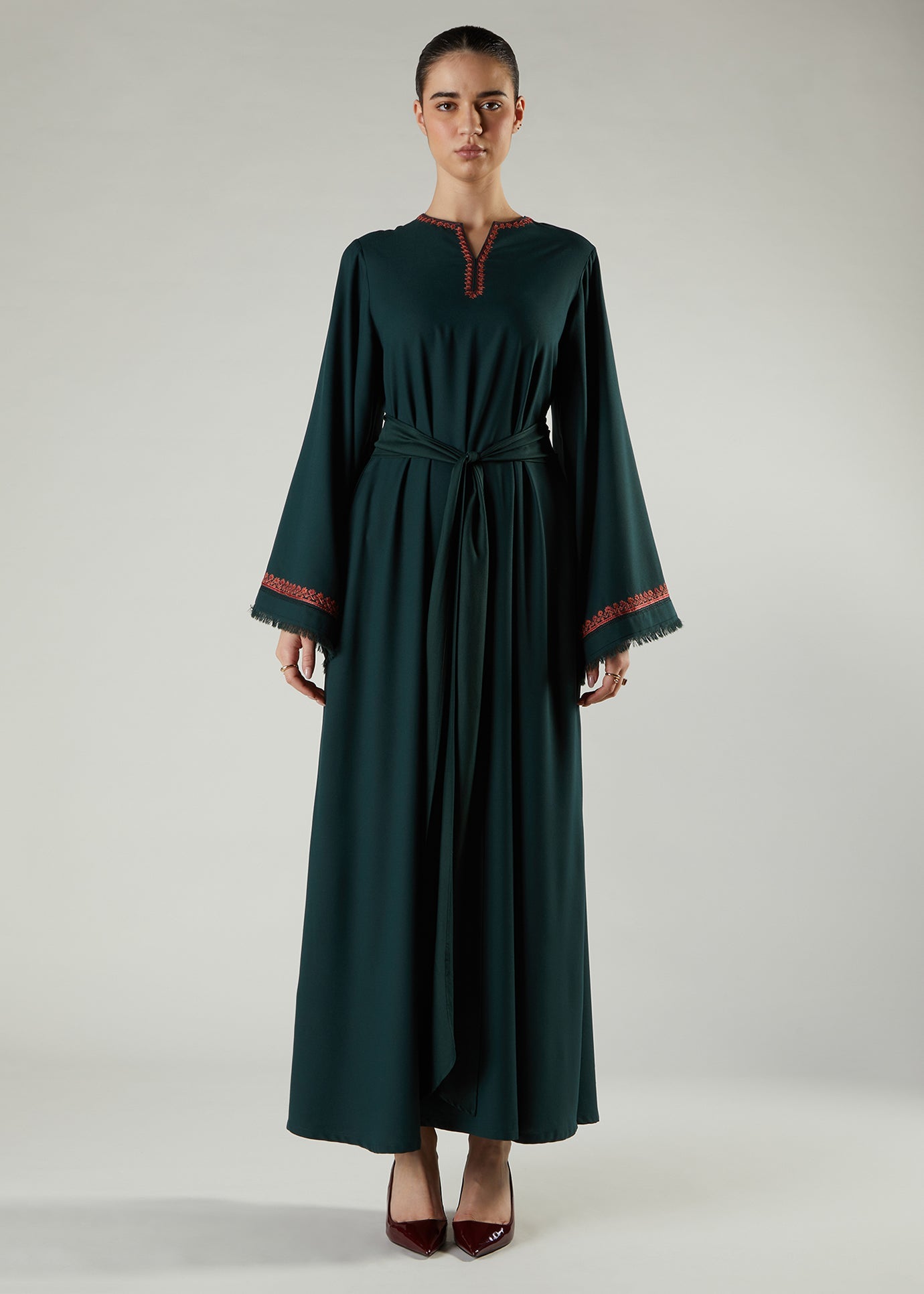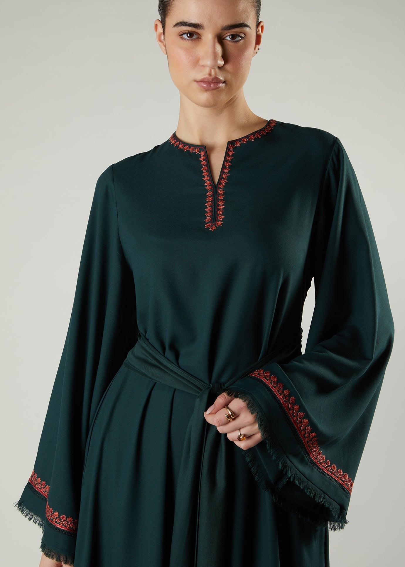 Abaya features floral Kashmiri inspired embroidery on the neckline and sleeves; a delicate row of bright saffron flowers adds a pop of colour against the deep green Abaya. Features flared style sleeves with a fringed edge for a dramatic finish to the garment.