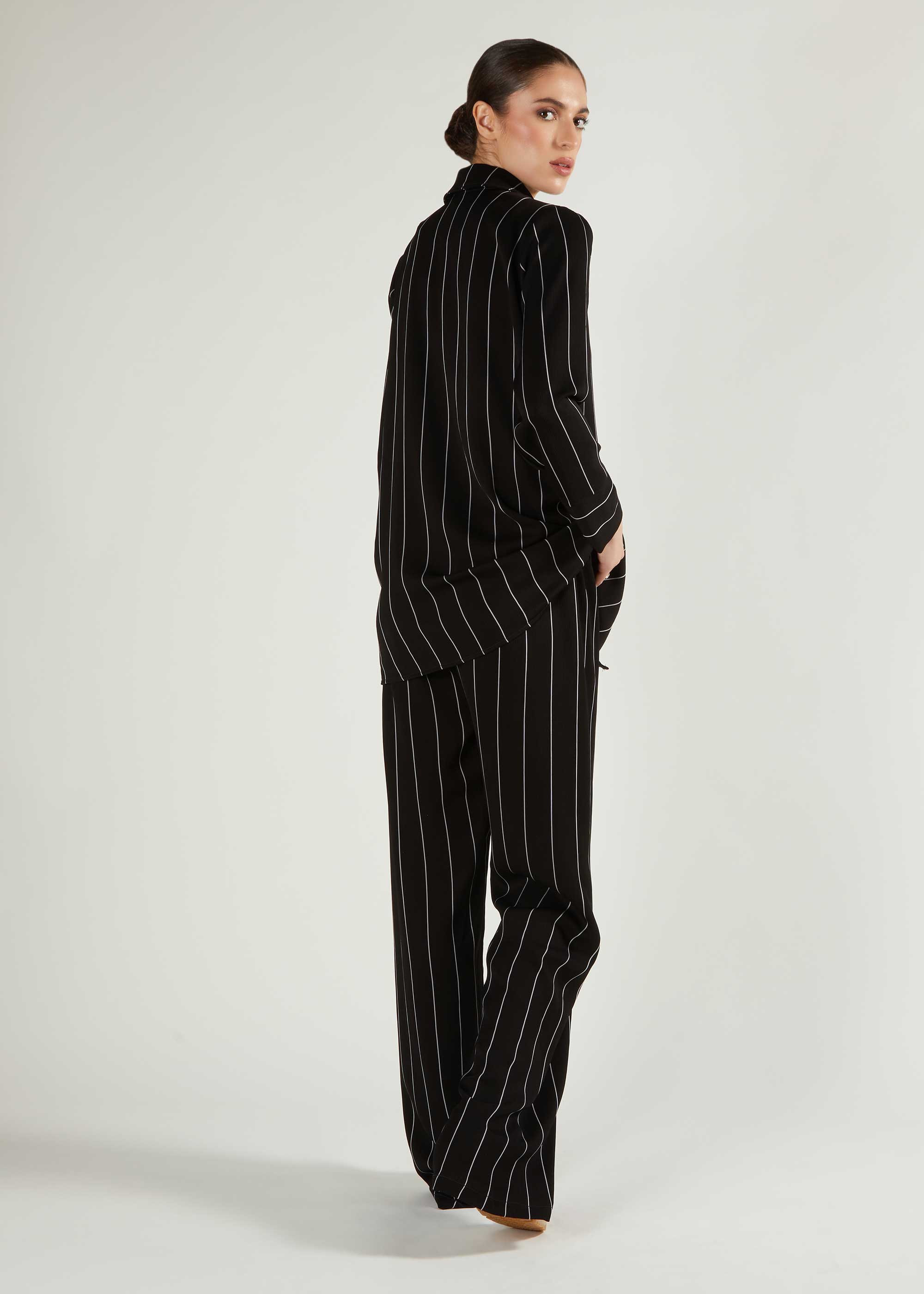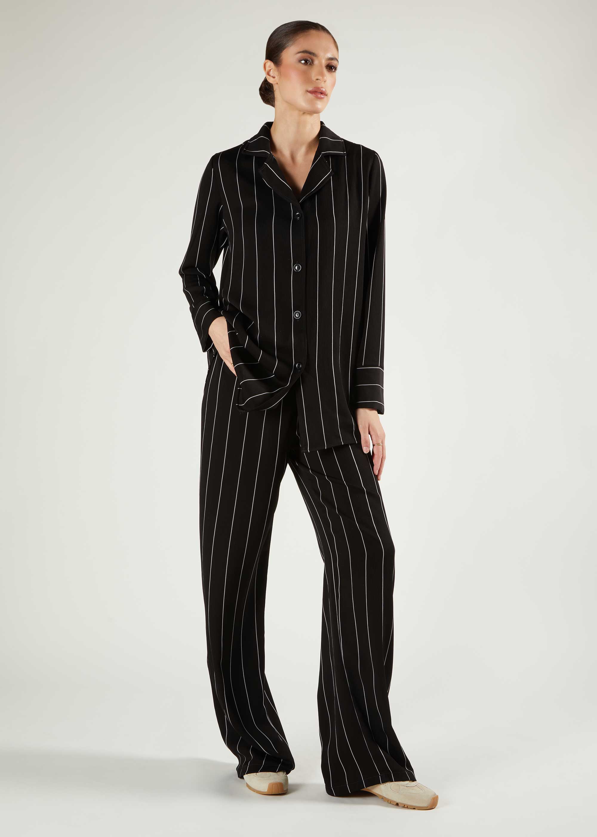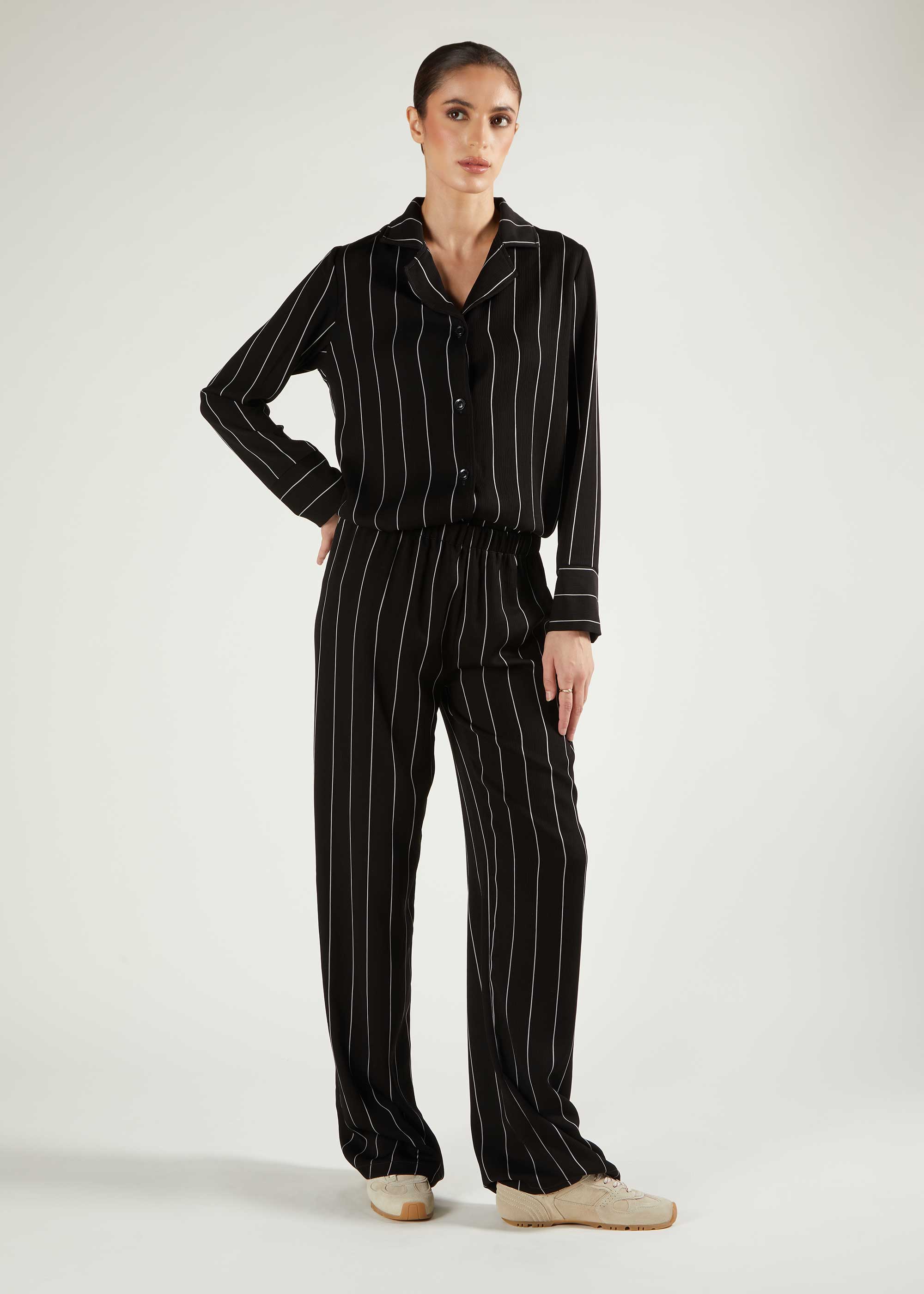 Pinstripe co-ord set with a soft, flattering fit. Features a modest top and straight-leg trousers with an elasticated waist. Perfect for casual yet smart styling.