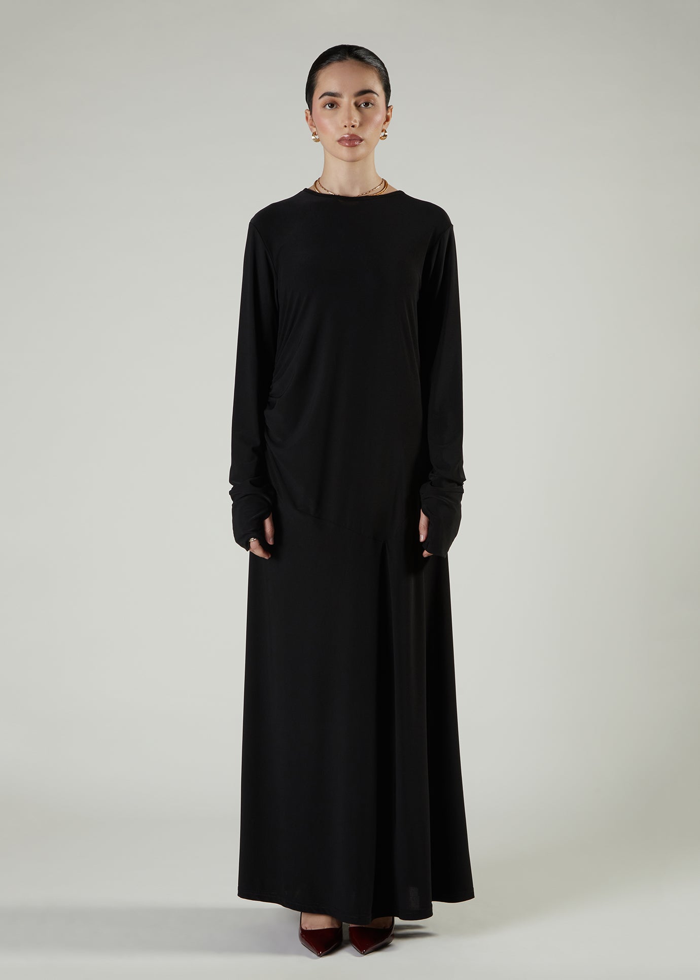 Maxi is made from a fluid stretchy fabric; it features light gathered detail on the side of the garment.