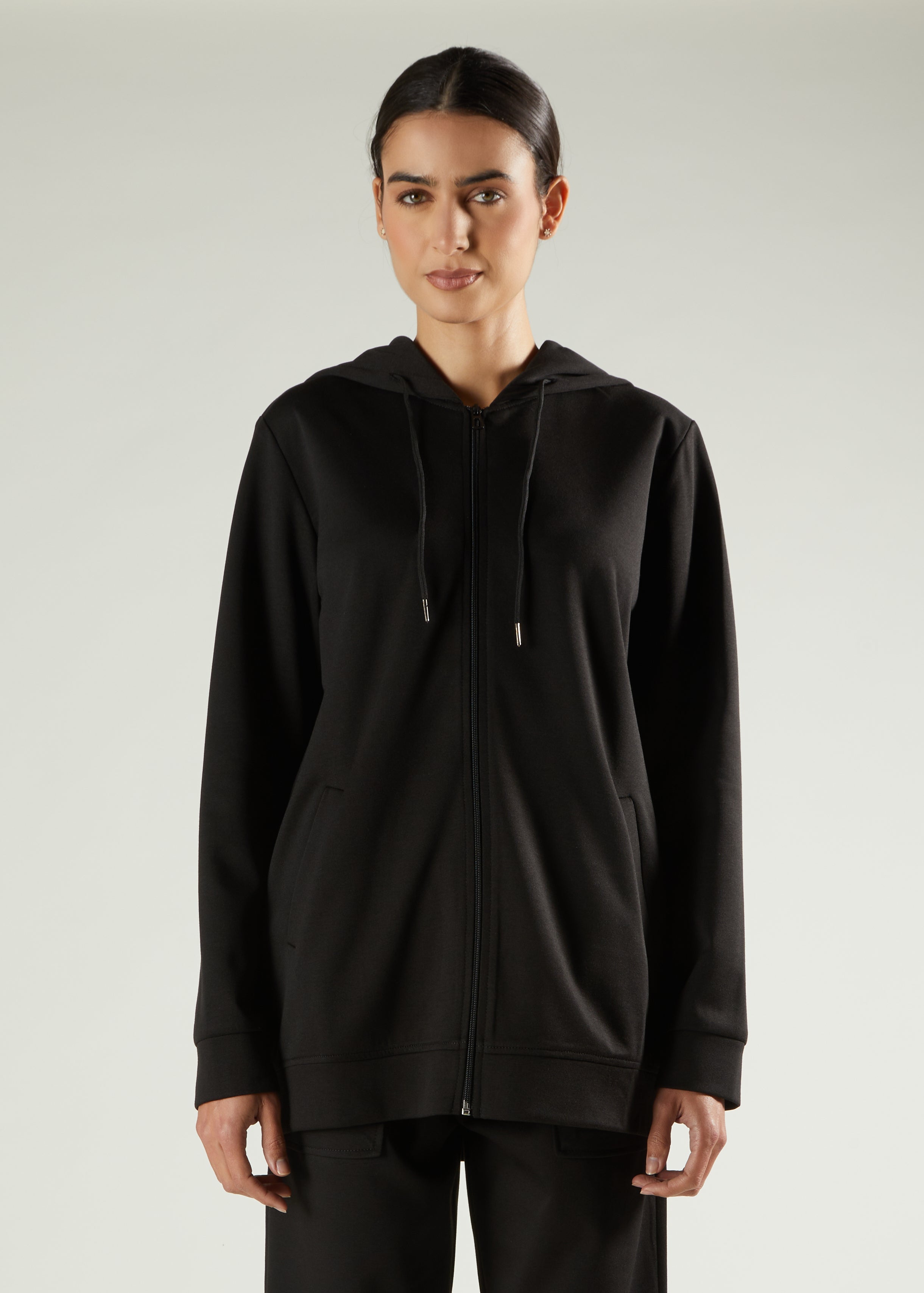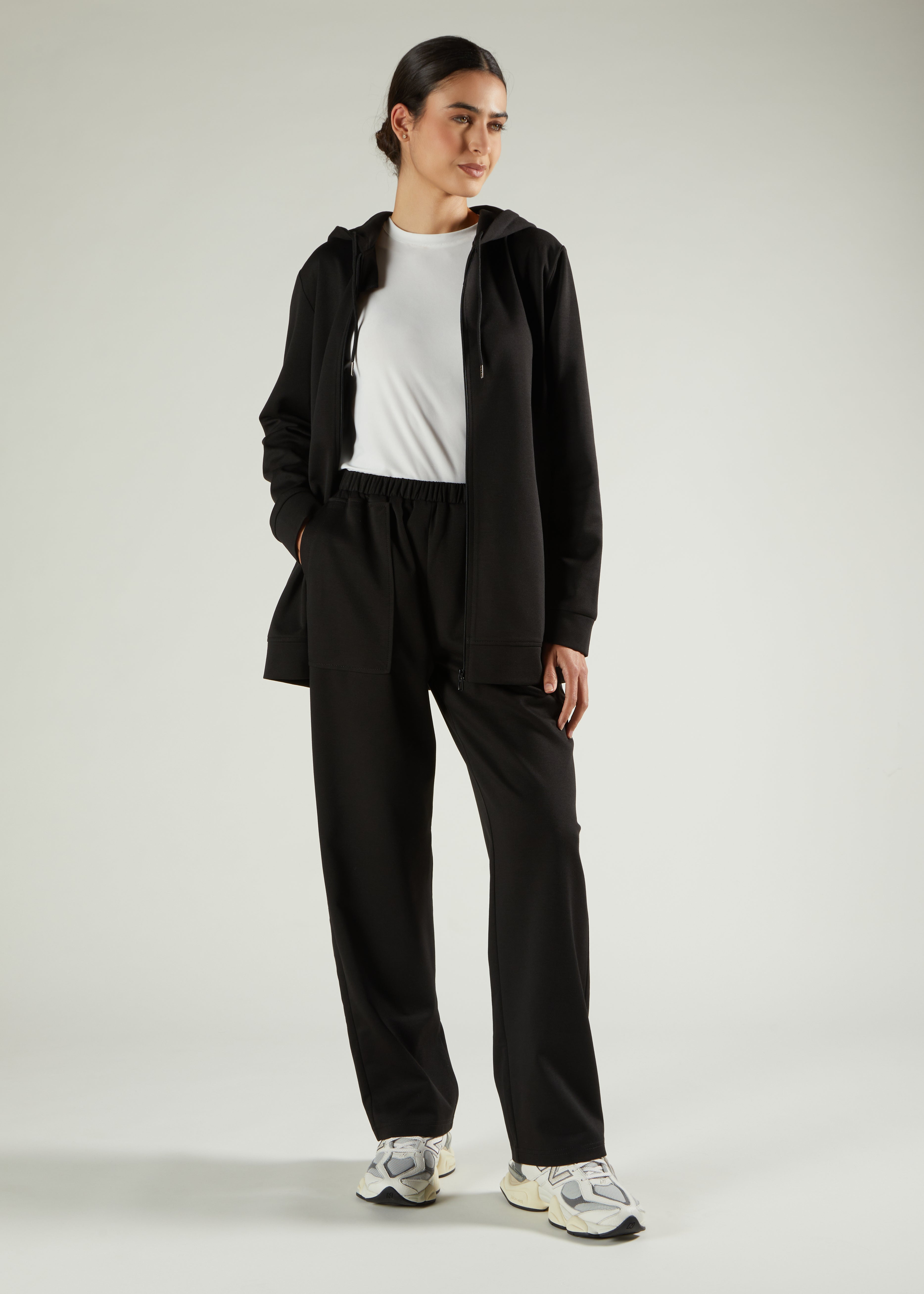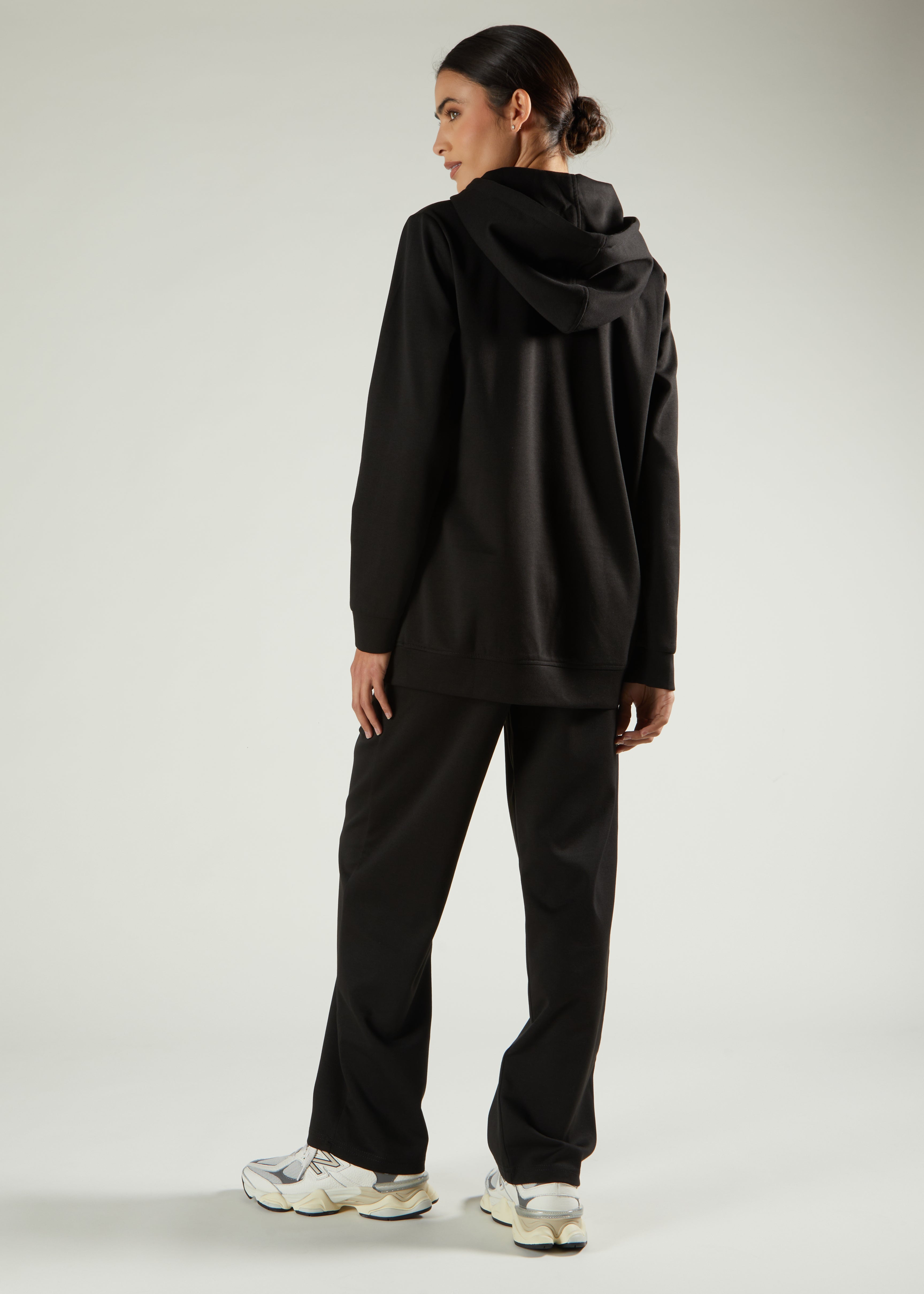This versatile mid-weight black hoody set combines practical design with everyday comfort. The bottoms feature a relaxed silhouette with functional front pockets, while the coordinating hoody offers modest proportions ideal for casual wear and athletic pursuits. Layer with our Second Skin collection to create a cohesive ensemble.
