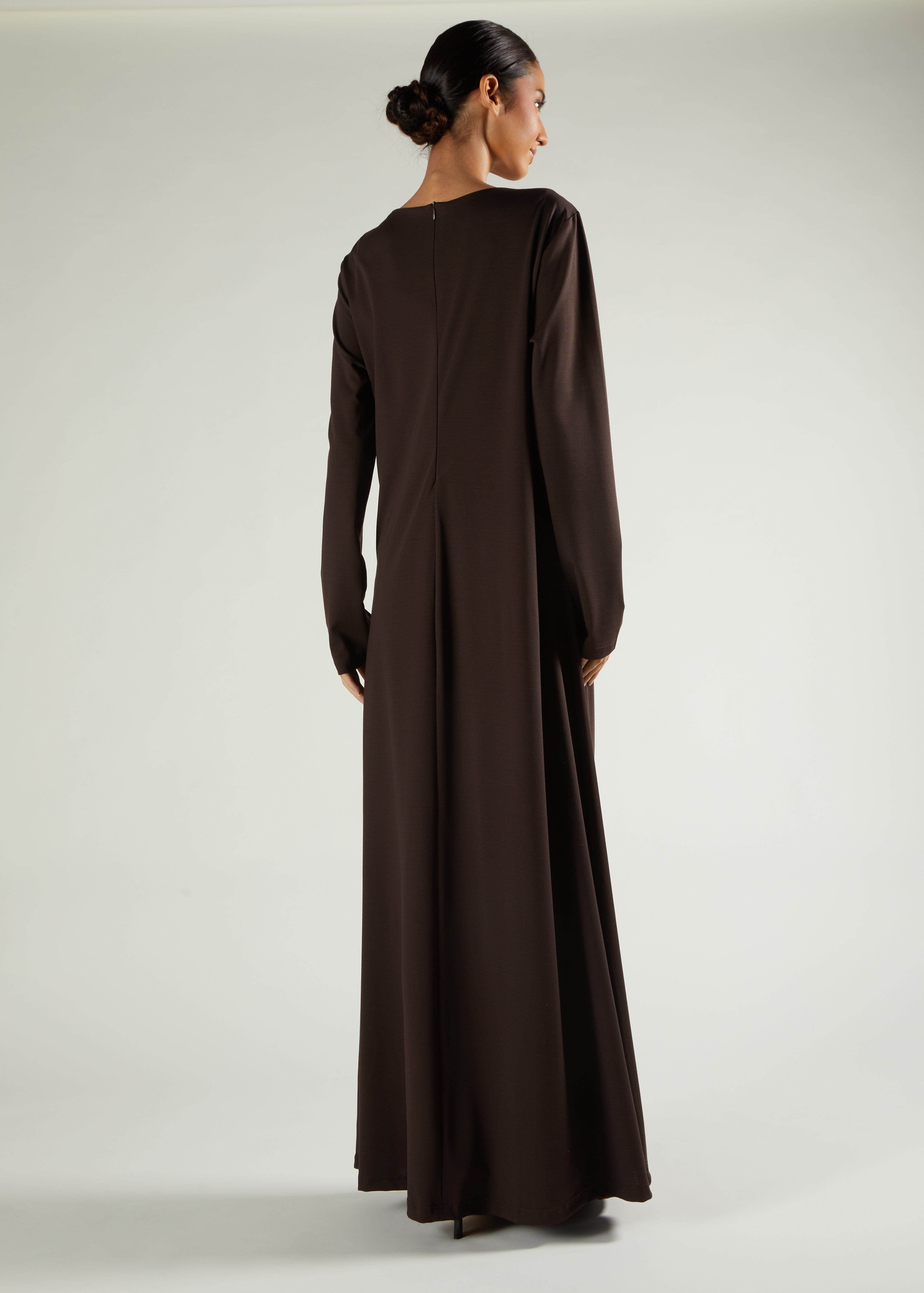 This abaya is designed for effortless style. Made from stretchy jersey fabric with a subtle side pleat, it's comfortable enough for everyday wear yet polished enough for evening occasions. The simple round neckline keeps things classic, and the hidden back zip makes it easy for access.