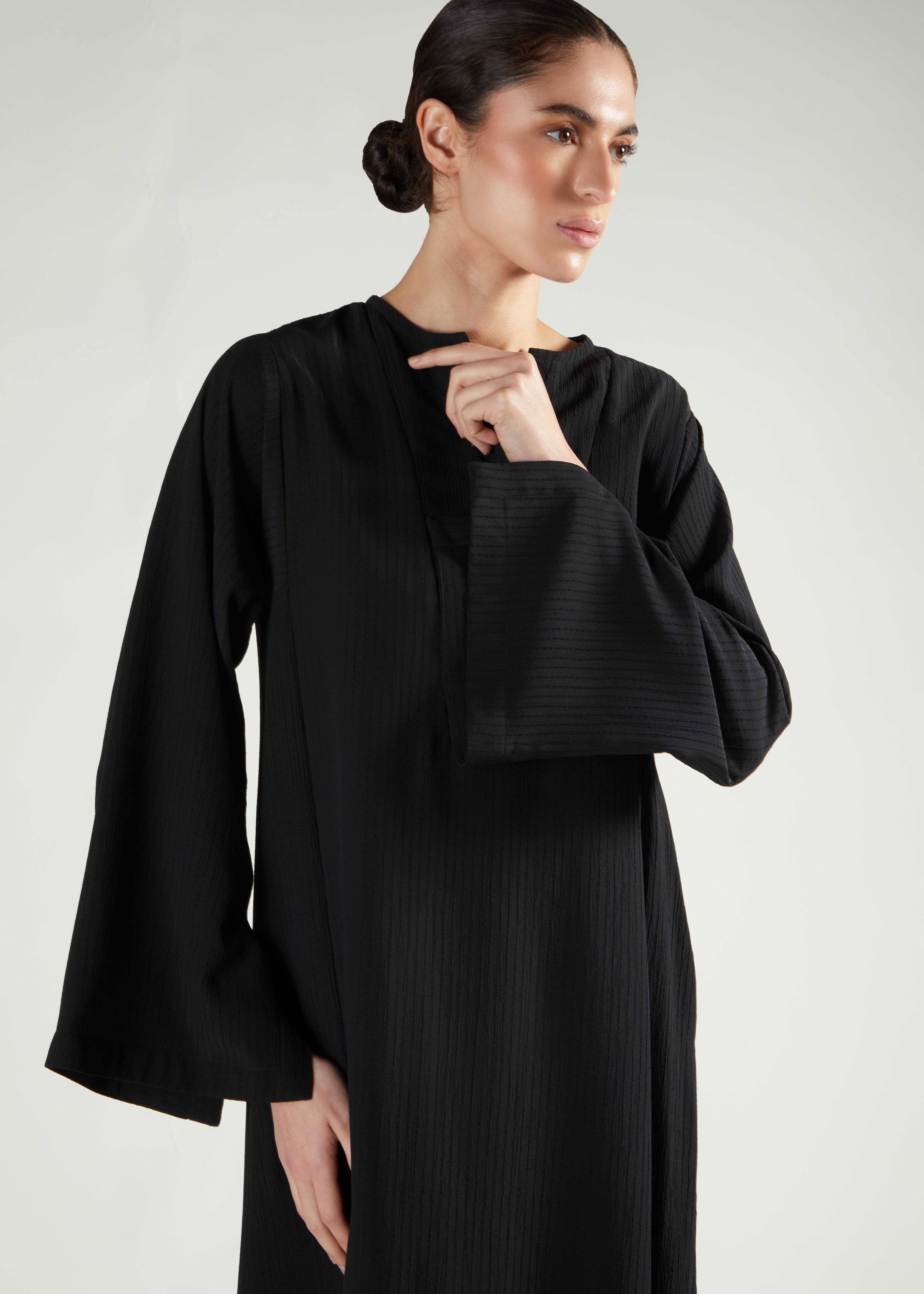 Made from textured chiffon fabric and fully lined, this Abaya has a modest A-line design with side slits and discreet front buttons. Ideal for formal events, it pairs elegantly with accent accessories and our Second Skin Leggings in Ebony for a refined look.