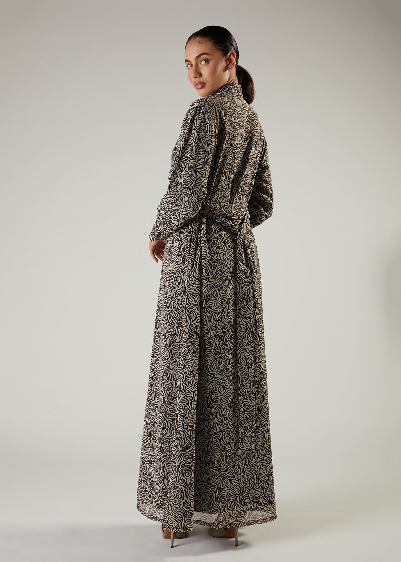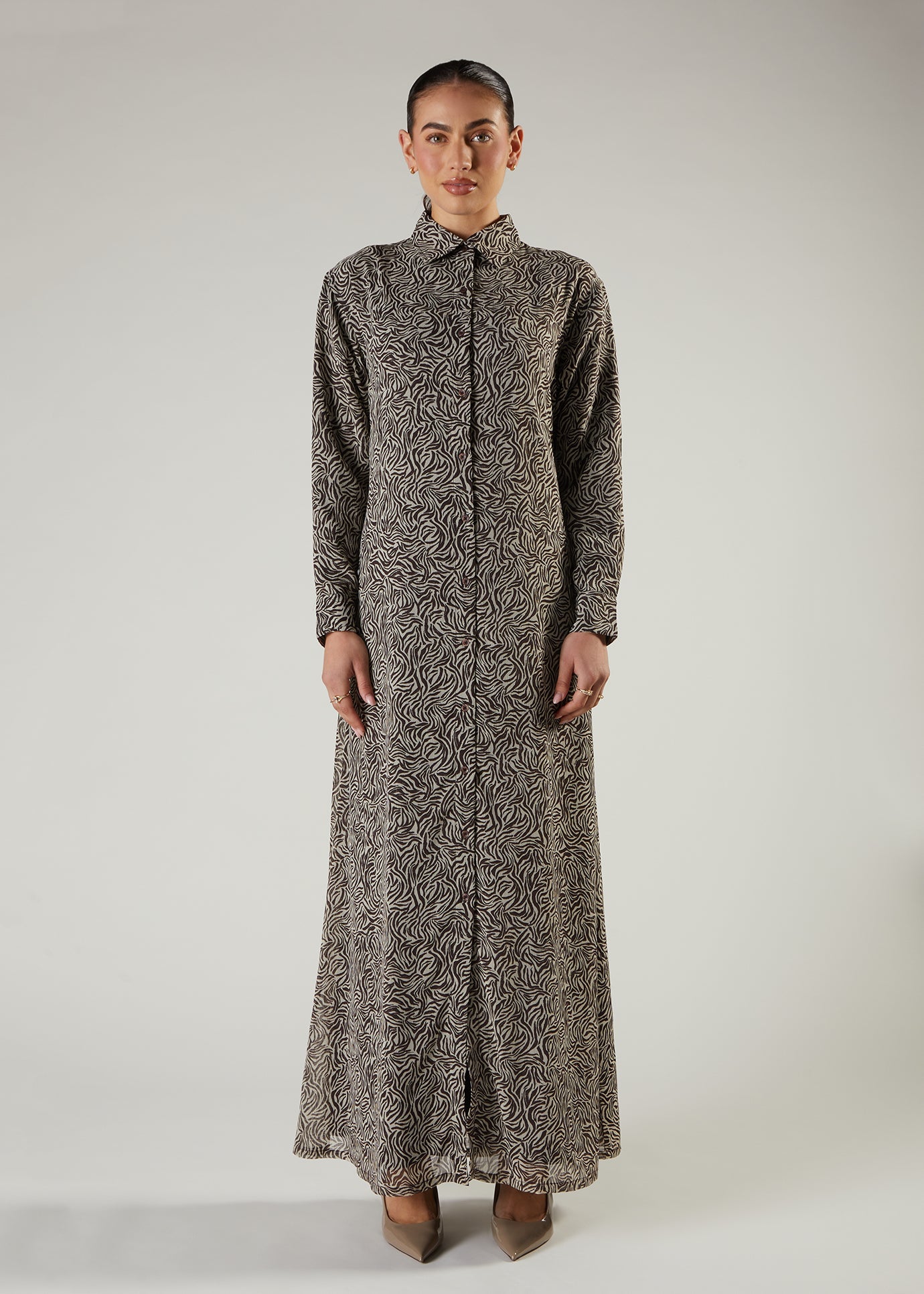 This A line silhouette printed maxi dress is fully lined and features standard collars, discreet side pockets, front button opening and a self-fabric belt. Made from a soft chiffon fabric.