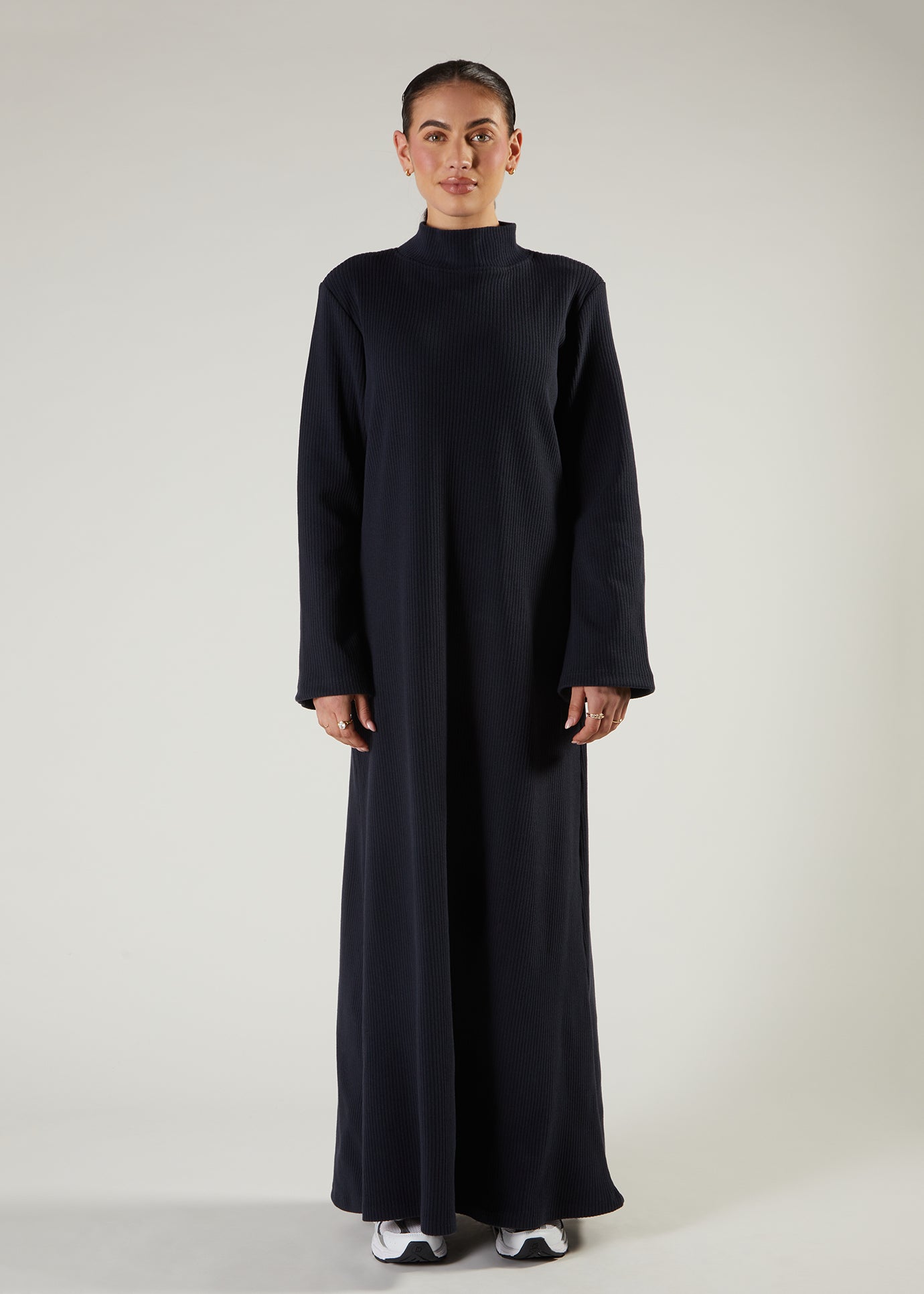 Discover versatility in our Turtle Neck Abaya, expertly designed in soft ribbed fabric that adapts beautifully to changing seasons. The elevated high neckline delivers timeless sophistication, while the gentle texture ensures all-day comfort without compromise. Perfect for transitional weather, this piece becomes even more striking when layered with our curated casual cover-ups, creating endless styling possibilities that elevate your modest wardrobe.