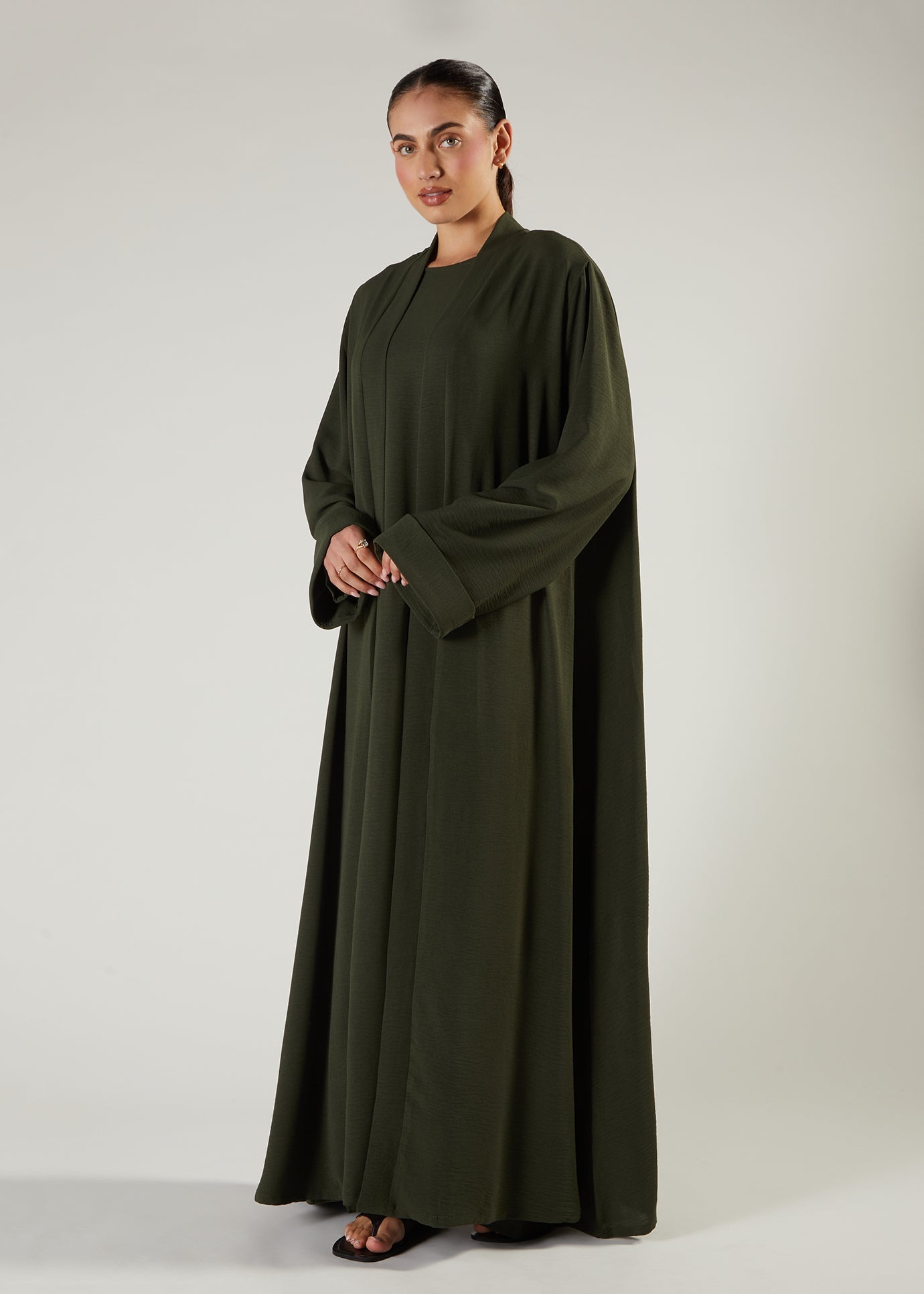 This elegant Two-Piece Open Abaya set includes a Full Sleeve matching slip. Perfect for everyday wear, it can also be dressed up with accessories for an evening look. The full sleeve slip dress can be worn as a maxi dress on its own or paired with the open abaya for a stylish ensemble.