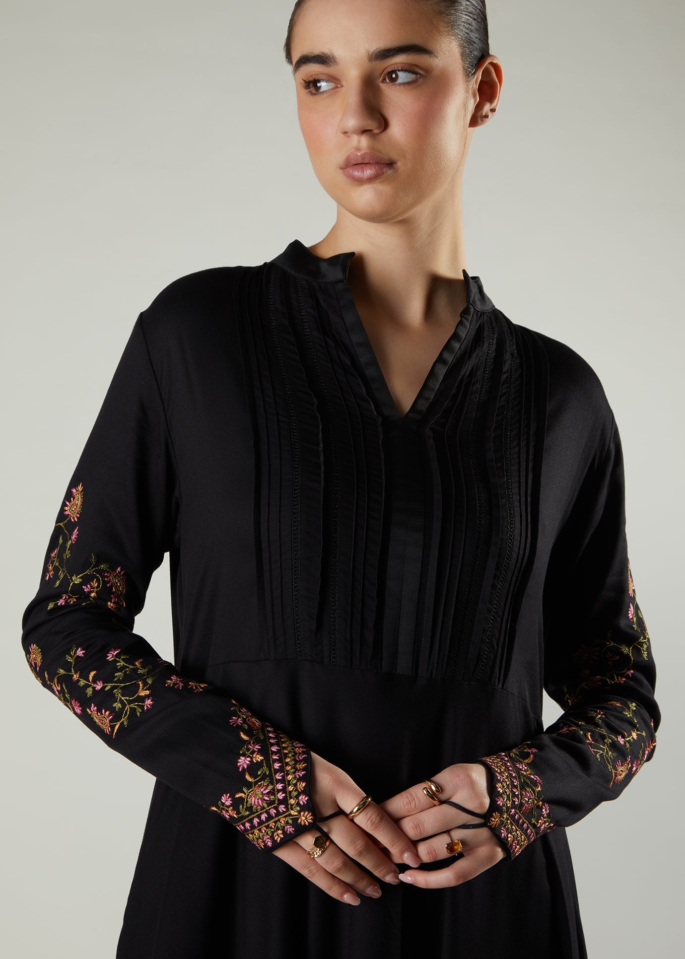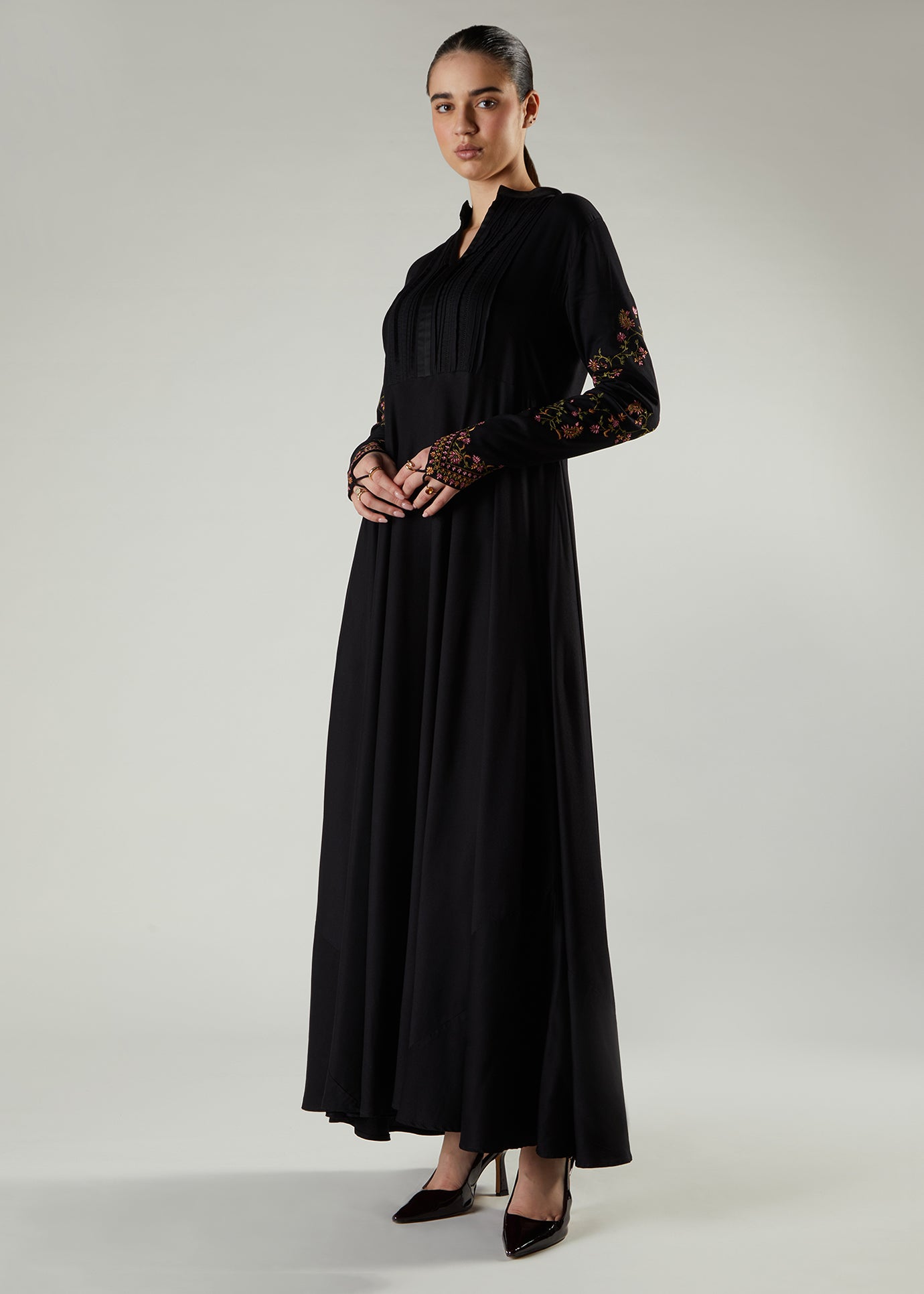 Zahra Abaya is made from a soft fluid twill fabric, features delicate floral embroidery on the sleeves as well as precision pleating on the bodice. Cut in a classic A line silhouette, this abaya features a slightly raised neckline with a V slit and functional discreet side pockets.